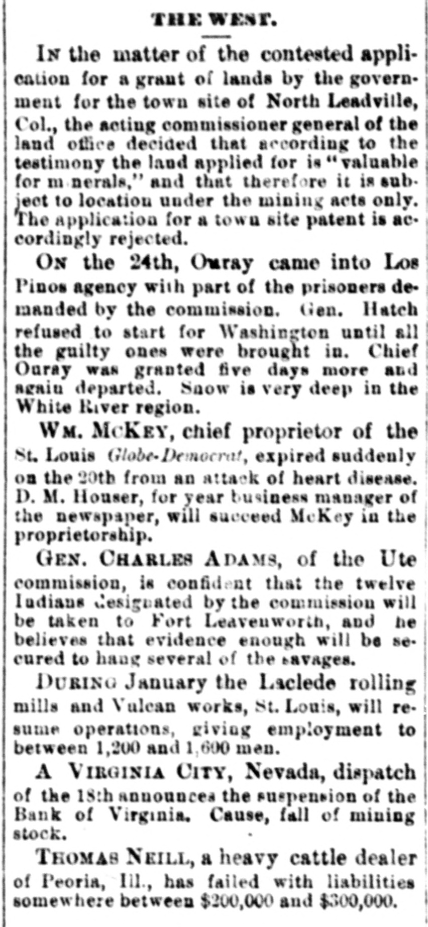 THE WEST. IN the matter of the contested application for a grant of lands by the government for the town site of North Leadville, Col., the acting commissioner general of the land office decided that according to the testimony the land applied for is "valuable for m nerals," and that therefore it is sub. ject to location under the mining acts only. The application for a town site patent is accordingly rejected. ON the 24th, Ouray came into Los Pinos agency with part of the prisoners demanded by the commission. Gen. Hatch refused to start for Washington until all the guilty ones were brought in. Chief Ouray was granted five days more and again departed. Snow is very deep in the White River region. WM. McKEY, chief proprietor of the St. Louis Globe-Democrat, expired suddenly on the 20th from an attack of heart disease. D. M. Houser, for year business manager of the newspaper, will succeed McKey in the proprietorship. GEN. CHARLES ADAMS, of the Ute commission, is confident that the twelve Indians designated by the commission will be taken to Fort Leavenworth, and he believes that evidence enough will be secured to hang several of the savages. DURING January the Laclede rolling mills and Valcan works, St. Louis, will resume operations, giving employment to between 1,200 and 1,600 men. A VIRGINIA CITY, Nevada, dispatch of the 18th announces the suspension of the Bank of Virginia. Cause, fall of mining stock. THOMAS NEILL, a heavy cattle dealer of Peoria, III, has failed with liabilities somewhere between $200,000 and $300,000.