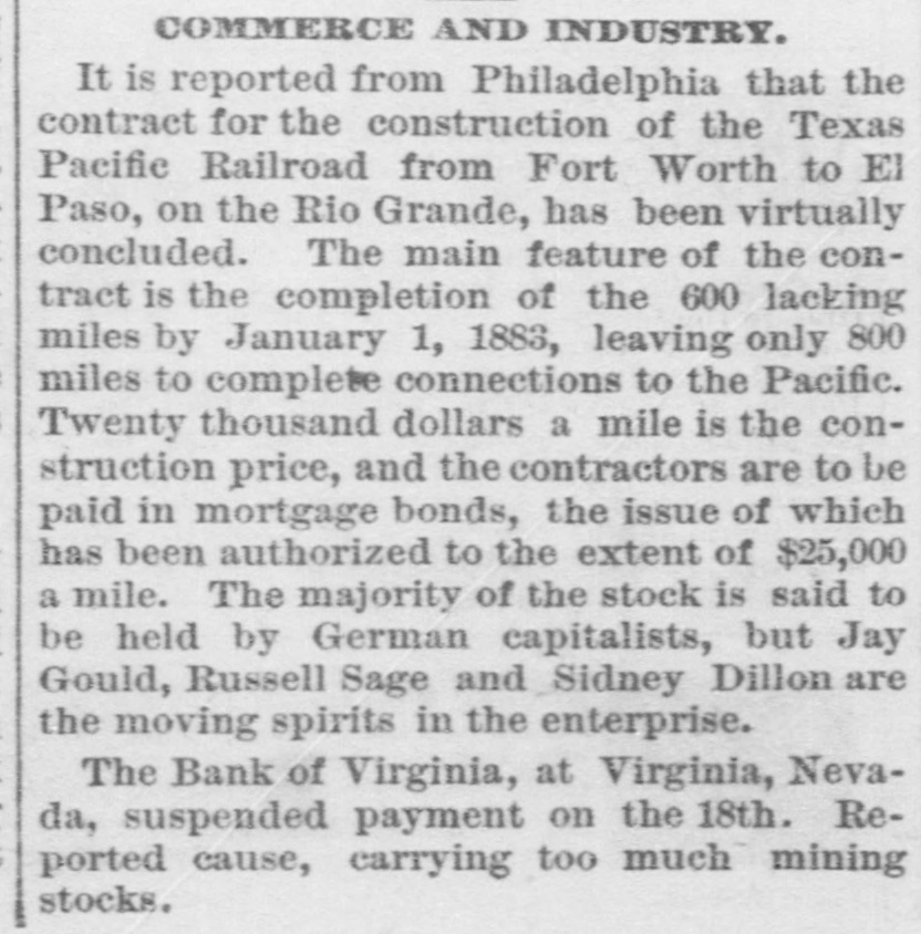 COMMERCE AND INDUSTRY. It is reported from Philadelphia that the contract for the construction of the Texas Pacific Railroad from Fort Worth to El Paso, on the Rio Grande, has been virtually concluded. The main feature of the contract is the completion of the 600 lacking miles by January 1, 1883, leaving only 800 miles to complete connections to the Pacific. Twenty thousand dollars a mile is the construction price, and the contractors are to be paid in mortgage bonds, the issue of which has been authorized to the extent of $25,000 a mile. The majority of the stock is said to be held by German capitalists, but Jay Gould, Russell Sage and Sidney Dillon are the moving spirits in the enterprise. The Bank of Virginia, at Virginia, Nevada, suspended payment on the 18th. Reported cause, carrying too much mining stocks.