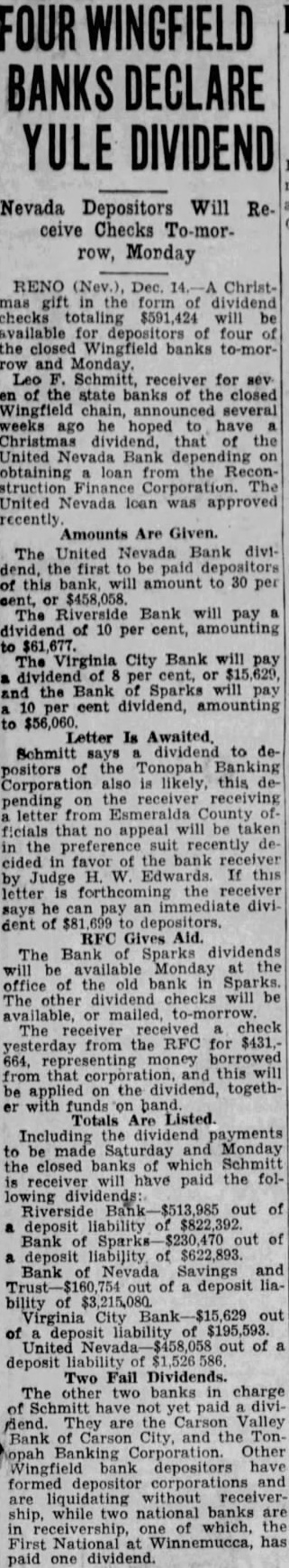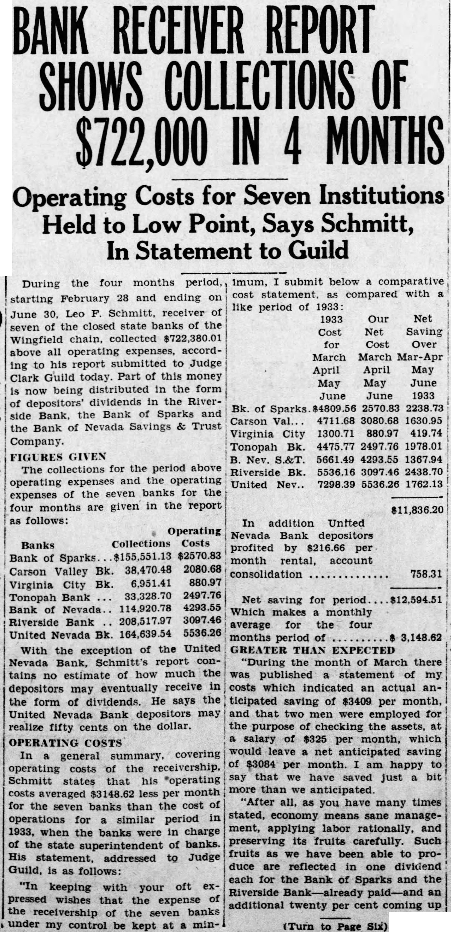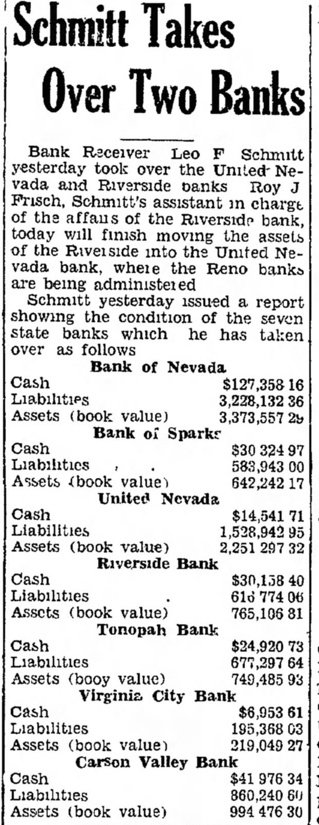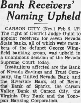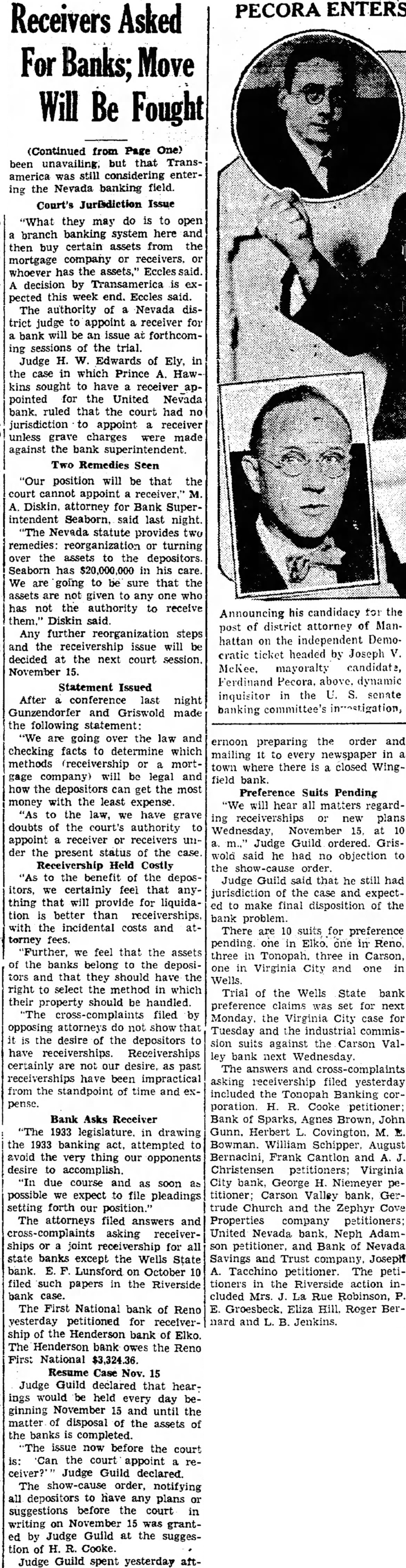 Receivers Asked For Banks; Move Will Be Fought (Continued from Page One) been unavailing. but that Transamerica was still considering entering the Nevada banking field. Court's Jurisdiction Issue "What they may do is to open branch banking system here and then buy certain assets from the mortgage company or receivers. or whoever has the assets," Eccles said. A decision by Transamerica is expected this week end. Eccles said. The authority of a Nevada district judge to appoint a receiver for a bank will be an issue at forthcoming sessions of the trial. Judge H. W. Edwards of Ely, in the case in which Prince A. Hawkins sought to have a receiver appointed for the United Nevada bank. ruled that the court had no jurisdiction to appoint a receiver unless grave charges were made against the bank superintendent Two Remedies Seen "Our position will be that the court cannot appoint a receiver," M. A. Diskin, attorney for Bank Superintendent Seaborn, said last night. "The Nevada statute provides two remedies: reorganization or turning over the assets to the depositors. Seaborn has $20,000,000 in his care. We are going to be sure that the assets are not given to any one who has not the authority to receive them." Diskin said. Any further reorganization steps and the receivership issue will be decided at the next court session. November 15. Statement Issued After a conference last night Gunzendorfer and Griswold made the following statement: "We are going over the law and checking facts to determine which methods (receivership or a mortgage company) will be legal and how depositors can get the most money with the least expense. "As to the law, we have grave doubts of the court's authority to appoint a receiver or receivers under the present status of the case. Receivership Held Costly "As to the benefit of the depositors, we certainly feel that anything that will provide for liquidation is better than receiverships, with the incidental costs and attorney fees. "Further, we feel that the assets of the banks belong to the depositors and that they should have the right to select the method in which their property should be handled. "The cross-complaints filed by opposing attorneys do not show that it is the desire of the depositors to have receiverships. Receiverships certainly are not our desire, as past receiverships have been impractical from the standpoint of time and expense. Bank Asks Receiver "The 1933 legislature. in drawing the 1933 banking act. attempted to avoid the very thing our opponents desire to accomplish. "In due course and as soon as possible we expect to file pleadings setting forth our position." The attorneys filed answers and cross-complaints asking receiverships or a joint receivership for all state banks except the Wells State bank. E. F. Lunsford on October 10 filed such papers in the Riverside bank case. The First National bank of Reno vesterday petitioned for receivership the Henderson bank of Elko. The Henderson bank owes the Reno First National $3,324.36. Resume Case Nov. 15 Judge Guild declared that hearings would be held every day beginning November 15 and until the matter of disposal of the assets of the banks is completed. The issue now before the court is: Can the court appoint a receiver?" Judge Guild declared. The show-cause order, notifying all depositors to have any plans or suggestions before the court in writing on November 15 was granted by Judge Guild at the suggestion of H. R. Cooke. Judge Guild spent yesterday aft- ernoon preparing the order and mailing It to every newspaper in a town where there is a closed Wingfield bank. Preference Suits Pending "We will hear all matters regarding receiverships or new plans Wednesday, November 15. at 10 a. Judge Guild ordered. Griswold said he had no objection to the show-cause order. Judge Guild said that he still had jurisdiction of the case and expected to make final disposition of the bank problem. There are 10 suits for preference pending. one in Elko. one in Reno, three in Tonopah. three in Carson, one in Virginia City and one in Wells. Trial of the Wells State bank preference claims was set for next Monday. the Virginia City case for Tuesday and the industrial commission suits against the Carson Valley bank next Wednesday. The answers and cross-complaints asking receivership filed yesterday included the Tonopah Banking corporation. H. R. Cooke petitioner; Bank of Sparks, Agnes Brown, John Gunn. Herbert L. Covington, M. E. Bowman. William Schipper, August Bernacini, Frank Cantlon and A. J. Christensen petitioners; Virginia City bank, George H. Niemeyer petitioner; Carson Valley bank. Gertrude Church and the Zephyr Cove Properties company petitioners; United Nevada bank, Neph Adamson petitioner, and Bank of Nevada Savings and Trust company. Joseph A. Tacchino petitioner. The petitioners in the Riverside action included Mrs. J. La Rue Robinson, P. E. Groesbeck. Eliza Hill, Roger Bernard and L. B. Jenkins.