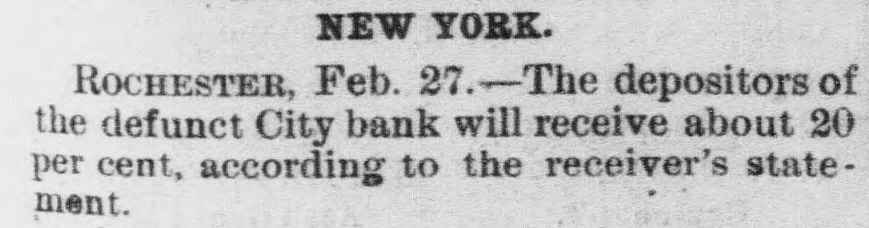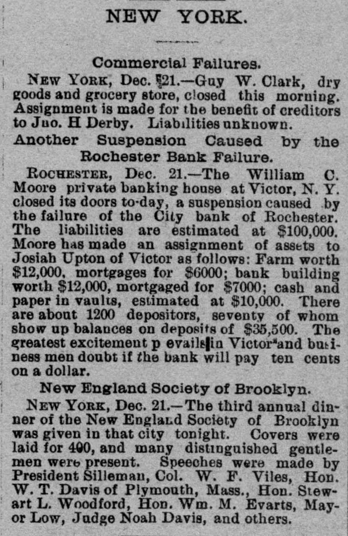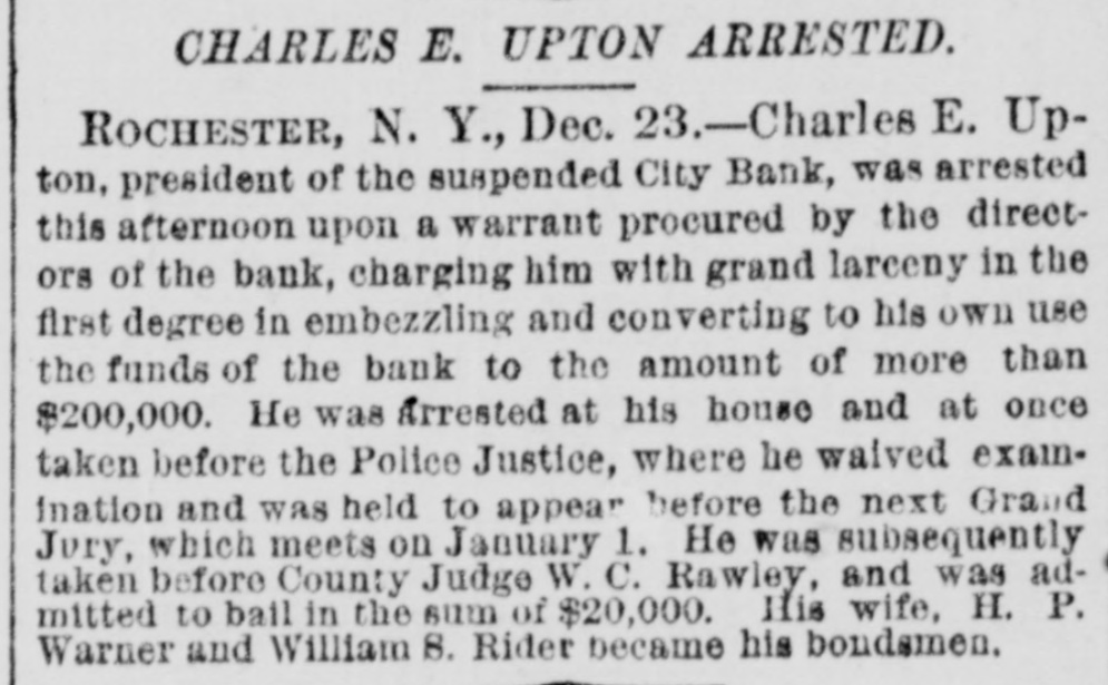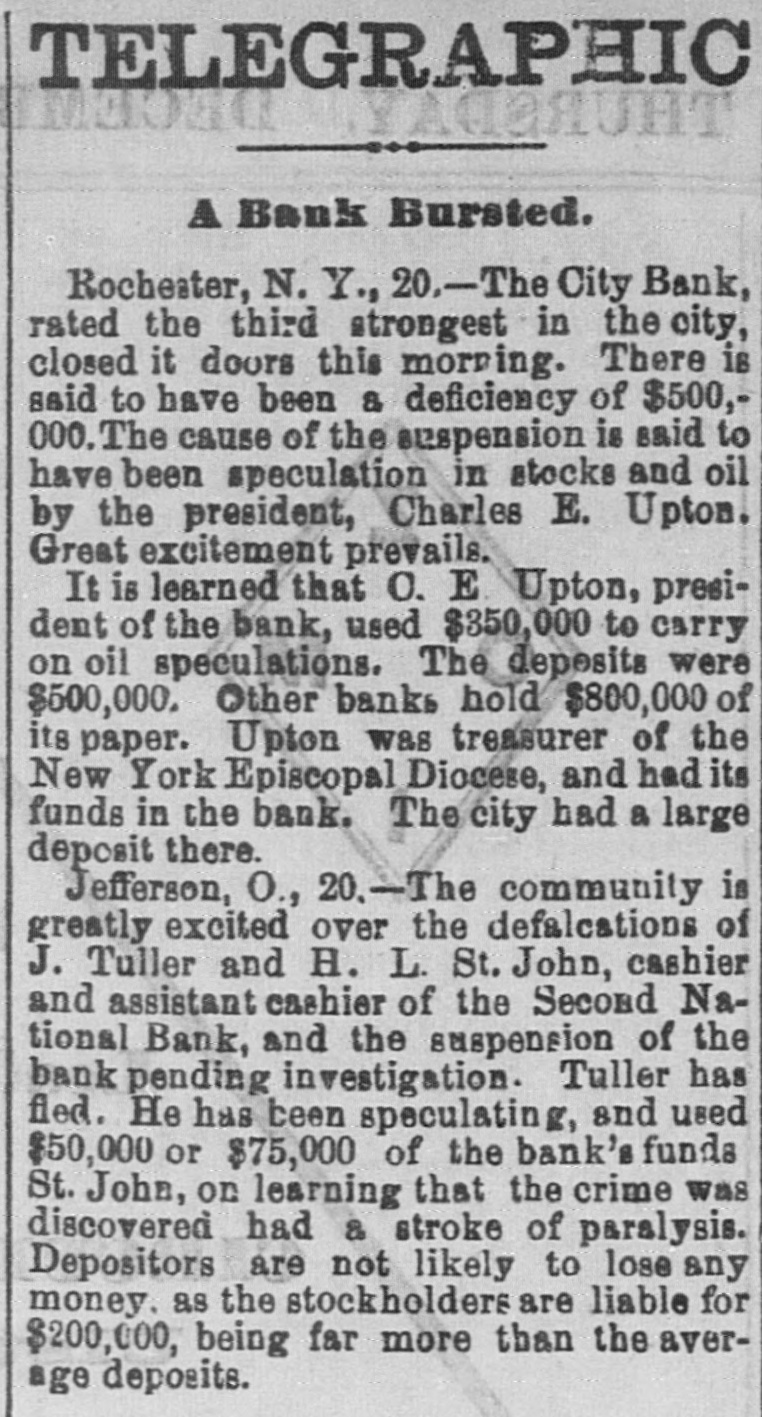 RUIN. GREASED The City Bank of Rochester, N.Y., Compelled to Close Its Doors. The Funds Used by Its Oil Truly Good President in Heavy Speculations. Something Like $330,000 Missing, Yet. and the Returns Not All in Great Indignation of the Losers by the Failure. 21 -The City bank, ROCHESTER, N. third Y., Dec. strongest in Rochester, The doas doors the yesterday morning. is said throughout the excitement people in closed Great ficiency rated its prevails to approximate of poor $500,000. city has the because of the interest No investigation suspended institution. cause of the failure, but taken place as claimed to the that Charles E. Upton, in oil stock speculations. used it president is freely of the bank, has lost heavily $350, and Investigation shows that with Upton which to carry oil his peculations 000 of the bank's money The bank held $500,in Upton paper. 000 on of deposits and the $800,000 Western New York bank. Episwas treasurer of and had its funds in had his large copal The small diocese, sa vings Upton. banks All of over the city the city the deposits with is inteuse and of increasing the bank and state one directors, excitement J B. Perkins, attorney makes the considered followi the bank of the "A month ago of the I failure was bank specu- by ment: sound The cause the funds of in the oil lately, speculated of President lation with C. E. Upton, to the amount barrels of 200,000 hundeal who dreds has of said, thousands for himself connected and a great with the a more bank. Two or three barrels, for he other parties weeks not ago there from was the heavy fall in prices. He took money after that bank to carry were formed been thrown out by of the City bank had bank, of New found the directors Exchange this. Immediately and that York the checks every- make owed We the commenced American investigationished We Upton he to thing in confusion. and he finally said of the value of a statement, and had property agreed to secure about $20,000 which he was indefinite as about bank His debt, and there mysel the amount $15,000, of the statement P. Ross and was the appar- Amer- went inthe equivocation. saw L the officers of us such ent to New Exchange York and bank They and advised gave us to what try ican formation as they could, through came and get back in money we money we with Sunday got in what furnish meeting tried and carry to Upton could ourselves At We to could execute ready var- and but We of money the directors Mr. Upto on Monday agreed at 10 the o clock, directors ious conveyances Tuesday morning to go on with the did to subscribe Mr Upton step strength then business, amount We met again in the thinking agreed not do that and it let good $100,000 would and out, it at was Mr. we or 3 keep the bank the afternoon, board that in his Upton then o'clock stated liabilities in to those the of bank the other then own Upton's name represented and $333,000 property, which $50,parties a mortgage on in some value between from the perhaps executed may $100,000. aggregate We the nderstand deposits that amount the Dou and made us that $100,000, and which, statement numbers to of paper, considered the bank bank holds account at face close value in round about Upto $800,000 we its the outside would have of had been not been compelled bank to is H.C. doors." of the directors the Continent of inental the hotel failure yesRoberts. fternoon. unexped He expected He there might terday Another altogether He was cause for at it, said institution. excepting that could President oil con- at 80 was of no on the barrels of ceive have been had a bought run 600,000 have sold $180,000, at $11. 11, but giv- he cent which profit of about per barrel, ing him to hold on for are about 84 still the latest said, margin good; the extent but of Mr. chose Upton Roberts quotations a he might Upton's knowing $1.20 would cents. decline while make This, he President thought the depositors, operations and oil the market, bePresident Upton' place in the run on the bank. which alarmed and it is learned him at From other large quantity that he is ton came had has taken sources however, made says "put" the accommod on that odations Mr. positive $1.30. $25, UpMr. Roberts, Mr. Upton bank did not tc a have larger has sum a than capital of that from his own The City bank without any will cir000 $200,000, or and is iabilities to its all of which, amount to thinks, about will be paid of in age. full. His culation. $30,000. Its $1,000,000 state bank, depositors other repu- Mr. Roberts Upton is about 50 been years good. Among the office of has always trust he holds Episcopal diocese all his possurer of the He has represent To-day a of New in his own dated April was Prefiled purportion he property positions tation property York was of Protestant to be name. sented to The his that 20, indig- 1882, wife deed the among Upon in which valued at $30,stockholders refuses and though nation depositorviewed, is and great Cashier found Barnard, No one the seems bank. in to be the hnow city, anything can not about ascertain be the the the books of names heaviest of yet the It to is impossible to Among Savings bank $50,000, 314,heavy are the Savings about $22,000. in a 000; Monroe Monroe county Upton will be learned and probable creditors County that East-Side treasurer was bauk, a arrested member of It is and Driving few Upton days. is a fast club, liver, the Rochester ntlemen' RochAssociation, of the the Rochester backers 1878 of the and club one club in in the ester held the fizzle the contest and Drivingase-Ball the Park rowing stakes and wherein to famous Court- decide 1879, Chautauqua boat apeated was in wed Washington Another bit be of of ney's had to be the $6,000 erally prize. known failure. will Last Upton's who owned history connect ection not general with the several the Rochester to bull handsomely winter interest he in was form one and railroad of enter a stock syndicate and realize bankers Hannibal to & St. by heavy Joe speculation.