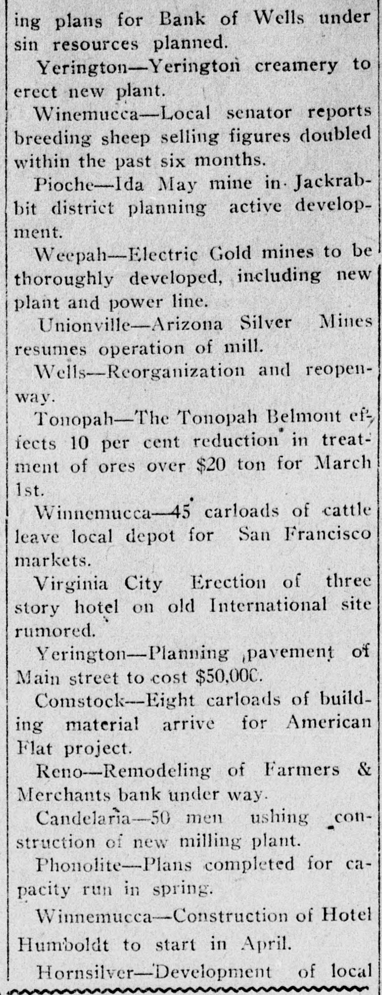 ing plans for Bank of Wells under sin resources planned. Yerington-Yerington creamery to erect new plant. Winemucca-Local senator reports breeding sheep selling figures doubled within the past six months. Pioche-Ida May mine in Jackrabbit district planning active development. Weepah-Electric Gold mines to be thoroughly developed, including new plant and power line. Unionville-Arizona Silver Mines resumes operation of mill. Wells-Reorganization and reopenway. Tonopah-The Tonopah Belmont ef-, fects 10 per cent reduction in treatment of ores over $20 ton for March 1st. Winnemucca-45 carloads of cattle leave local depot for San Francisco markets. Virginia City Erection of three story hotel on old International site rumored. Yerington-Planning ,pavement of Main street to cost $50,000. Comstock--Eight carloads of building material arrive for American Flat project. Reno-Remodeling of Farmers & Merchants bank under way. Candelaria-50 men ushing construction of new milling plant. Phonolite-Plans completed for capacity run in spring. Winnemucca-Construction of Hotel Humboldt to start in April. Hornsilver-Development of local