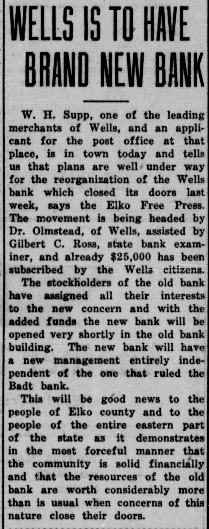 WELLS IS TO HAVE BRAND NEW BANK W. H. Supp, one of the leading merchants of Wells, and an applicant for the post office at that place, is in town today and tells us that plans are well under way for the reorganization of the Wells bank which closed its doors last week, says the Elko Free Press. The movement is being headed by Dr. Olmstead, of Wells, assisted by Gilbert C. Ross, state bank examiner, and already $25,000 has been subscribed by the Wells citizens. The stockholders of the old bank have assigned all their interests to the new concern and with the added funds the new bank will be opened very shortly in the old bank building. The new bank will have a new management entirely independent of the one that ruled the Badt bank. This will be good news to the people of Elko county and to the people of the entire eastern part of the state as it demonstrates in the most forceful manner that the community is solid financially and that the resources of the old bank are worth considerably more than is usual when concerns of this nature close their doors.