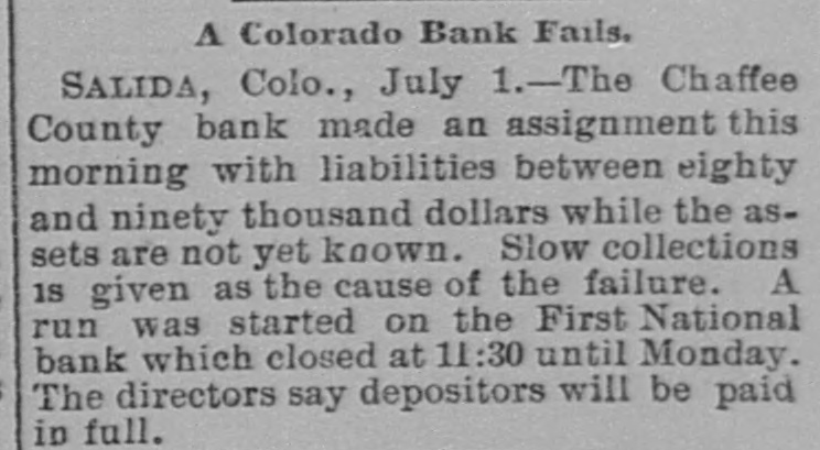 has been selling a good many freightears on time, and, being unable to realize on them, went to the wall. When the news reached St. Louis it created great consternation among the brokers, as all the parties interested were heavily concerned in a number of big local enterprises. The Madison Car Works were controlled by what is known as the "Granite" Mountain people, who were also behind the Merchants' bridge, the Security building and a number of mining enterprises. Six months ago it bonded itself for $500,000. This was used to pay off the outstanding indebtedness and to enlarge the plant, and is known to have left the company with plenty of working capital. The works were running at full capacity, turning out between forty and fifty cars a day. Major Rainwater, one of the leading members of the company, says that it was embarrassed by paper they had indorsed and which was not paid at maturity. This paper has been received by the company in the settlement of accounts, etc. Major Rain water had no idea how much of this paper is in existence. The concern is one of the largest of the kind in the United States. It was the intention of the capitalists who operated the plant to make the town of Madison another such a place as Pullman, and the project was meeting with much success. PITTSBURG, July 1.-The Speat White Sand Company has assigned. Liabilities $60,000, assets $200,000. The stringency in the money market and the complete shut-down of the glass factories are the cause of the failure. SALIDA, Colo., July 1.-The Chaffee County Bank made an assignment this morning. Its liabilities are. between $80.000 and $90,000, while its assets are not yet known. Slow collections are given as the cause of the failure. A run was started on the First National Bank, which closed at 11:30 until Monday. The directors say the depositors will be paid in full. WEBB CITY, Mo., July 1.-The Exchange Bank of this city assigned to-day. The deposits amount to about $60,000. The liabilities are not yet known. The stringency of the money market and the withdrawal of deposits are assigned as the cause of failure. OURAY, Colo., July - The First National Bank closed this morning, owing to the want of currency. The assets are $110.000, and the liabilities $42,000. The bank will probably resume in a few days. A run was inaugurated on Thatcher Brothers' Merchants' and Miners' Bank, but it was only a slight flurry.