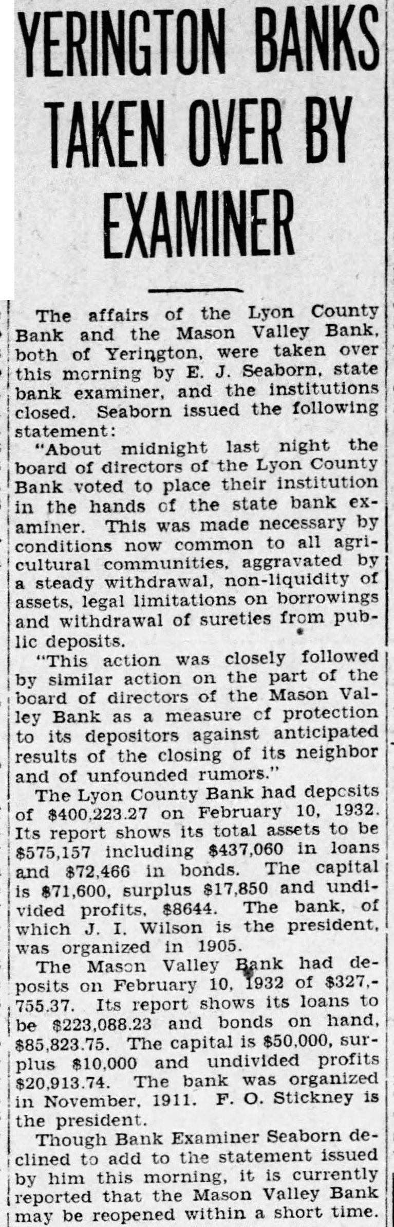 YERINGTON BANKS TAKEN OVER BY EXAMINER The affairs of the Lyon County Bank Mason Valley taken over both of Yerington. state this morning by and the institutions bank Seaborn issued the following closed. statement last night the "About midnight board of directors the Lyon County voted to their institution Bank place hands of the state bank exin the made necessary by aminer. This common to all agriconditions cultural aggravated steady non-liquidity assets, legal limitations on borrowings and withdrawal of sureties from public deposits. action was closely followed "This part of the similar action the Mason Valboard of Bank protection ley against anticipated its results of the closing of its neighbor and of County Bank had deposits February 10. 1932. total to be $437,060 in loans including in bonds. The capital and undisurplus The bank. of vided which Wilson the organized 1905 Bank had deThe Mason Valley posits on February 10. 1932 of $327.Its shows its loans to 755.37 report and bonds on hand. The capital is surundivided profits plus bank organized 1911. O. Stickney the president. Bank Seaborn Though the issued clined to by him this the Mason Valley Bank that reopened within short time. may be
