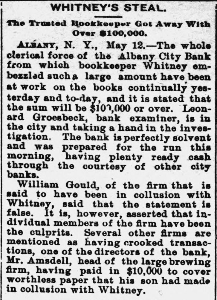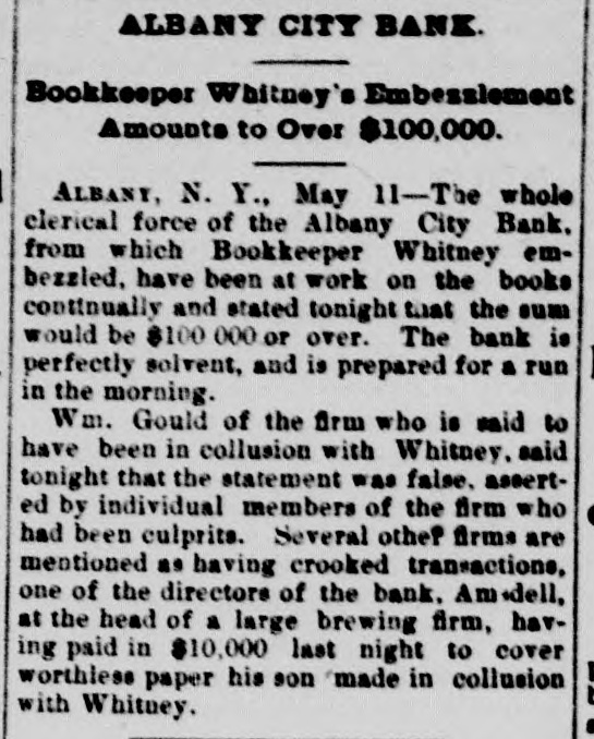 ALBANY CITY BANK. Bookkeeper Whitney's Embessiement Amounts to Over $100,000. ALBANY, N. Y., May 11-The whole clerical force of the Albany City Bank. from which Bookkeeper Whitney embezzled, have been at work on the books continually and stated tonight that the sum would be $100 000 or over. The bank is perfectly solvent, and is prepared for a run in the morning. Wm. Gould of the firm who is said to have been in collusion with Whitney. said tonight that the statement was false. asserted by individual members of the firm who had been culprits. Several other firms are mentioned as having crooked transactions, one of the directors of the bank. Amdell, at the head of a large brewing firm, having paid in $10,000 last night to cover worthiess paper his son made in collusion with Whitney.