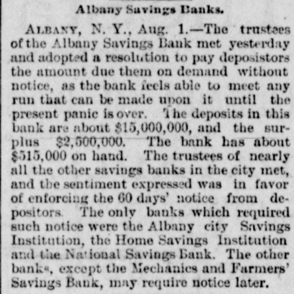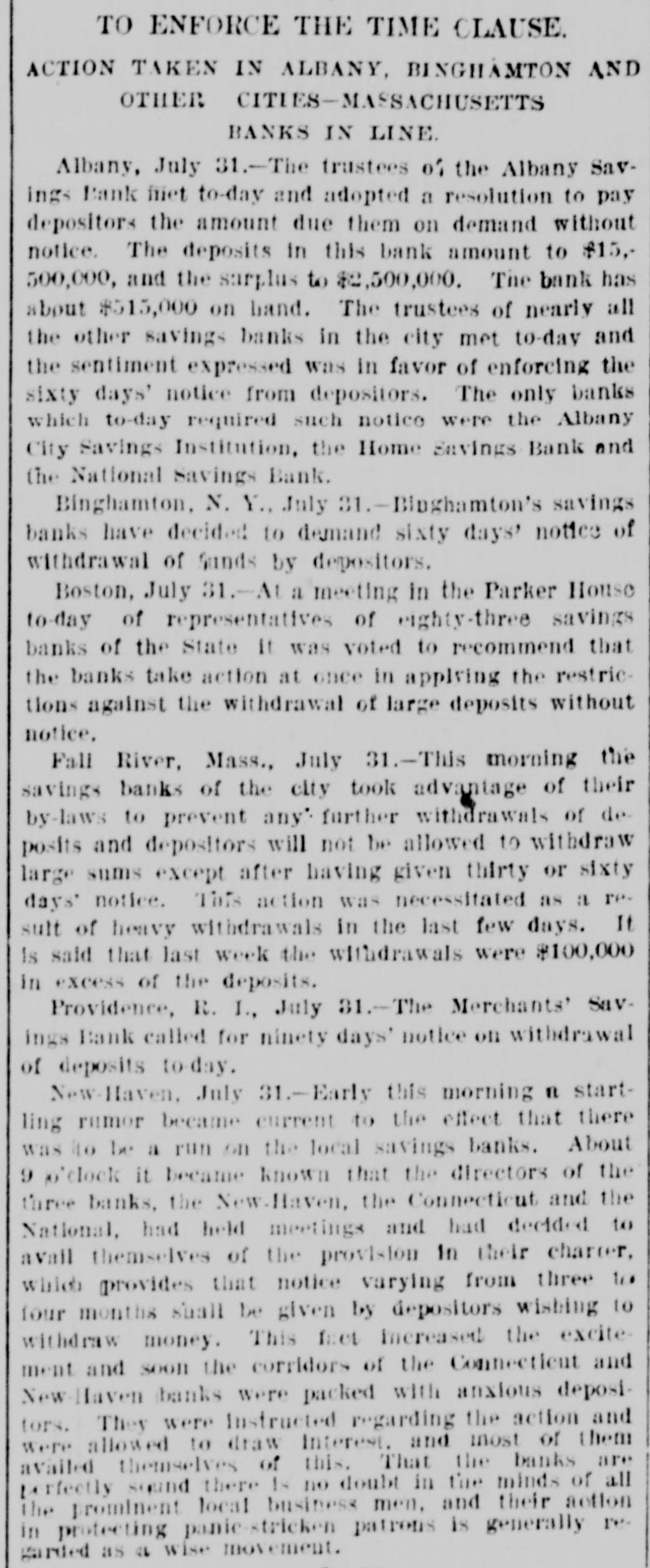 TO ENFORCE THE TIME CLAUSE. ACTION TAKEN IN ALBANY, BINGHAMTON AND OTHER CITIES-MASSACHUSETTS BANKS IN LINE. Albany, July 31.-The trustees of the Albany Savings Bank met to-day and adopted a resolution to pay depositors the amount due them on demand without notice. The deposits in this bank amount to $15,500,000, and the surplus to $2,500,000. The bank has about $515,000 on hand. The trustees of nearly all the other savings banks in the city met to-day and the sentiment expressed was in favor of enforcing the sixty days' notice from depositors. The only banks which to-day required such notice were the Albany City Savings Institution, the Home Savings Bank and the National Savings Bank. Binghamton, N. Y., July 31.-Binghamton's savings banks have decided to demand sixty days' notice of withdrawal of Sunds by depositors. Boston, July 31.-At a meeting in the Parker House to-day of representatives of eighty-three savings banks of the State It was voted to recommend that the banks take action at once in applying the restrictions against the withdrawal of large deposits without notice. Fall River, Mass., July 31.-This morning the savings banks of the city took advantage of their by-laws to prevent any' further withdrawals of deposits and depositors will not be allowed to withdraw large sums except after having given thirty or sixty days' notice. This action was necessitated as a result of heavy withdrawals in the last few days. It Is said that last week the withdrawals were $100,000 in excess of the deposits. Providence, R. I., July 31.-The Merchants' Savings Bank called for ninety days' notice on withdrawal of deposits to-day. New-Haven, July 31.-Early this morning n startling rumor became current to the effect that there was to be a run on the local savings banks. About 9 o'clock it became known that the directors of the three banks, the New-Haven, the Connecticut and the National, had held meetings and had decided to avail themselves of the provision In their charter, which provides that notice varying from three to four months shall be given by depositors wishing to withdraw money. This fact increased the excitement and soon the corridors of the Connecticut and New-Haven banks were packed with anxious depositors. They were Instructed regarding the action and were allowed to draw Interest. and most of them availed themselves of this. That the banks are perfectly sound there Is no doubt in the minds of all the prominent local business men, and their action in protecting panic-stricken patrons is generally regarded as a wise movement.