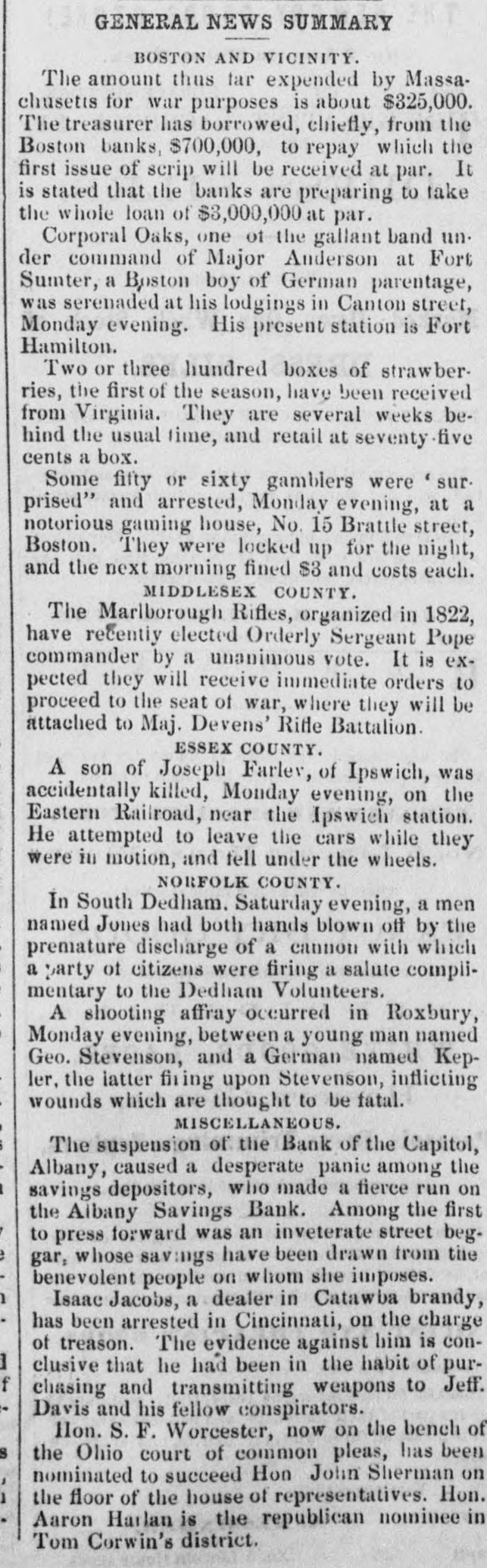 GENERAL NEWS SUMMARY BOSTON AND VICINITY. The amount thus far expended by Massachusetts for war purposes is about $325,000. The treasurer has borrowed, chiefly, from the Boston banks, $700,000, to repay which the first issue of scrip will be received at par. It is stated that the banks are preparing to take the whole loan of $3,000,000 at par. Corporal Oaks, one of the gallant band un. der command of Major Anderson at Fort Sumter, a Boston boy of German parentage, was serenaded at his lodgings in Canton street, Monday evening. His present station is Fort Hamilton. Two or three hundred boxes of strawberries, the first of the season, have been received from Virginia. They are several weeks behind the usual time, and retail at seventy cents a box. Some fifty or sixty gamblers were 'sur. prised" and arrested, Monday evening, at a notorious gaming house, No. 15 Brattle street, Boston. They were locked up for the night, and the next morning fined $3 and costs each. MIDDLESEX COUNTY. The Mariborough Rifles, organized in 1822, have recently elected Orderly Sergeant Pope commander by a unanimous vote. It is expected they will receive immediate orders to proceed to the seat of war, where they will be attached to Maj. Devens' Rifle Battalion. ESSEX COUNTY. A son of Joseph Farley, of Ipswich, was accidentally killed, Monday evening, on the Eastern Railroad, near the Ipswich station. He attempted to leave the cars while they were in motion, and fell under the wheels. NORFOLK COUNTY. In South Dedham. Saturday evening, a men named Jones had both hands blown off by the premature discharge of a cannon with which a party of citizens were firing a salute complimentary to the Dedham Volunteers. A shooting affray occurred in Roxbury, Monday evening, between a young man named Geo. Stevenson, and a German named Kepler, the latter firing upon Stevenson, inflicting wounds which are thought to be fatal. MISCELLANEOUS. The suspension of the Bank of the Capitol, Albany, caused a desperate panie among the savings depositors, who made a fierce run on the Albany Savings Bank. Among the first to press forward was an inveterate street beggar, whose savings have been drawn from the benevolent people on whom she imposes. Isaac Jacobs, a dealer in Catawba brandy, has been arrested in Cincinnati, on the charge of treason. The evidence against him is conclusive that he had been in the habit of purf chasing and transmitting weapons to Jeff. Davis and his fellow conspirators. Hon. S. F. Worcester, now on the bench of the Ohio court of common pleas, has been nominated to succeed Hon John Sherman on the floor of the house of representatives. Hon. Aaron Harlan is the republican nominee in Tom Corwin's district.