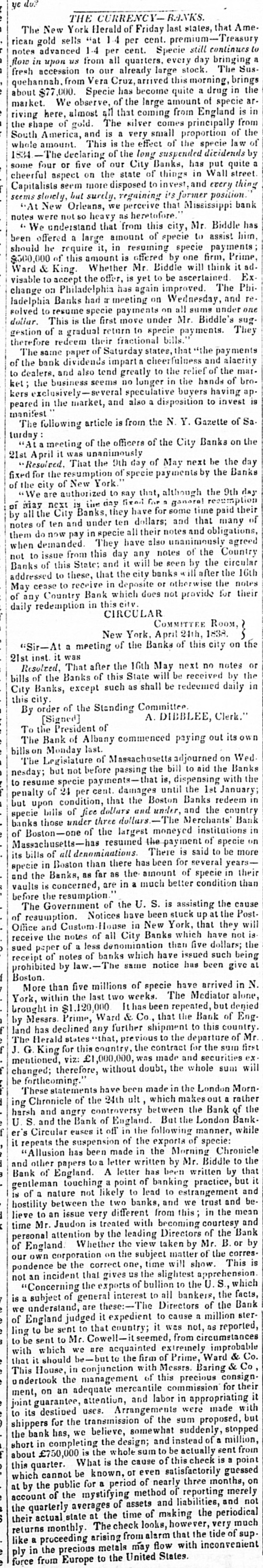 ye do Ame. THE CURRENCY BANKS. last states,that Ame The New York Herald of Friday cent. premium-Treasury continues rican gold advanced sells 1.4 "at per cent. per quarters. Specie every still day bringing The Susnotes upon us from all already large stock. brings flow fresh in accession from to Vera our Cruz, become arrived this quite morning, a drug in the arabout $77,000. Specie of the large amount of is in market. We observ all that coming from quehannah almost has principally England specie from riving here, of gold. The silver small comes proportion of the of whole amount. South the shape America, and This is is a the the very long effect suspended of the specie dicidends quite law by a 1834 The declaring five of of our City Banks, has in Wall put street. cheerful some four aspect or on more the disposed state of to things invest, former and every position. thing Capitalists seem but surely. regaining that its Mississippi bank seems slorely, New Orleans, we perceive heretafore. notes "At were understand not so heavy that as from this of specie city, Mr. to assist Biddle him. has We offered a large amount resuming specie payments Prime, & Ward should been he rrquire it, in is offered by one will firm, think it ad is yet The $500,000 King. of this amount Whether Mr. Biddle to be ascertained Phi Exvigable to accept Philadelphia the offer, has again improved. Wednesday, and re change on Banks had a meeting on on all sums under solved ladelphia to resume specie first payments move under Mr. Biddle's They sugdollar. gestion of This gradual is the their return fractional to specie bills. payments. "the payments therefore redeem paper of Saturday cheerfulness states, that and alacrity marThe bank same dividends impart a to the relief of the of broof to dealers. the and also seems tend greatly no longer in buyers the hands having apkers ket exclusively- the in business the market, several and speculative also a disposition to invest of Sa. is peared manifest following article is from the N.Y. Gazette on the turday The meeting of the officers of the City Banks the 21st "Ata Resulted April it resumption was That unanimously the 9th of specie day of payments May next by be the Banks day fixed of the for city the of authorized New York.' to say lixed that, for although general the recumption paid their 9th day ten We May are next is Banks, the day they have for some and that time many of all of by all the City and under ten dollars; their notes and obligations, agreed notes them do of now pay in specie They have also unanimously of the Country from this day any will be seen by the the 16th when not to demanded issue this State: and it banks notes ill after circular Banks of these, that the city or otherwise the notes their any this May addressed cease Country to to receive Bank in which deposite city does not provide for of daily redemption in CIRCULAR York, COMMITTEE April 24th, 1838. Room, on "Sir- At a meeting New of the Banks of this no city notes the or 21st inst. it was That after the 16th will May be next received by the in except City Banks, bills Resulted, of the Banks of such this State as shall be redeemed daily this city; By order of the Standing Committee. A. DIBBLEE, Clerk.' The Bank of on To the [Signed] President Albany of commenced paying out its Wed own billson Legislature Monday last. of Maggachusetts the bill adjourned to aid the with Banks the nesday; The but specie not before payments passing that is, until dispensing the 1st January; in to resume of 24 per cent. damages the Boston Banks redeem country penalty but upon bills condition, of fice dollars that dollars. and under, The and Merchants the Bank in specie those under three largest moneyed institutions of specie on Massachusetts-hominations banks of Boston-one of the resumed the payment There is said to be more several yearsits bills of Boston all than there has amount been for of specie in their vaults is concerned, specie and the in Banks, as far are as in the a much better condition than cause before the Government resumption of the have U. been S. is stuck assisting up at the they the Post- will The Notices in New York, that have not is of resumption. Custom-1 House Banks which Office and the notes of denomination all City than five dollars; such being the by prohibited in sued receipt receive paper of notes of law.- a less of banks The same which notice have issued has been give N. arrived than five millions weeks. of specie The have Mediator denied alone, York, within the last two has been the Bank of brought in Ward & Co., that to this Boston. More $1,120,000 Prime, shipment repeated, but country. Eng. Mr by Messrs. has declined any further previous to the departure the SOID of first land The Herald for states this that, country, the was contract made and for securities will exchanged; therefore, mentioned, G.King viz: £1,000, without doubt, the whole sum be forthcoming. in the made Morn. been London a rather ing These Chronicle and statements angry of the controversy have 24th ult, between which But makes the the London Bank out of Bank. while the U.S and eases it off in the the exports of specie: er's harsh Circular the Bank of England. of following manner, Chronicle it repeats the suspension been made in the Morning Mr. Biddle to the "Allusion has to a letter written by written by that it other papers letter has been practice, but and Bank of England. A a point of banking and gentleman not likely to lead and to we trust and beof nature touching banks, estrangement in the mean hostility is a between the two different from this; courtesy and lieve to an Jaudon issue very is treated with becoming Directors of the or Bank by personal time Mr attention Whether by the the leading view taken matter by of Mr. the B. corres. is of England corporation on the subject time will show. This pondence our own be the that correct gives one, us the slightest to the apprehension U.S., which not "Concerning an incident the expo