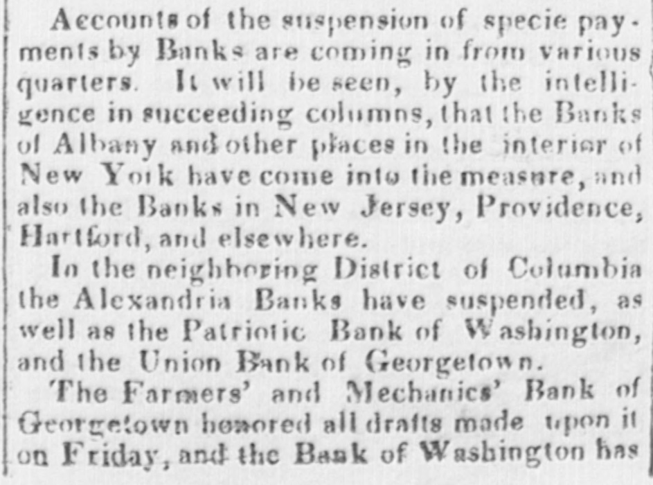 Accounts of the suspension of specie pay. ments by Banks are coming in from various quarters. It will be seen, by the intelligence in succeeding columns, that the Banks of Albany and other places in the interier of New York have come into the measure, and also the Banks in New Jersey, Providence, Hartford, and elsewhere. In the neighboring District of Columbia the Alexandria Banks have suspended, as well as the Patriotic Bank of Washington, and the Union Bank of Georgetown. The Farmers' and Mechanics' Bank of Georgetown honored all drafts made upon it on Friday, and the Bank of Washington has