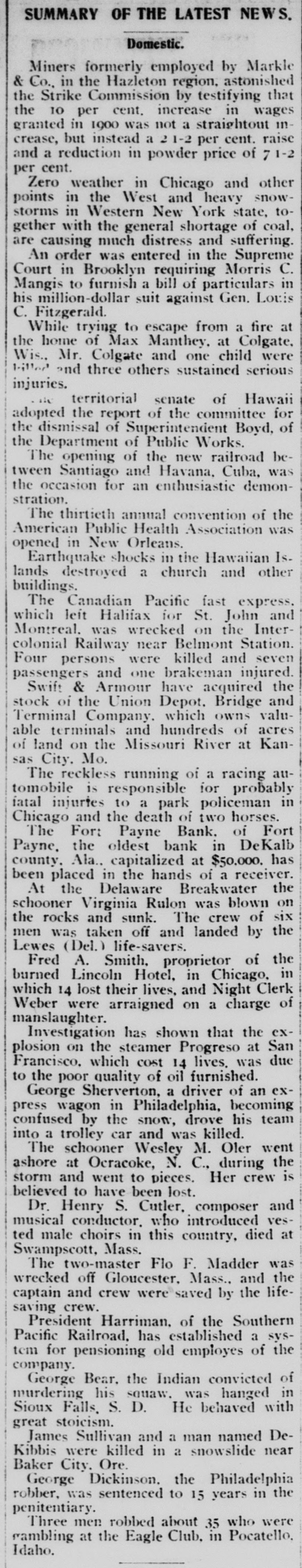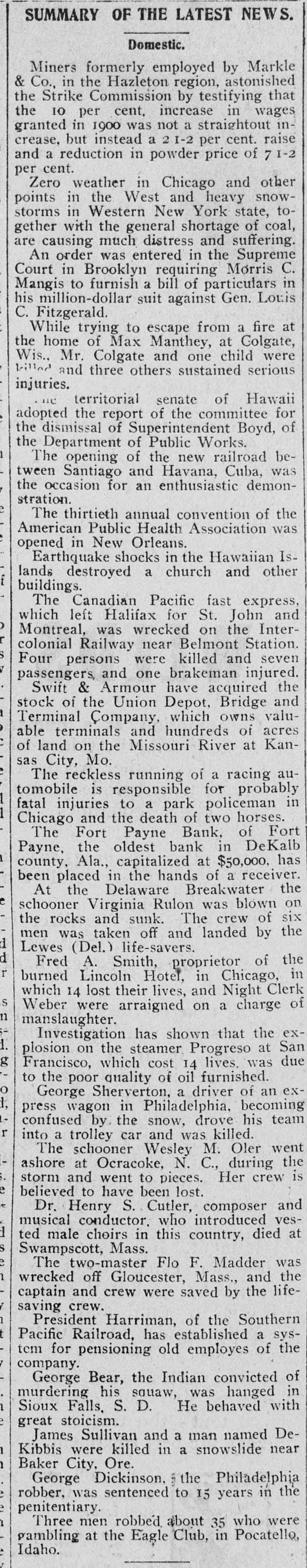 Domestic. Miners formerly employed by Markle & Co., in the Hazleton region, astonished the Strike Commission by testifying that the 10 per cent. increase in wages granted in 1900 was not a straightout increase, but instead a 2 I-2 per cent. raise and a reduction in powder price of 7 I-2 per cent. Zero weather in Chicago and other points in the West and heavy snowstorms in Western New York state, together with the general shortage of coal, are causing much distress and suffering. An order was entered in the Supreme Court in Brooklyn requiring Morris C. Mangis to furnish a bill of particulars in his million-dollar suit against Gen. Louis C. Fitzgerald. While trying to escape from a fire at the home of Max Manthey, at Golgate, Wis., Mr. Colgate and one child were billed and three others sustained serious injuries. territorial senate of Hawaii adopted the report of the committee for the dismissal of Superintendent Boyd, of the Department of Public Works. The opening of the new railroad between Santiago and Havana, Cuba, was the occasion for an enthusiastic demonstration. The thirtieth annual convention of the American Public Health Association was opened in New Orleans. Earthquake shocks in the Hawaiian Islands destroyed a church and other buildings. The Canadian Pacific fast express, which left Halifax for St. John and Montreal, was wrecked on the Intercolonial Railway near Belmont Station. Four persons were killed and seven passengers, and one brakeman injured. Swift & Armour have acquired the stock of the Union Depot, Bridge and Terminal Çompany, which owns valuable terminals and hundreds of acres of land on the Missouri River at Kansas City, Mo. The reckless running of a racing automobile is responsible for probably fatal injuries to a park policeman in Chicago and the death of two horses. The Fort Payne Bank, of Fort Payne, the oldest bank in DeKalb county, Ala., capitalized at $50,000, has been placed in the hands of a receiver. At the Delaware Breakwater the schooner Virginia Rulon was blown on the rocks and sunk. The crew of six men was taken off and landed by the d Lewes (Del.) life-savers. d Fred A. Smith, proprietor of the burned Lincoln Hotel, in Chicago, in which 14 lost their lives, and Night Clerk S Weber were arraigned on a charge of n manslaughter. Investigation has shown that the explosion on the steamer Progreso at San g Francisco, which cost 14 lives. was due to the poor quality of oil furnished. George Sherverton, a driver of an express wagon in Philadelphia, becoming confused by, the snow, drove his team into a trolley car and was killed. The schooner Wesley M. Oler went ashore at Ocracoke, N. C., during the storm and went to pieces. Her crew is believed to have been lost. Dr. Henry S. Cutler, composer and musical conductor. who introduced vested male choirs in this country, died at Swampscott, Mass. The two-master Flo F. Madder was wrecked off Gloucester, Mass., and the captain and crew were saved by the lifesaving crew. President Harriman, of the Southern Pacific Railroad, has established a system for pensioning old employes of the company. George Bear, the Indian convicted of murdering his squaw, was hanged in Sioux Falls. S. D. He behaved with great stoicism. James Sullivan and a man named DeKibbis were killed in a snowslide near Baker City, Ore. George Dickinson, the Philadelphia robber, was sentenced to 15 years in the penitentiary. Three men robbed about 35 who were gambling at the Eagle Club, in Pocatello,
