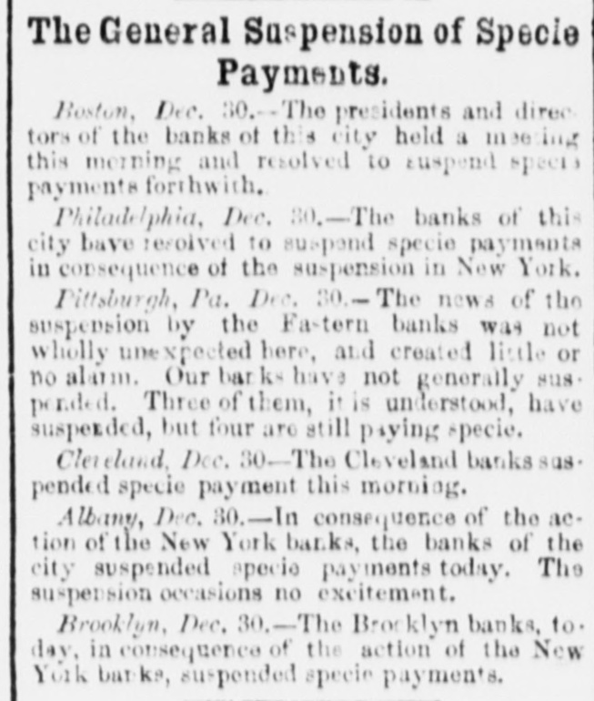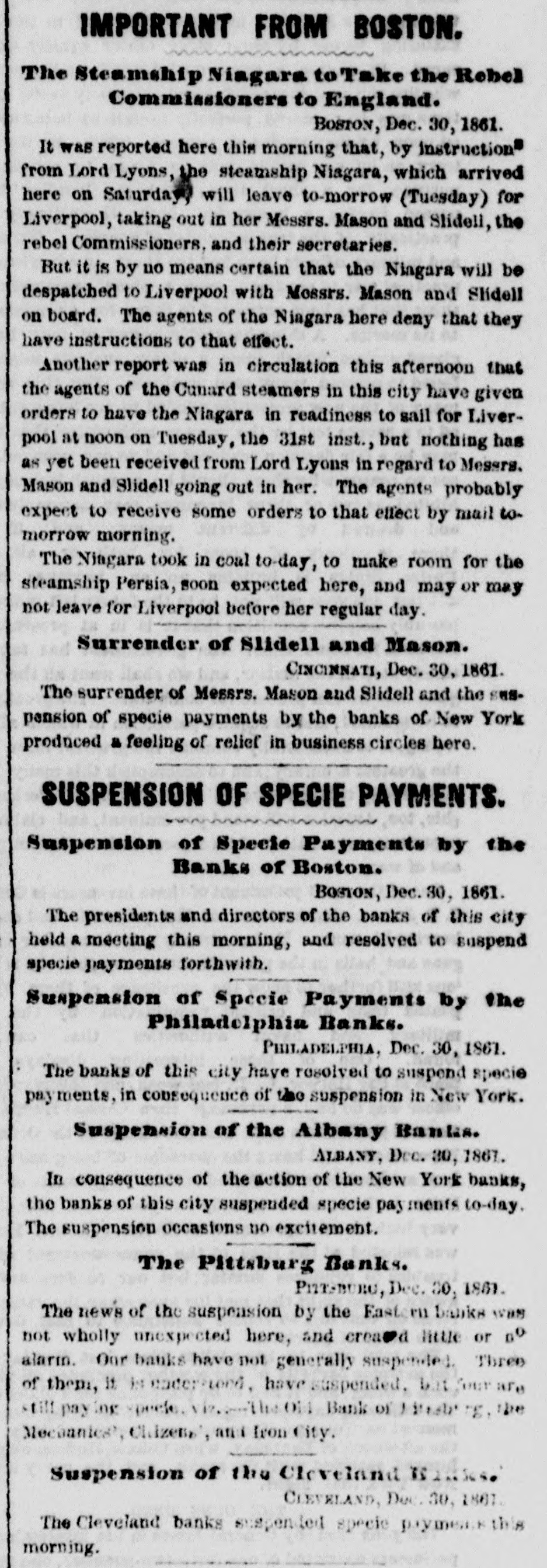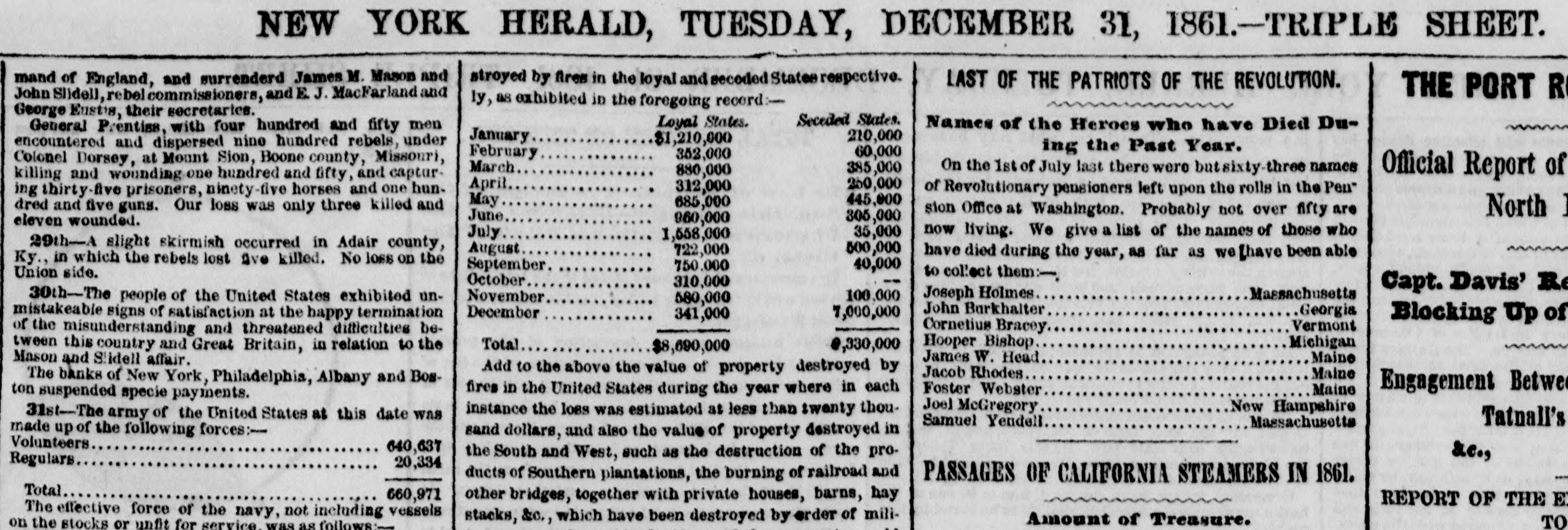 NEW YORK HERALD, TUESDAY, DECEMBER 31, 1861.-TRIPLE SHEET. mand of England, and surrenderd James M. Mason and stroyed by fires in the loyal and secoded States respective. LAST OF THE PATRIOTS OF THE REVOLUTION. THE PORT R John Slidell, rebel commissioners, and E. J. MacFarland and ly, as exhibited in the foregoing record:George Eustes, their secretaries. Seceded States. Loyal States. Names of the Heroes who have Died DuGeneral Prentiss, with four hundred and fifty men 210,000 January $1,210,000 encountered and dispersed nine hundred rebels, under ing the Past Year. 60,000 February 352,000 Colonel Dorsey, at Mount Sion, Boone county, Missouri, March 385,000 On the 1st of July last there were butsixty names 880,000 Official Report of killing and wounding one hundred and fifty, and capturApril 250,000 312,000 of Revolutionary pensioners left upon the rolls in the Pen" ing thirty-five prisoners, ninety-five horses and one hun445,000 May 685,000 dred and five guns. Our loss was only three killed and North 1 sion Office at Washington. Probably not over fifty are June 305,000 960,000 eleven wounded. now living. We give a list of the names of those who 35,000 July 1,558,000 29th-A slight skirmish occurred in Adair county, 500,000 August 722,000 have died during the year, as far as we [have been able Ky., in which the rebels lost Ave killed. No loss on the September 40,000 750.000 to collect them Union side. -October 310,000 Capt. Davis' Re Massachusetts Joseph Holmes November 100,000 30th-The people of the United States exhibited un580,000 John Barkhalter Georgia December 7,000,000 mistakeable signs of satisfaction at the happy termination 341,000 Blocking Up of Vermont Cornetius Bracoy of the misunderstanding and threatened difficulties beMichigan Hooper Bishop Total €,330,000 tween this country and Great Britain, in relation to the $8,690,000 Maine James W. Head Mason and Slidell affair. Add to the above the value of property destroyed by Jacob Rhodes Maine The banks of New York, Philadelphia, Albany and BosEngagement Between Foster Webster Maine fires in the United States during the year where in each ton suspended specie payments. Joel McGregory New Hampshire instance the loss was estimated at less than twenty thou31st-The army of the United States at this date was Samuel Yendell Tatnall's Massachusetts made up of the following forces:sand dollars, and also the value of property destroyed in Volunteers 640,637 the South and West, such as the destruction of the pro&c., Regulars 20,334 ducts of Southern plantations, the burning of railroad and PASSAGES OF CALIFORNIA STEAMERS IN 1861. Total 660,971 other bridges, together with private houses, barns, hay REPORT OF THE El The effective force of the navy, not including vessels stacks, &c., which have been destroyed by order of miliAmount of Treasure. on the stocks or unfit for service was as follows:TO