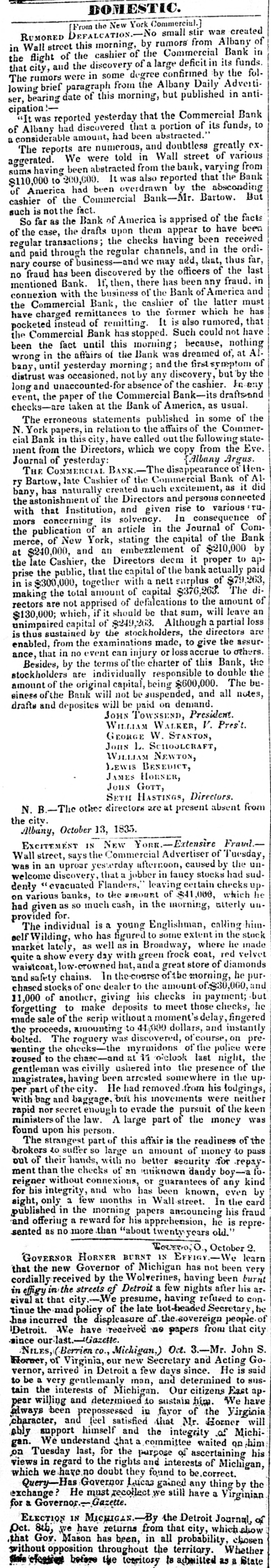 DOMESTIC. the New York Commercial.] DEFALCATION. [From No small stir was created RUMORED this morning, by rumors from Albany in of Wall street cashier of the Commercial Bank the and the discovery of a large deficit in in city, flight of the by its the funds folthat were in some degree confirmed The rumors brief paragraph from the Albany Daily Adverti- antiser, lowing bearing date of this morning, but published in cipation reported yesterday that the Commercial Bank to "It Albany was had discovered that a portion of its funds, a of considerable amount, had been abstracted.' The reports are numerous, and doubtless greatly of various exWe were told in Wall street from sums having aggerated. been abstracted from the bank, varying Bank to 200,000. It was also reported that the $110,000 America had been overdrawn by the absconding But cashier of of the Commercial Bank-Mr. Bartow. such is not the fact. far the Bank of America is apprised of the facts been So the case, as the drafts upon them appear to have received regular of transactions; the checks having been the ordipaid through the regular channels, and in thus and course of business-and we may add, that, the last far, nary fraud has been discovered by the officers of in mentioned no Bank. If, then, there has been any fraud. connexion with the business of the Bank of America and the Commercial Bank, the cashier of the latter must has charged remittances to the former which he have pocketed instead of remitting. It is also rumored, that the Commercial Bank has stopped. Such could not have been the fact until this morning because, nothing in the affairs of the Bank was dreamed of, at Al- of wrong until yesterday morning and the first symptom the bany, distrust was occasioned, not by any discovery, but by long and unaccounted for absence of the cashier. Anany the paper of the Commercial Bank-its drafts-and checks-are event, taken at the Bank of America, as usual. The erroneous statements published in some of the York papers, in relation to the affairs of the CommerN cial Bank in this city, have called out the following statement from the Directors, which we copy from Argus. the Eve. Albany Journal of yesterday: THE COMMERCIAL disappearance of Henlate Cashier of the Commercial Bank of did A1ry Bartow, has naturally created much excitement, connected as it the bany, astonishment of the Directors and persons various sur with that Institution, and given rise to concerning its solvency. In consequence of Com- of mors publication of an article in the Journal Bank the of New York, stating the capital of the by merce, $240,000, and an embezzlement of $210,000 the at late Cashier, the Directors decm it proper to apthe public, that the capital of the bank actually $79,263, paid prise is $300,000, together with a nett surplus of dimaking in the total amount of capital $376,263. The rectors are not apprised of defalcations to the amount an of $130,000; which, if it should be that sum, will leave unimpaired capital of $249,263. Although a partial loss thus sustained by the stockholders, the directors assur- are enabled, is from the examinations made, to give the others. that in no event can injury or loss accrue to ance, Besides, by the terms of the charter of this Bank, the stockholders are individually responsible to double be- the amount of the original capital, being $600,000. The einess of the Bank will not be suspended, and all notes, drafts and deposites will be paid on demand. JOHN TOWNSEND, President. WILLIAM WALKER, V. Presit GEORGE W. STANTON, Jons L. SCHOOLCRAFT, WILLIAM NEWTON, LEWIS BENEDICT, JAMES HORNER, Jous GOTT, SETH HASTINGS, Directors. N. -The other directors are at present absent from the city. Albany, October 13, 1835. EXCITEMENT IN NEW York.-Extensive Fraud.Wall street, says the Commercial Advertiser of Tuesday, in an uproar yesterday afternoon, caused by the unwelcome was discovery that jobber in fancy stocks had suddenly evacuated Flanders, leaving certain checks upvarious banks, to the amount of $41,000, which he had on given as so much cash, in the morning, atterly unprovided The individual for is a young Englishman, calling himWilding, who has figured to some extent in the stock self market lately, as well as in Broadway, where he velvet made quite show every day with green frock coat, red diamonds low-crowned hat, and a great store of and waistcoat, safety chains. In the-course of the morning, he purchased stocks of one dealer to the amount of $30,000, and 11,000 of another, giving his checks in payment; but he forgetting to make deposits to meet those checks, made sale of the scrip without a moment' delay, fingered the proceeds, amounting to 41,000 dollars, and instantly bolted. The roguery was discovered, of course, on preventing the checks-the myrmidons of the police were the roused to the chase-and at 11 o'clook last night, gentleman was civilly ushered into the presence of the magistrates, having been arrested somewhere in the up per part of the city. He had removed from his lodgings, with bag and baggage, but his movements were neither rapid nor secret enough to evade the pursuit of the keen ministers of the law. A large part of the money was found upon his person. The strangest part of this affair is the readiness of the brokers to suffer so large an amount of money to pass out of their hands, with no better security for repaythan the checks of an miknown dandy boy- fowithout connexious, or guarantees any reigner ment who been known, of even kind by for his integrity, and has sight, only a few months in Wall street. In the card published in the morning papers ansouncing his fraud and offering a reward for his apprehension, he is represented as no more than "about twenty years old. Tourno,O. October 2. GOVERNOR HORNER BURNT IN EFFIGY We learn that the new Governor of Michigan has not been very cordially received by the Wolverines, having been burnt in effigy streets of Detroit a few nights after his arrival at that city