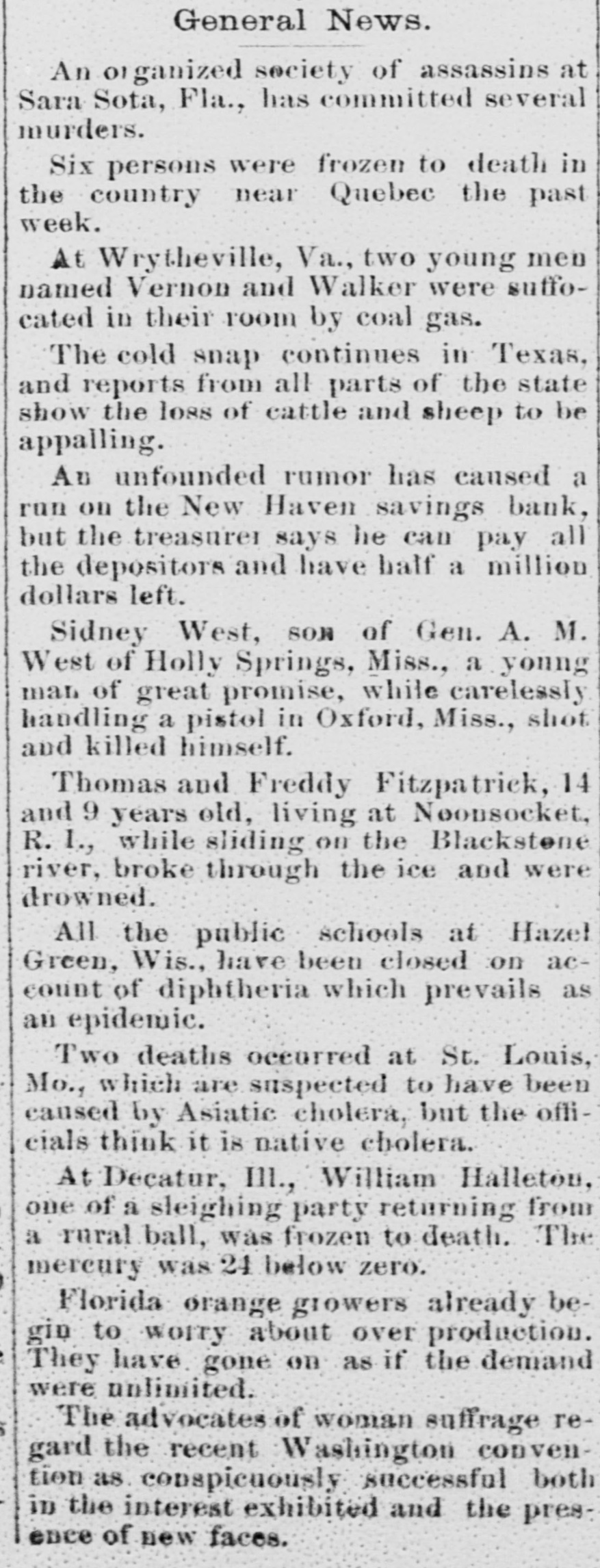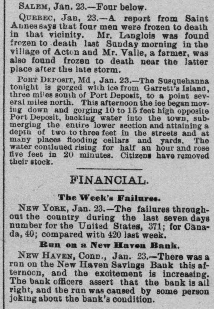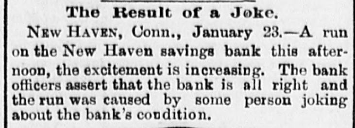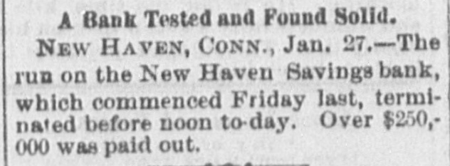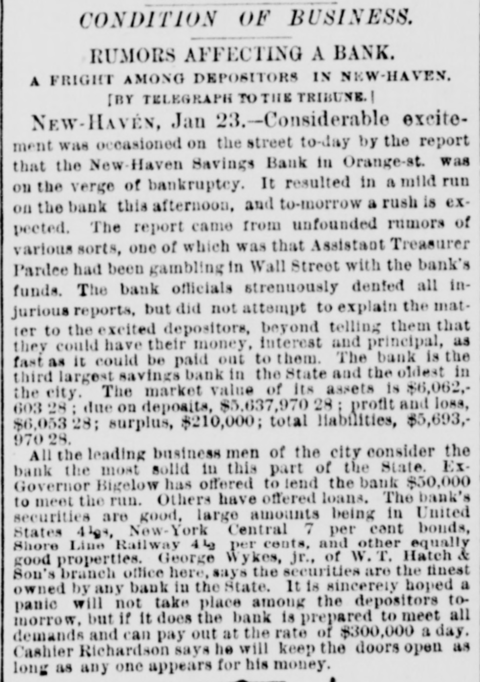 "SOUND AS A ROCK." A Slight Scare With Reference To a Sound Institution-What Somebody Told Somebody. A little ripple of excitement was occasioned yesterday about town by a small "run" on the "Old" or New Haven Savings bank on Orange street, which began to be noticeable the day before yesterday. The number withdrawing their savings was larger than on Thursday and a little before 3 o'clock when the bank closed for the day about forty people, mostly women, were busy taking out their deposits, though many did it rather hesitatingly as if afraid they were wrong in not leaving it in. A part of the people at the bank yesterday, however, were depositing money. The run is characterized by the most trusted and able financial men of the city absurd to the last degree. The "scare," if such it may be called, its dimensions being thus far pretty small, originated, gentlemen state, out of mere gossip from irresponsible sources. Men whom the community regard as our soundest and ablest business men and most honorable gentlemen, did not hesitate to pledge all their influence and honor that the bank "is as sound as the Bank of England." Another gentleman in a capacity to know, says "it is sound as a rock." Another said, "Why, the bank's statement is enough to satisfy the most critical." Another gentleman said, "The people who draw their money out will lose three months' interest and that is all there is to it. The bank cannot be shaken." A prominent banker said, "Why, any bank in New Haven would let the bank have a mint of money on its securities. Look at some of them, viz.: United States 41/2 per cent. bonds, par value $100,000, present value $112,500; New York Central and Hudson River railroad bonds, par value $300,000, present value $387,000; Shore Line railway bonds, par value $200,000, present value $216,000; 'Rock Island' railroad bonds, par value $200,000, market value $251,000. The bank has bills receivable of $2,624,755.99 and has hundreds of thousands of dollars more in good railroad bonds and $103,000 of New Haven town bonds and $125,000 of Hartford town bonds, to say nothing of about $150,000 in New Haven and other sound bank stock and about $1,000,000 in bonds of different cities, all good as wheat, and about $600,000 in good railroad bonds." Another gentleman said, "This is the most baseless run, if it can be called a run, I ever heard of. The scare will all be over in short metre." Expressions like these from our best men could be quoted without end. The bank officials are making endeavors to trace out the origin of the absurd rumor which has put many a depositor on the anxious seat, and have traced it from one person to another, principally persons, so a well informed leading man said, "as competent to judge of the matter as a setting hen." But to find its origin, they discover, is like looking for a needle in a hay stack. Mr. John P. Tuttle, secretary and treasurer of the bank, said with regard to the matter: "We shall pay anybody who wants the money. It is of no use to say anything about the solvency of the bank, as it would make no difference with people. If the papers were to publish that they saw a pile of gold pieces ten feet square piled up in the bank, for depositors, it would make no difference with people. Some wouldn't believe it at all. We have nothing to say, except that we shall pay everybody on demand."
