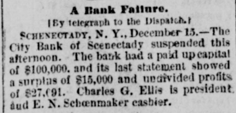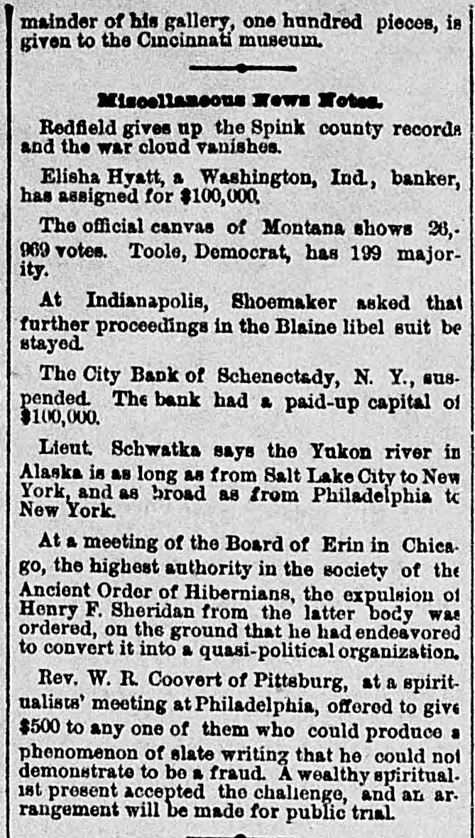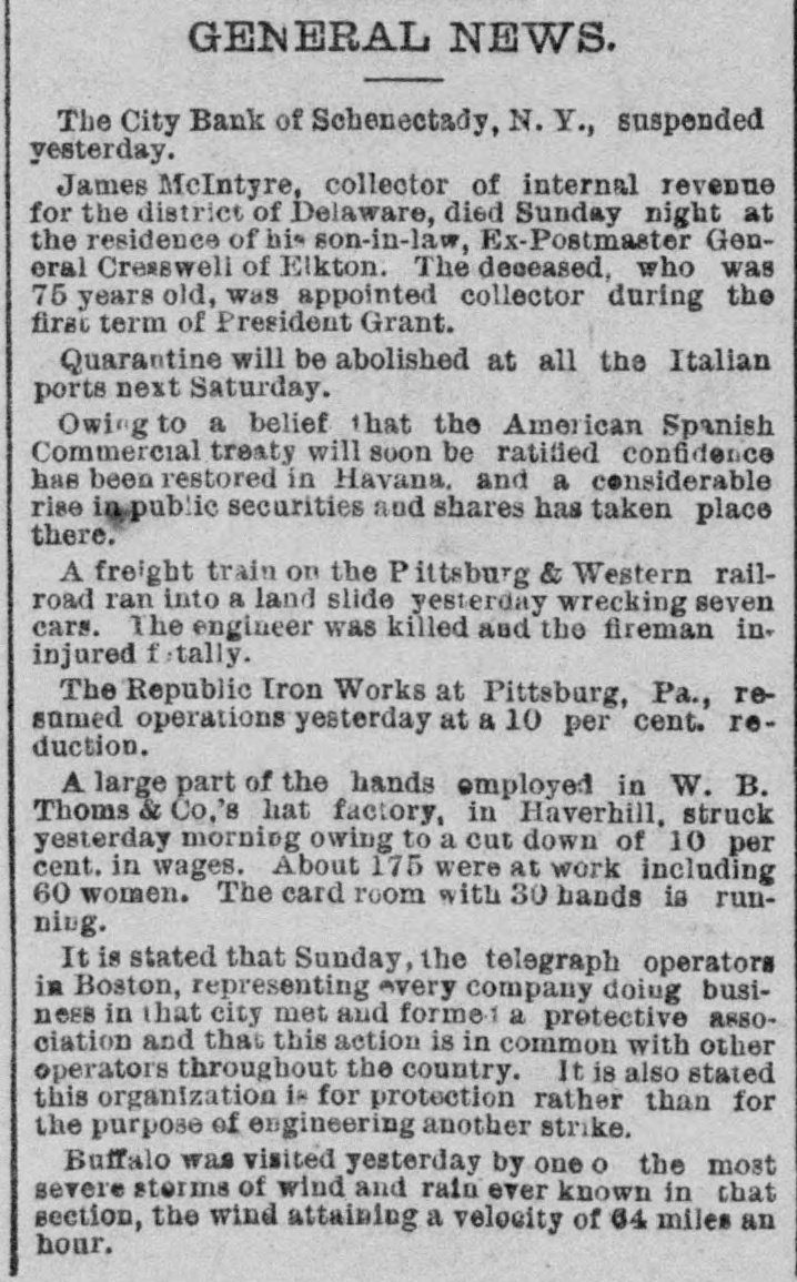 NEWS BRIEF. The City Bank of Schenectady, N.Y., has suspended. The Boston Independents have voted to continue their organization. The schooner Turtle capsized in Trinity Bay, and the crew pΓ©rished. The total Democratic majority in Texas by Congressional districts is 192,451. A fire in Houlton, Me., destroyed a block of business houses. Loss, $100,000. Tom Welsh was seriously cut by his cousin, John Tracy, in a quarrel in Cincinnati yesterday. Henry Levy & Son, importers of fancy goods, New York, assigned. Liabilities $300,000, Peter Louis Otto, who shot his wife in Buffalo, was convicted of murder in the first degree. The residence and barn of S. W. Hutchinson, near Miamiville, 0., were destroyed by fire. Loss $10,000, A new Democratic club is in progress of development in Cincinnati, to be composed of "reform Democrats." Frederick Weigmann, a German, living in Cincinnati, is in his 106th year, having been born in Germany October 26, 1779. The Miller Company's shops at Canton and Crestline, O., were closed by the sheriffon an execution upon judgments aggregating $10,000. Marshall H. McGreary, of Pittsburgh, and Daniel McGinnis, of Bellefontaine, O., committed suicido in Cincinnati by shooting themselves through the head. George Grant, after four trials and being twice convicted of murder and sentenced to death, was allowed to plead guilty to manslaughter. Ho killed a po. lido officer in Kansas City, in 1882,