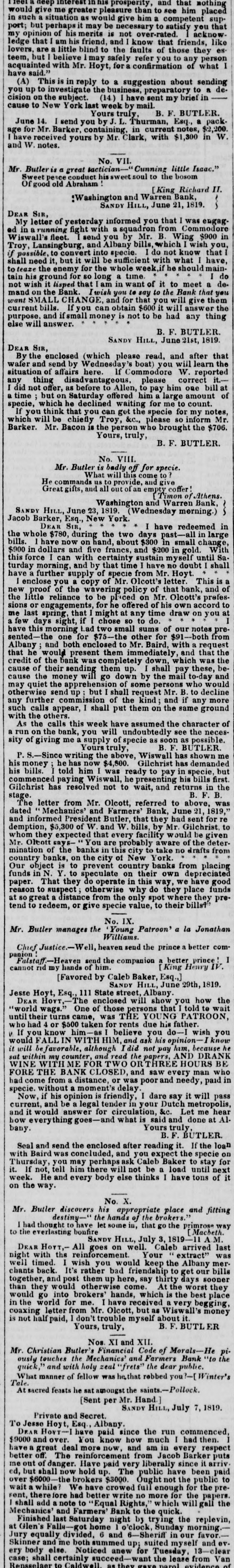 his prosperity, and that nothing placed would give me greater pleasure than to see him such situation would give him competent support; in but perhaps it may be necessary to satisfy acknow you that opinion of his merits is not over rated. like my that am his friend, and know that friends, lovers ledge are little blind to the faults those they person es but believe 1 may safely refer you any of what teem, acquainted with Mr. Hoyt, for confirmation have said.' This is in reply to a suggestion about to sending a de(A) to investigate the business, prepa in mail cision you up on the subject (14) have sent my brief cause to New York last week by B F BUTLER. Yours truly pack June 14. send you by J.L. 'hurman, Esq. notes, $2,200 Barker, containing current in W. and W. notes. I have age for received Mr yours by Mr. Clark, with $1,300 No. VII peace Sweet Mr is the conduct Butler great sactician- his ssweet soul Cunning to little bosom Isaac. Of good old Abraham II King Richard Bank, Washington SANDY and HILL, Warren June 21,1819 DEAR SIR, of yesterday informed you from that Commodore was engagMy letter running fight with squadron Mr. B Wing $900 in Lansingburg, do ed iswall's fleet send and you Albany by bills which not know wish that you, need if he week, Troy, if possible it, to but convert it will into be specie. sufficie nt with what should main- have, shall the enemy for the whole do dea it to tain to teaze his ground for long a want time of meet not wish it lisped that Iwish I am you in say to the Bank that them you mand SMALL the Bank CHANGE and for that $600 you will will answer give the if and small money purpose. want current bills you can obtain is not to be had any thing else will answer. B. F. BUTLER SANDY HILL, June 21st,1819 DEAR SIR, enclosed (which please read, and will after learn that the here. wafer By the and send by Wednes If Commodore boat) you W reported situation of affairs please correct thing disadvar Allen pay him one bill at of any did not offer, as before to him large amount but on Saturday offered for me to count a time which he declined waiting for my notes specie, If you think that you can get &c., the please specie so inform Mr is the Bacon Mr. Barker which will be chiefly Troy person who brought the $706. Yours, truly B. F. BUTLER No VIII Mr. Butler is badly off for specie. to? What will thi come He comman provide, and give coffe Great gifts, and all out an imon of Athens Washington and Warren Bank SANDY HILL, June 23. 1819. Wednesday morning. I Jacob Barker, Esq. New York have redeemed the whole DEAR $780, SIR during the about two days $300 past-all in small change With bills have now and on five hand, francs, and $200 in gold. until Sa that and by morning $900 this force in dollars can with certainty time sustain have no doubt shall Mr from Hoyt you of and have turday further supply copy of of specie Mr. Olcott's that letter bank, This little reliance of offered his new enclose proof of the wavering to be ced policy on Mr Olcott's own accord prefesdo sions the engagements, that might for he at any time draw on you me few last days spring sight, if Lad two chose small to sums of $91- our notes both from prehave this morning for $75-the other for with request sented the and one both enclosed to immediately Mr Baird, and that bank shall that Albany he woul present was comp them letely down which pay these, was the will go cause credit of of the their sending them down up. by the mail who to-day would and cause the money apprehension of some persons Mr. B to decline may quiet the send up but shall the request kind and if any more otherwise any further calls appear, commission shall of put them on the same ground of with such the others. this week have assumed the see character the neces B.F run As the on the calls bank, you wi ill of specie undoubtedly as soon as BUTLER possible sity of giving me Yours supply truly, the above S.-Since Wiswall writing has shown has Gilchrist demande but his P. money he told has him now $4,800 was ready he presenting to pay in his specie bills first the Gilchrist his commenced bills. has paying resolve Wiswall, not to wait, and returns in was stage. letter from Mr. Olcott, referred Bank, to June above, 21, 1819, President Mr demption dated The Mechanics' and Butler, Farmers that they had Gilchrist, sent for re to that Mr. of the and informed $5,300 of W and W. bills facility by would be given deterbanks whom Olcott they says expected You are this probably city to aware take no drafts from prevent own country mination banks, of the on the city of country New York. banks from reciated placing Our object is to to speculate on their way we have good funds in N. they do operate in this do they place funds tend paper. That suspect otherwise the only why spot when they prereason at so to great to redeem, distance or give from specie value, to their bills? No. IX a la Jonathan Mr. Butler manages the Williams Young Patroon' better Palstaff -Heaven Justice.- Well, heaven send the prince better prince chref. send the companion [King Henry cannot rid my [Favored hands of by him Caleb SANDY Baker, HILL, Esq., June 29th, 1819 the Jesse Hoyt, Esq. The 111 enclosed State street will Albany show that you told te y how or had $500 DEAR HOYT One of those THE persons YOUNG PATROON, believe you you "world until their wags. turns came taken was for rents due his do-I father. wish [know opinion who know him WITH HIM and ask not his pay him, because DRANK would FALL IN Y although I did AND BE it will be favorable, my counter, and TWO read OR THREE HOURS man who FORE THE distance, or sat within WINE WITH BANK ME FOR CLOSED was and poor sa and every needy, paid in had come from moment delay it dare will say pass without friendly be and for circulation how specie. Now, if his opinion legal is tender in your &C Dutch Let metropolis, me hear Al at done bany and current, it every would thing answer goes-and what is Yours said and trul F. BUTLER If it the after lo
