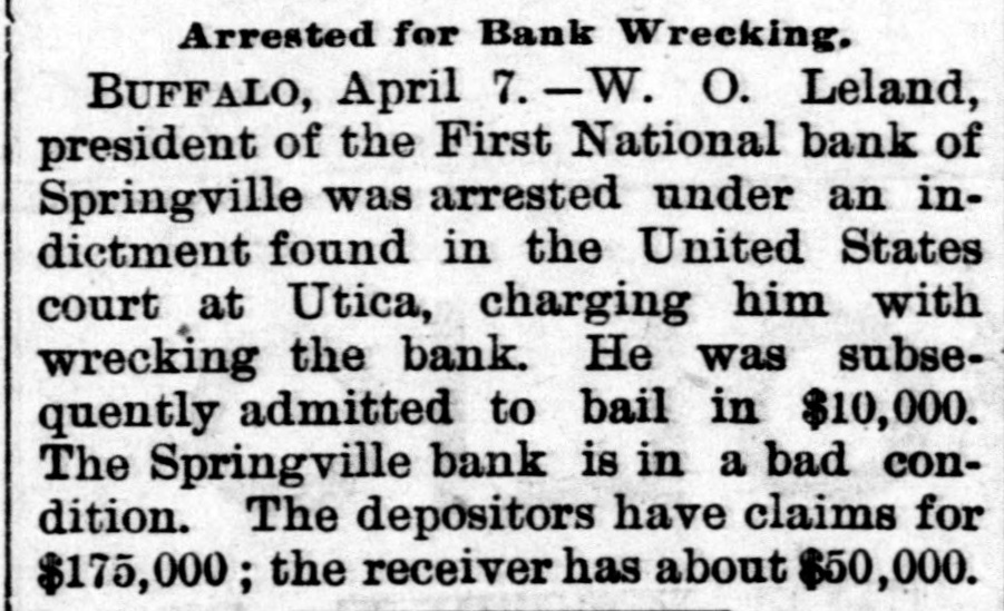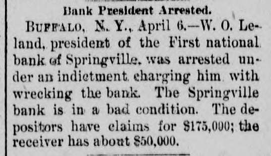 The First National Bank of Springville, N. Y., suspended Saturday in consequence of a run. The bank is believed to be solvent.