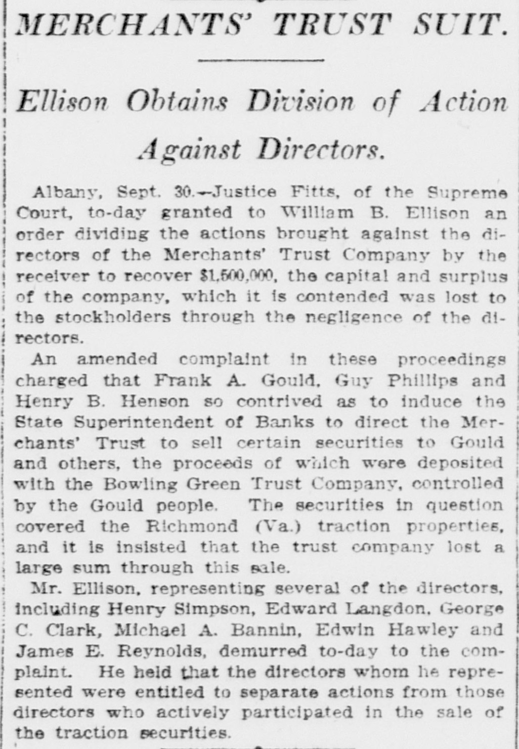 MERCHANTS' TRUST SUIT. Ellison Obtains Division of Action Against Directors. Albany, Sept. 30.-Justice Fitts, of the Supreme Court, to-day granted to William B. Ellison an order dividing the actions brought against the directors of the Merchants' Trust Company by the receiver to recover $1,500,000, the capital and surplus of the company, which it is contended was lost to the stockholders through the negligence of the directors. An amended complaint in these proceedings charged that Frank A. Gould, Guy Phillips and Henry B. Henson so contrived as to induce the State Superintendent of Banks to direct the Merchants' Trust to sell certain securities to Gould and others, the proceeds of which were deposited with the Bowling Green Trust Company, controlled by the Gould people. The securities in question covered the Richmond (Va.) traction properties, and it is insisted that the trust company lost a large sum through this sale. Mr. Ellison, representing several of the directors, including Henry Simpson, Edward Langdon. George C. Clark, Michael A. Bannin, Edwin Hawley and James E. Reynolds, demurred to-day to the complaint. He held that the directors whom he represented were entitled to separate actions from those directors who actively participated in the sale of the traction securities.