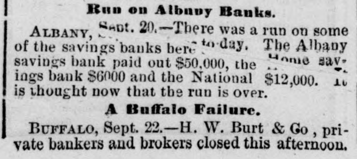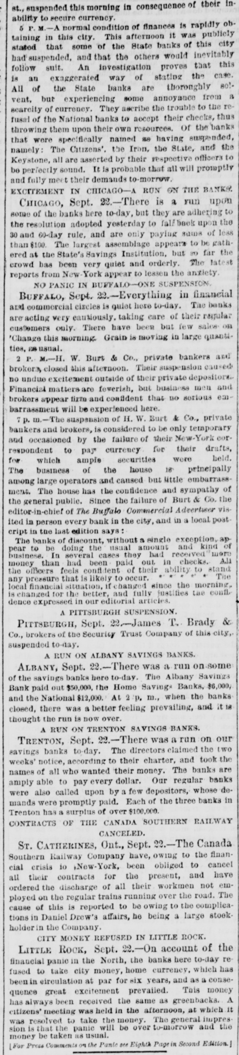 st., suspended this morning in consequence of their inability to secure currency. 5 P.M.-A normal condition of finances is rapidly obtaining in this city. This afternoon it was publicly stated that some of the State banks of this city had suspended, and that the others would inevitably follow suit. An investigation proves that this is an exaggerated way of stating the case. All of the State banks are thoroughly 80!vent. but experiencing some annoyance from a scarcity of currency. They ascribe the trouble to the refusal of the National banks to accept their checks, thus throwing them upon their own resources. Of the banks that were specifically nained as having suspended, namely: The Citizens'. the Iron, the State, and the Keystone, all are asserted by their respective officers to be perfectly sound. It is probable that all will promptly and fully meet their demands to-morrow. EXCITEMENT IN CHICAGO-A RUN ON THE BANKS. CHICAGO, Sept. 22.-There is a run upon some of the banks here to-day, but they are adhering to the resolution adopted yesterday to falf back upon the 30 and 60-day rule, and are only paying same of less than $100. The largest assemblage appears to be gathered at the State's Savings Institution, but so far the crowd has been very quiet and orderly. The latest reports from New-York appear to lessen the anxiety. NO PANIC IN BUFFALO-ONE SUSPENSION BUFFALO, Sept. 22.-Everything in financial and commercial circles is quiet here to-day. The banks are acting very cautiously. taking care of their regular customers only. There have been but few sales on 'Change this morning Grain is moving in large quantities, 28 usual. 2 P. M.-H. W. Burt & Co., private bankers and brokeray closed this afternoon. Their suspension caused no undue excitement outside of their private depositors. Financial matters are feverish, but business men and brokers appear tirm and confident that no sorious embarrassment will be experienced here. 7 p. n.-The suspension of H. W. Burt & Co., private bankers and brokers, is considered to be only temporary and occasioned by the failure of their New-York correspondent to pay currency for their drafts, for which ample securities were held. The business of the house 18 principally among large operators and caused but little embarrassmeno. The house has the confidence and sympathy of the general public. Since the failure of Burt & Co. the editor-in-chief of The Buffato Commercial Advertuser visited in person every bank in the city, and in a local postcript in the last edition says: The banks of discount, without a single exception, ap pear to be doing the usual amount and kind of business. In several cases they had received more money than had been paid out in checks. Add the officers feels confident of their ability to stand The any pressure that is likely to occur. local financial situation, if changed since the morning, is changed for the better, and fully justifies the confl. dence expressed in our editorial articles. A PITTSBURGH SUSPENSION. PITTSBURGH, Sept. 22.-James T. Brady & Co., brokers of the Security Trust Company of this city, suspended to-day. A RUN ON ALBANY SAVINGS BANKS. ALBANY, Sept. 22.-There was a run .some of the savings banks here to-day. The Albany Savings Bank paid out $50,000, the Home Savings Banks, $6,000, and the National $12,000. At 2 p. m., when the banks closed, there was a better feeling prevailing, and it 18 thought the run is now over. A RUN ON TRENTON SAVINGS BANKS. TRENTON, Sept. 22.-There was a run on our savings banks to-day. The directors claimed the two weeks' notice, according to their charter, and took the names of all who wanted their money. The banks are amply able to pay every dollar. Our regular banks were also called upon by a few depositors, whose demands were promptly paid. Each of the three banks in Trenton has a surplus of over $100,000. CONTRACTS OF THE CANADA SOUTHERN RAILWAY CANCELED. ST. CATHERINES, Ont., Sept. 22.-The Canada Southern Railway Company have, owing to the financial crisis io New-York, been obliged to cancel all their contracts for the present, and have ordered the discharge of all their workmen not employed on the regular trains running over the road. The cause of this is reported to be owing to the complications in Daniel Drew's affairs, he being a large stookholder in the Company. CITY MONEY REFUSED IN LITTLE ROCK. LITTLE Rock, Sept. 22.-On account of the financial panic in the North, the banks here to-day re fused to take city money, home currency. which has beenin circulation at par for six years, and as a consequence great excitement prevailed. This money has always been received the same as greenbacks. A citizens' meeting was held in the afternoon, at which it was resolved to take the money. The general impression is that the panic will be over to-morrow and the money be taken as usual. [For Press Comments on the Panic see Eighth Page Second Edition