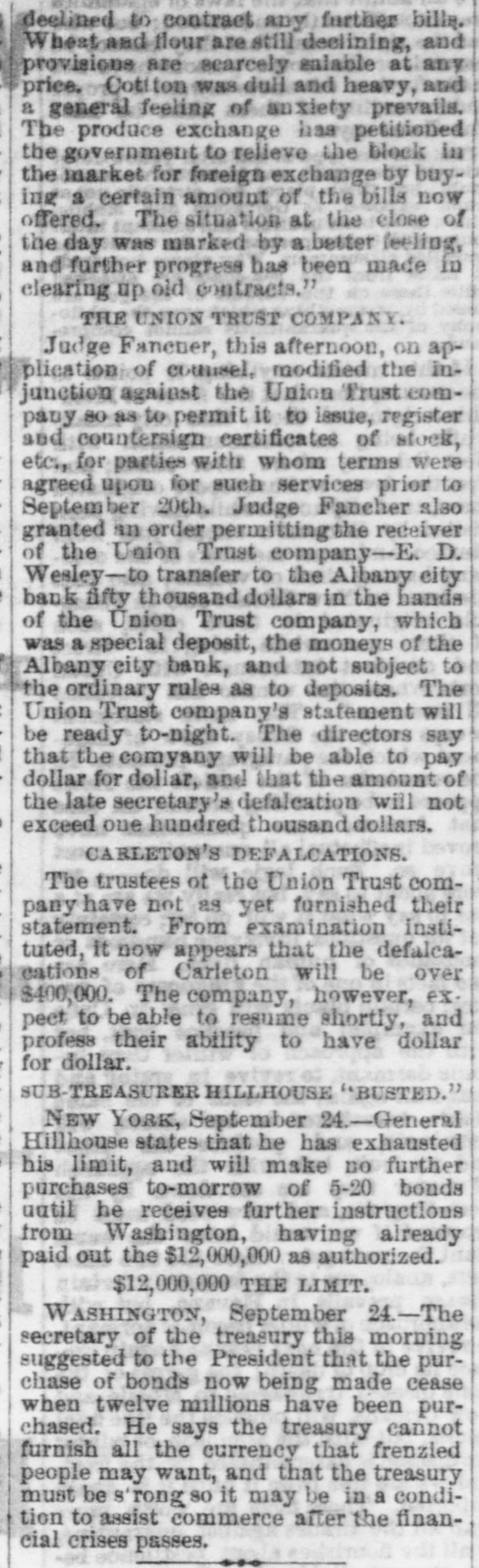 amounts are requested to deal through their bankers, and lessen the labor of the sub-treasury. 1:45 p. m.-At a meeting of bank presidents, to-day, it was resolved, in addition to the issuing of $10,000,000 loan certificates and the suspension of curin to stand each other rency by payments with large all dos amounts the will assets, be member failing to Each member was a to ascertain and expelled. committee any where appointed the ten million government bonds or any part thereof can be purchased. Said bonds are to be purchased on account of each bank and sold to the treasury, and the loss to by banks to their occurring according thereby be deposits sustained in the house, The request the and the clearing President committee Secretary the payment of the of Treasury to anticipate bonds due January, 1874. 2 p. m.-All quiet about the savings banks throughout the city. No suspensions of payment have occurred to-day. Depositors seem to be more confident. 2:10 p. m.-The following are the latest cash prices on the street for stocks: New York Central, 88 to 91; Harlem, 103 to 105; Erie 50 to 53; Lake Shore, 98 to 79; Wabash, 48 to 45 North Western, Milwaukee and St Paul, 30 33; Ohio and Wisconsin, 27 to 29; Union Pacific, 20 to 21. 2:25 m.-Judge Fancher this afternoon, on application of counsel, modified an injunction against the Union Trust company so as to permit it to issue, register and countersign certificates of stock, etc., for parties with whom terms were agreed upon for such services prior to Sept. 20th. Judge Fancher also granted an order permitting the receiver of the Union Trust company, E. D. Wesley, to transfer to the Albany City bank $50,000 in the hands of the Trust company, a special deposit. The moneys of the Albany City bank are not subject to ordinary rules as to deposits. 2:30 p. m.-The sub-treasurer has purchased up this hour, $2,100,000 bonds. 3 p. -The total purchase of bonds at the treasury to this hour is $2,200,000. SUSPENDED. Brown and Watson, gold brokers, have suspended. UNTRUE. President Courtwright, of the Canada Southern railroad company, denies the rumor that he has been obliged to cancel all contracts for the present owing to the financial crisis. He says the road was entirely finished, and the story could not, therefore, be true. UNION TRUST COMPANY DEFALCATIONS. It is asserted, on the authority of one of the examining committee of the Union Trust company, that Carleton's defalcation will be much less than it was at first supposed to be. Up to noon yesterday the defalcation discovered aggregregated but seventy-five thousand dollars. Many of the securities on which he loaned the funds of the company, are believed to be of a better character than first supposed. A FREE BANKING SCHEME. A Washington dispatch says the comp troller of the currency examined a plan for a free banking scheme yesterday, and has submitted it to the President. He states the plan has much merit. It provides for the relaxation of present rigid requirements relative to bank reserves, and for the extension of the existing limit of note circulation. Applications are constantly made by the national banks for additional circulation. The comptroller is not authorized to issue any additional circulation under the existing laws. Further legislation is necessary for that purpose. GENEROUS CARLETON. Carleton is in consultation with his friends and making arrangements to to the Union Trust company all he He is in a in and could at turn New that over Jersey, has, friend's be trunk arrested belong- house any time. A large black ing to him has been discovered in the vault of the Trust company building, containing a considerable amount of securities 'on which he had loaned the funds of the company. X-SECRETARY M'CULLOCH'S SURPRISE Ex-Secretary of the treasury McCulloch stated in interviews last night that he could hardly believe his senses when, arrival here from Europe, he was told what had taken place. Before leaving he never for a moment dreamed that with the country so prosperous anything of the kind could happen. There were good crops and goods prices for them, and the country generally was in good alcondition. Financial panics were ways senseless. When that of 1857,took it was found that there was actuno reason for it-so it be in this instance. ally bly place, Everything would of proba- confi- depended upon the maintenance dence. The great trouble was that in like the present men became and held on to all ble times frightened funds they possessed. the availaAUGUSTUS SCHELL SPEAKS AGAIN. Augustus Schell pronounces false the statement that the seventeen hundred dollar loan made by the Lake from the make a dividend. was Shore thousand was to company It Union to Trust pay for laying the second track. ACTION OF THE CLEARING HOUSE. The executive committee of the clearlot