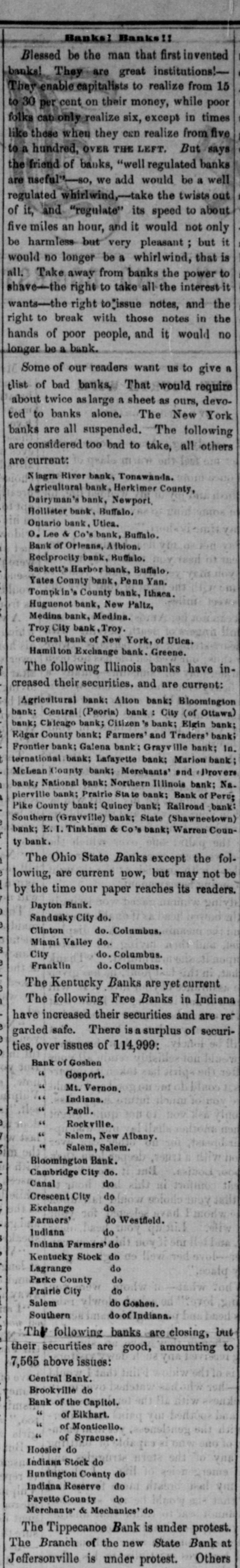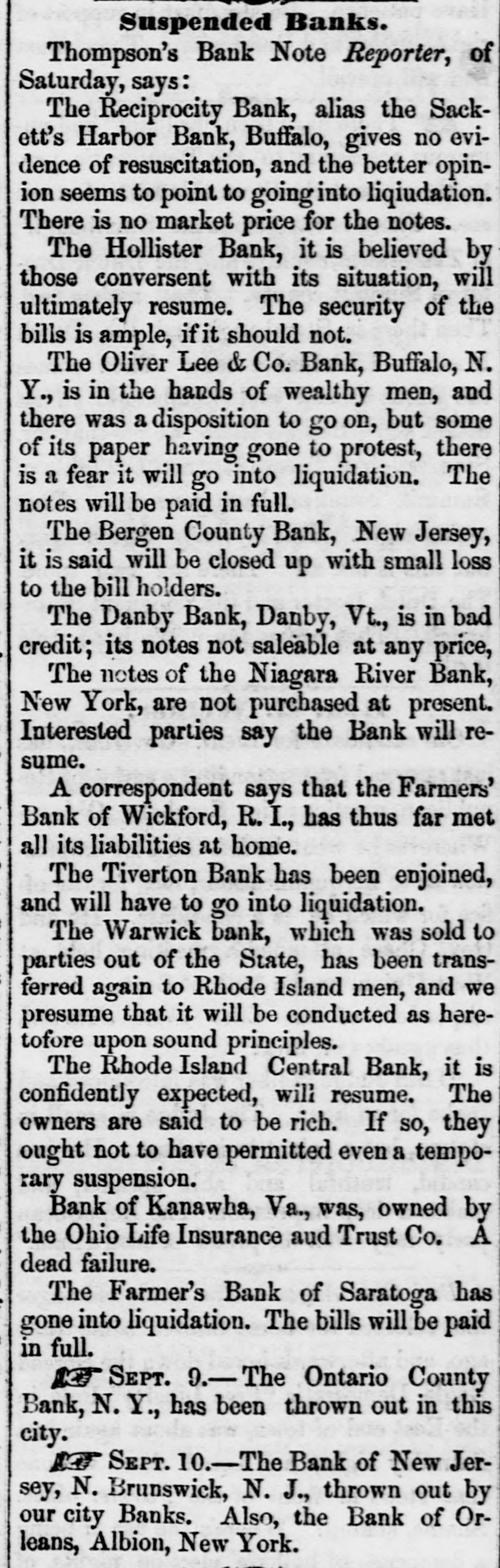 Winding up the following N. York Banks. and going into final liquidation: Agricultural Bank, Herkimer; Bank of Central New York, Utica; Bank of Hornellsville; Bank of Orleans, Albion; Chemung Co Bank, Horse Heads; Hamilton Exchange Bank, Greene; Hollister Bank, Reciprocity Bank, Sackets Harbor Bank, Oliver Lee & Co's Bank, and Pratt Bank, Buffalo; Yates Co. Bank, Pen Yan; Ontario Bank, Utica.