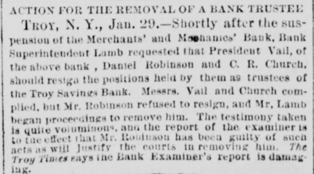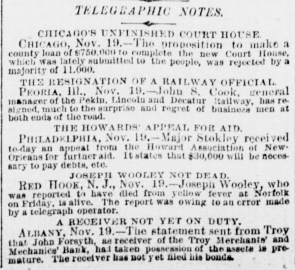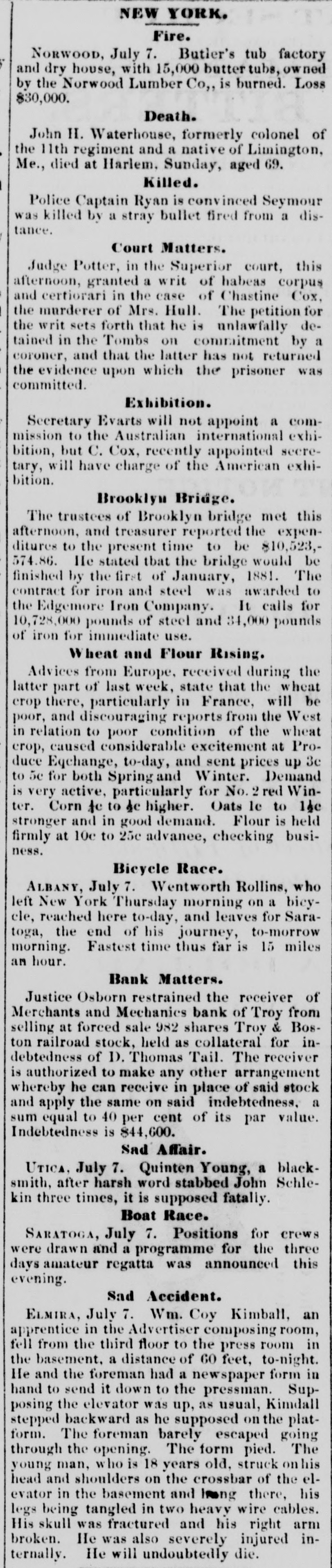 NEW YORK. Fire. NORWOOD, July 7. Butler's tub factory and dry house, with 15,000 butter tubs, owned by the Norwood Lumber Co,, is burned. Loss $30,000. Death. John H. Waterhouse, formerly colonel of the 11th regiment and a native of Limington, Me., died at Harlem. Sunday, aged 69. Killed. Police Captain Ryan is convinced Seymour was killed by a stray bullet fired from a distance. Court Matters. Judge Potter, in the Superior court, this afternoon, granted a writ of habeas corpus and certiorari in the case of Chastine Cox, the murderer of Mrs. Hull. The petition for the writ sets forth that he is unlawfally detained in the Tombs on commitment by a coroner, and that the latter has not returned the evidence upon which the prisoner was committed. Exhibition. Secretary Evarts will not appoint a commission to the Australian international exhibition, but C. Cox, recently appointed secretary, will have charge of the American exhibition. Brooklyn Bridge. The trustees of Brooklyn bridge met this afternoon, and treasurer reported the expenditures to the present time to be $10,523,574.86. He stated tbat the bridge would be finished by the first of January, 1881. The contract for iron and steel was awarded to the Edgemore Iron Company. It calls for 10,728,000 pounds of steel and 34,000 pounds of iron for immediate use. Wheat and Flour Rising. Advices from Europe, received during the latter part of last week, state that the wheat crop there, particularly in France, will be poor, and discouraging reports from the West in relation to poor condition of the wheat crop, caused considerable excitement at Produce Eqchange, to-day, and sent prices up 3c to 5c for both Spring and Winter. Demand is very active, particularly for No. 2 red Winter. Corn to to be higher. Oats le to 14c stronger and in good demand. Flour is held firmly at 10c to 25c advanee, checking business. Bicycle Race. ALBANY, July 7. Wentworth Rollins, who left New York Thursday morning on a bicycle, reached here to-day, and leaves for Saratoga, the end of his journey, to-morrow morning. Fastest time thus far is 15 miles an hour. Bank Matters. Justice Osborn restrained the receiver of Merchants and Mechanics bank of Troy from selling at forced sale 982 shares Troy & Boston railroad stock, held as collateral for indebtedness of D. Thomas Tail. The receiver is authorized to make any other arrangement whereby he can receive in place of said stock and apply the same on said indebtedness, a sum equal to 40 per cent of its par value. Indebtedness is $44,600. Sad Affair. UTICA. July 7. Quinten Young, a blacksmith, after harsh word stabbed John Schlekin three times, it is supposed fatally. Boat Race. SARATOGA, July 7. Positions for crews were drawn and a programme for the three days amateur regatta was announced this evening. Sad Accident. ELMIRA, July 7. Wm. Coy Kimball, an apprentice in the Advertiser composing room, fell from the third floor to the press room in the basement, a distance of 60 feet, to-night. He and the foreman had a newspaper form in hand to send it. down to the pressman Sun-
