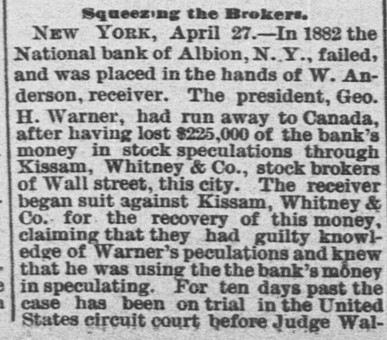 Squeezing the Brokers. NEW YORK, April 27.-In 1882 the National bank of Albion, N.Y., failed, and was placed in the hands of W. Anderson, receiver. The president, Geo. H. Warner, had run away to Canada, after having lost $225,000 of the bank's money in stock speculations through Kissam, Whitney & Co., stock brokers of Wall street, this city. The receiver began suit against Kissam, Whitney & Co. for the recovery of this money, claiming that they had guilty knowledge of Warner's peculations and knew that he was using the the bank's money in speculating. For ten days past the case has been on trial in the United States circuit court before Judge Wal-