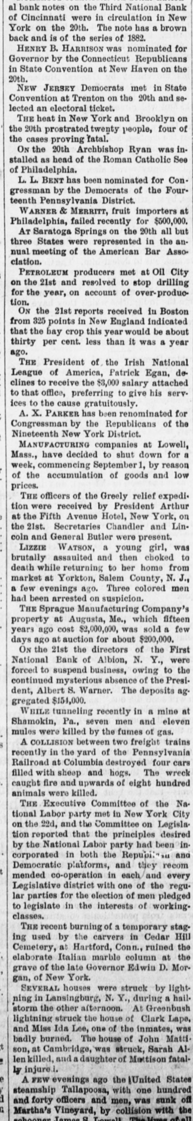 al bank notes on the Third National Bank of Cincinnati were in circulation in New York on the 20th. The note has a brown back and is of the series of 1882. HENRY B. HARRISON was nominated for Governor by the Connecticut Republicans in State Convention at New Haven on the 20th. NEW JERSEY Democrats met in State Convention at Trenton on the 20th and selected an electoral ticket. THE heat in New York and Brooklyn on the 20th prostrated twenty people, four of the cases proving fatal. ON the 20th Archbishop Ryan was inSee stalled as head of the Roman Catholic of Philadelphia. L. L. BENT has been nominated for Congressman by the Democrats of the Fourteenth Pennsylvania District. WARNER & MERRITT, fruit importers at Philadelphia, failed recently for $500,000. AT Saratoga Springs on the 20th all but three States were represented in the annual meeting of the American Bar Assoclation. PETROLEUM producers met at Oil City and to for the on account on the 21st year, resolved of stop over-produc- drilling tion. ON the 21st reports received in Boston from 325 points in New England indicated that the this year bay crop would it be about thirty per cent. less than was a year ago. THE President of the Irish National League of America, Patrick Egan, declines to receive the $3,000 salary attached to that office, preferring to give his services to the cause gratuitously. A. X. PARKER has been renominated for Congressman by the Republicans of the Nineteenth New York District. MANUFACTURING companies at Lowell, Mass., have decided to shut down for a week, commencing September 1, by reason of the accumulation of goods and low prices. THE officers of the Greely relief expedition were received by President Arthur at the Fifth Avenue Hotel, New York, on the 21st. Secretaries Chandler and Lincoln and General Butler were present. LIZZIE WATSON, a young girl, was assaulted to death to brutally while returning and then her home choked from market at Yorkton, Salem County, N. a few evenings ago. Three colored men had been arrested on suspicion. THE Sprague Manufacturing Company's property at Augusta, Me., which fifteen years ago cost $2,000,000, was sold a few days at auction for about $200,000. the directors First ON ago the 21st of the National Bank of Albion, N. Y., were forced to the suspend business, absence owing of the to continued mysterious President, Albert S. Warner. The deposits aggregated $154,000. WHILE tunneling recently in a mine at Shamokin, Pa., seven men and eleven mules were killed by the fumes of gas. S A COLLISION between two freight trains recently in the yard of the Pennsylvania Railroad at Columbia destroyed four cars filled with sheep and hogs. The wreck caught fire and upwards of eight hundred animals were killed. THE Executive Committee of the Na. tional Labor party met in New York City on and the on tion that the the reported 22d, Committee principles had been Legisla- desired by the National Labor party incorporated in both the Repupi:- all and Democratic platforms, and they recom t mended co-operation in each/and every Legislative district with one of the regular for the men parties election interests of of working- pledged to legislate in the classes. THE recent burning of a temporary staging used the carvers at the Cemetery, by Hartford, Conn., in Cedar ruined Hill elaborate Italian marble column at the grave of the late Governor Edwin D. Morgan, of New York. , SEVERAL houses were struck by lightning in Lansingburg, N. Y., during a hailstorm the other afternoon. At Greenbush lightning struck the house of Clark Lape, and Miss Ida Lee, one of the inmates, was badly burned. The house of John Matti. t son, at Cambridge, was struck, Sarah Al: lenkilled, and a daughter of Mattison fatalLy injure.i. e A FEW evenings ago the United States y steamship Tallapoosa, with one hundred d and forty officers and men, was sunk off n Martha's Vineyard, by collision with the schooner James g Lowell