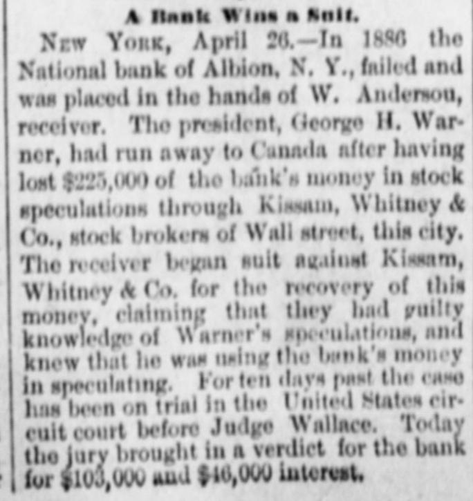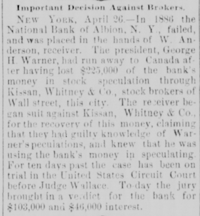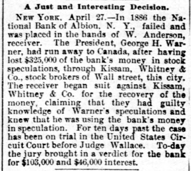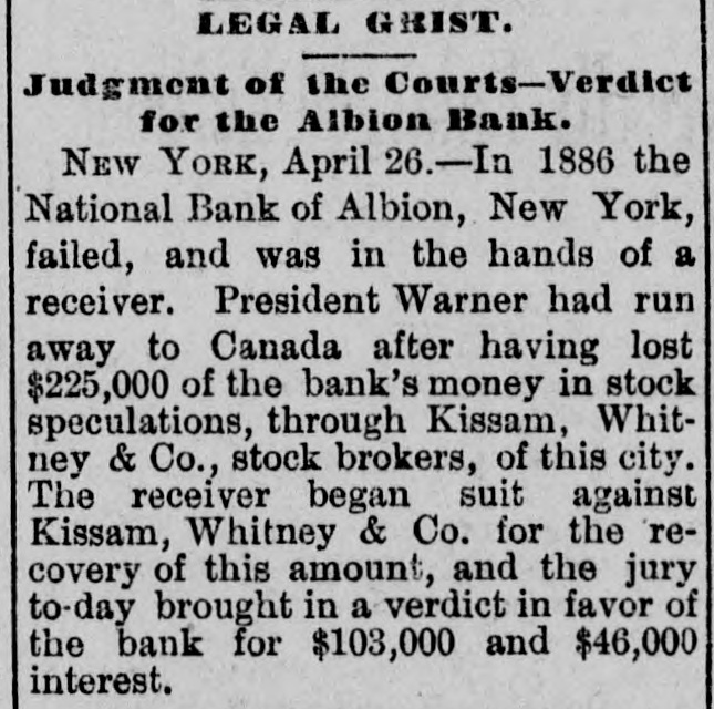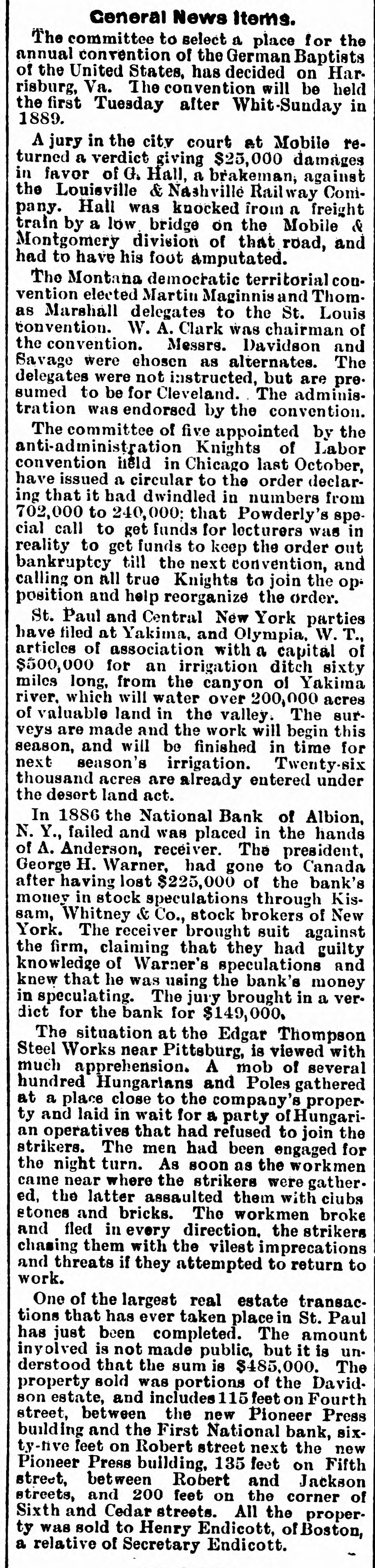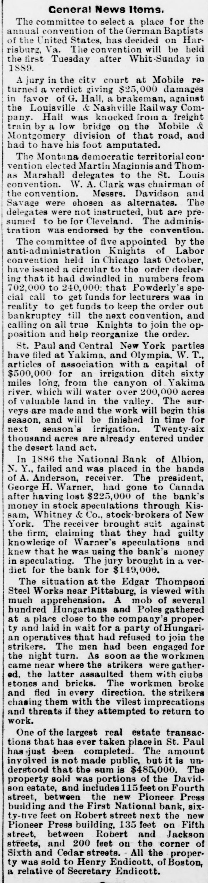 Ceneral News Items. The committee to select a place for the annual convention of the German Baptists of the United States, has decided on Harrisburg, Va. The convention will be held the first Tuesday after Whit-Sunday in 1889. A jury in the city court at Mobile returned a verdict giving $25,000 damages in favor of G. Hall, a brakeman, against the Louisville & Nashville Railway Company. Hall was knocked from a freight train by a low bridge on the Mobile & Montgomery division of that road, and had to have his foot amputated. The Montana democratic territorial convention elected Martin Maginnis and Thom. as Marshall delegates to the St. Louis convention. W. A. Clark was chairman of the convention. Messrs. Davidson and Savage were chosen as alternates. The delegates were not instructed, but are pre. sumed to be for Cleveland. The administration was endorsed by the convention. The committee of five appointed by the anti-administration Knights of Labor convention held in Chicago last October, have issued a circular to the order declaring that it had dwindled in numbers from 702,000 to 240,000; that Powderly's special call to get funds for lecturers was in reality to get funds to keep the order out bankruptcy till the next convention, and calling on all true Knights to join the op. position and help reorganize the order. St. Paul and Central New York parties have filed at Yakima, and Olympia, W. T., articles of association with a capital of $500,000 for an irrigation ditch sixty miles long, from the canyon of Yakima river. which will water over 200,000 acres of valuable land in the valley. The surveys are made and the work will begin this season, and will be finished in time for next season's irrigation. Twenty-six thousand acres are already entered under the desert land act. In 1886 the National Bank of Albion, N. Y., failed and was placed in the hands of A. Anderson, receiver. The president, George H. Warner, had gone to Canada after having lost $225,000 of the bank's money in stock speculations through Kissam, Whitney & Co., stock brokers of New York. The receiver brought suit against the firm, claiming that they had guilty knowledge of Warner's speculations and knew that he was using the bank's money in speculating. The jury brought in a verdict for the bank for $149,000. The situation at the Edgar Thompson Steel Works near Pittsburg, is viewed with much apprehension. A mob of several hundred Hungarians and Poles gathered at a place close to the company's property and laid in wait for a party of Hungarian operatives that had refused to join the strikers. The men had been engaged for the night turn. As soon as the workmen came near where the strikers were gather. ed, the latter assaulted them with clubs stones and bricks. The workmen broke and fled in every direction. the strikers chasing them with the vilest imprecations and threats if they attempted to return to work. One of the largest real estate transactions that has ever taken place St. Paul has just been completed. The amount inyolved is not made public, but it is un. derstood that the sum is $485,000. The property sold was portions of the Davidson estate, and includes 115 feet on Fourth street, between the new Pioneer Press building and the First National bank, sixty-nve feet on Robert street next the new Pioneer Press building, 135 feet on Fifth street, between Robert and Jackson streets, and 200 feet on the corner of Sixth and Cedar streets. All the property was sold to Henry Endicott, of Boston, a relative of Secretary Endicott.
