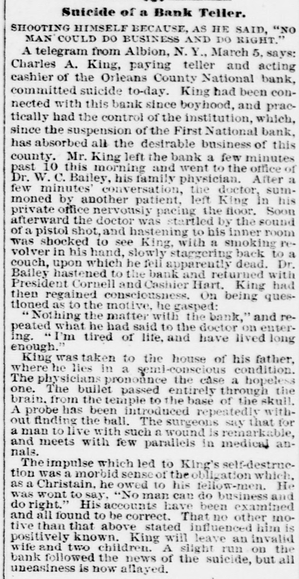 Suicide of a Bank Teller. SHOOTING HIMSELF BECAUSE, AS HE SAID, "NO MAN COULD DO BUSINESS AND DO RIGHT." A telegram from Albion, N. Y., March 5, says: Charles A. King, paying teller and acting cashier of the Orleans County National bank, committed suicide to-day. King had been connected with this bank since boyhood, and practically had the control of the institution, which, since the suspension of the First National bank, has absorbed all the destrable business of this county. Mr. King left the bank a few minutes past 10 this morning and went to the office of Dr. W. C. Bailey, his family physician. After a few minutes' conversation, the doctor, summoned by another patient, left King in his private office nervously pacing the floor. Soon afterward the doctor was startled by the sound of a pistol shot, and hastening to his inner room was shocked to see King, with a smoking revolver in his hand, slowly staggering back to a couch, upon which he fell apparently dead. Dr. Bailey hastened to the bank and returned with President Cornell and Cashier Hart. King had then regained consciousness. On being questioned as to the motive, he gasped: "Nothing the matter with the bank," and repeated what he had said to the doctor on entering. I'm tired of life, and have lived long enough." King was taken to the house of his father, where he lies in a semi-conscious condition. The physicians pronounce the case a hopeless one. The bullet passed entirely through the brain. from the temple to the base of the skull. A probe has been introduced repeatedly without finding the ball. The surgeons say that for a man to live with such a wound is remarkable, and meets with few parallels in medical annals. The impulse which led to King's self-destruction was a morbid sense of the obligation which, as a Christain, he owed to his fellow-men. He was wont to say, "No man can do business and do right." His accounts have been examined and all found to be correct. That no other motive than that above stated influenced him is positively known. King will leave an invalid wife and two children. A slight run on the bank followed the news of the suicide, but all uneasiness is now allayed.