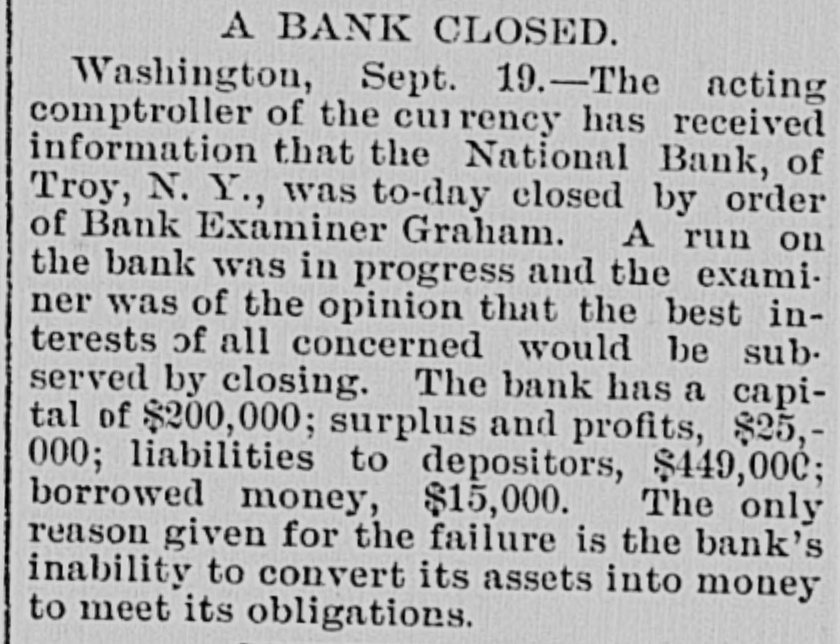 The National Bank of Troy ... closed its doors this morning because of a run on the bank, and is now in charge of United States Bank Examiner Graham.