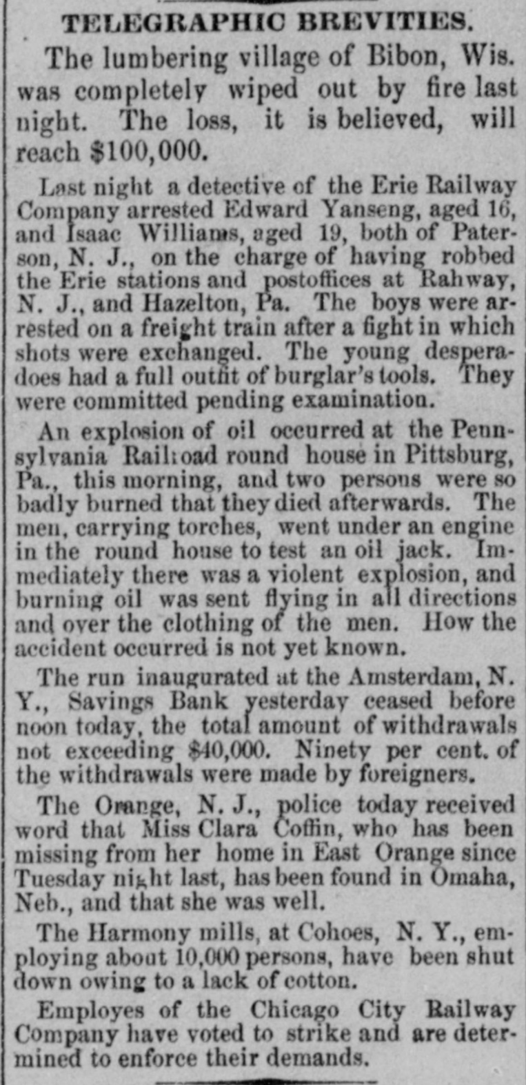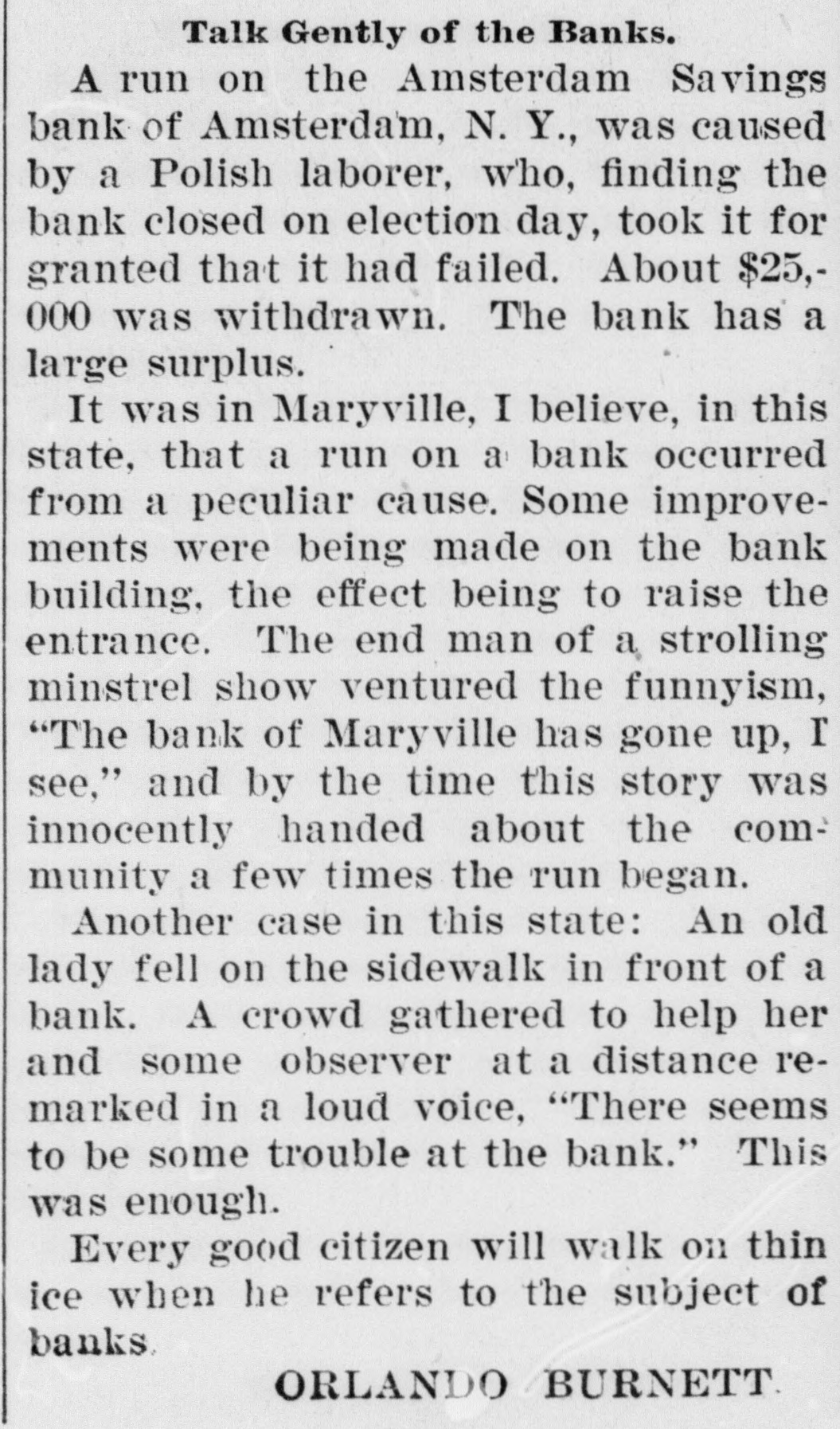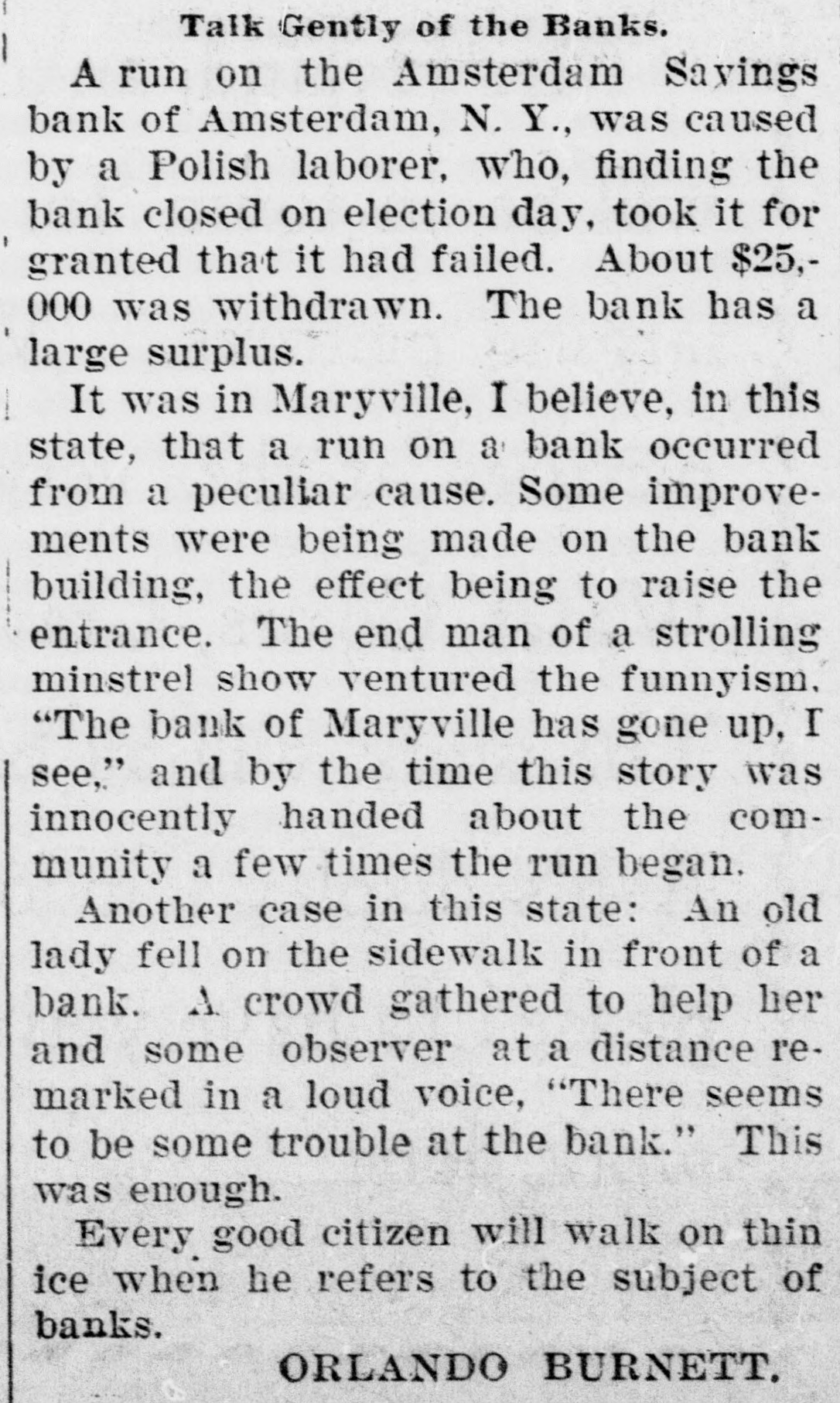 A run on the Amsterdam Savings bank of Amsterdam, N. Y., was caused by a Polish laborer, who, finding the bank closed on election day, took it for granted that it had failed. About $25,000 was withdrawn. The bank has a large surplus.