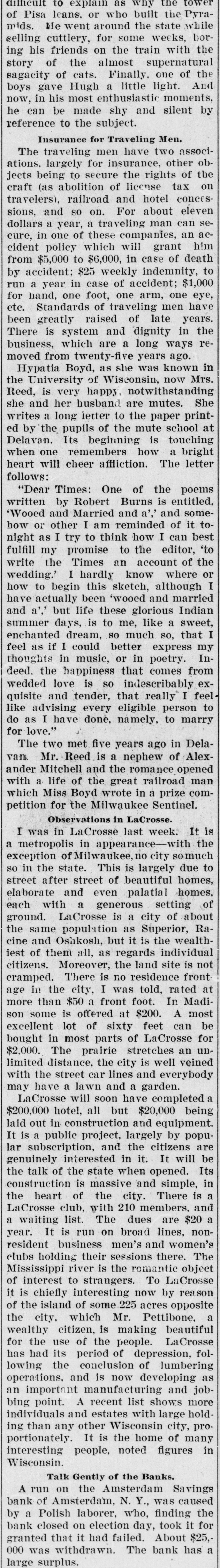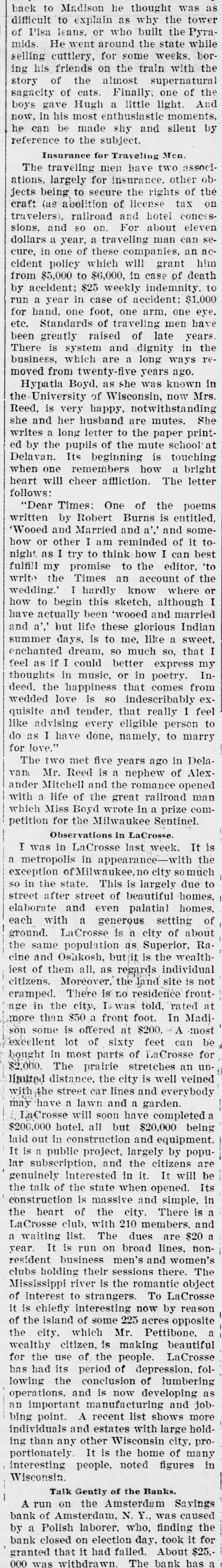 Hypatia Boyd, as she was known in the University of Wisconsin, now Mrs. Reed, is very happy, notwithstanding she and her husband are mutes. She writes a long letter to the paper printed by the pupils of the mute school at Delavan. Its beginning is touching when one remembers how a bright heart will cheer affliction. The letter follows: