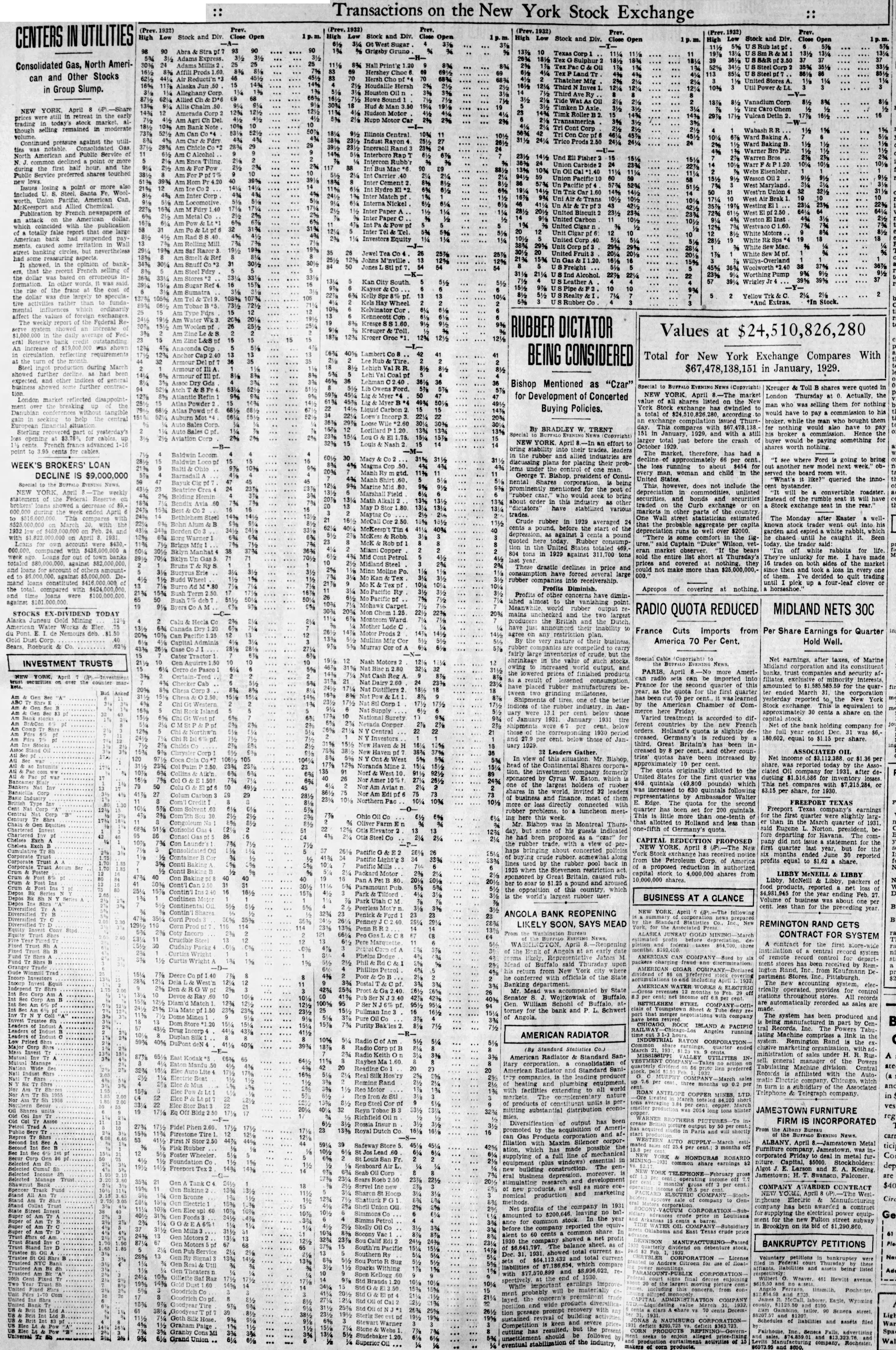 (Prev. 1932) Prev. (Prev. 1932) Prev. (Prev. 1932) Prev. Prev. (Prev. High Low Stock and Close Open High Stock and Div. Open High Low Stock and Div. Stock and Div. Open Open High Sugar 98 90 93 90 90 Grigsby Abra Stra 10 Texas Corp 1 11 Adams Express. 3½ Sulphur 18% 181/4 39 24 Adams 25 25 8% Hall Print'g 8% Pac 52% Steel 35% 83 69 Hershey Choc 69 Land 113 Steel Air 70 Hersh 70 68% Thatcher United 16% Alaska Houdaille Hersh 2% Third 10% Power Corp. Houston Oil Third Ry Allied Howe Sound Tide Wat As Oil Vanadium 8% Allis .50 91/4 Hud Man 50 Timken Corp 11% Hudson Motor 23 14% Timk Roller Vulcan 161/2 16 Am 5% Hupp Motor Car 2% 2% Agri Transamerica 3% 10% Am Bank Tri Cont Corp 1% Wabash 1% Am Illinois Central Tri Con Cor Indust Rayon Trico 2.50 29 Ward Baking 28% Am Chicle Ingersoll Rand Warner Alcohol Interboro Rap Und Ell Fisher Warren Bros Intercon Rubb'r Carbide Warr 2% 117 Bus Mac 10% Un Oil Webs Carrier 40 Union Pacific 10 Wesson Oil 2 39% Am Inter Cement Un Pacific West Hydro Un Tnk Car 31 West'rn Union 4% Inter Uni Trans West Air Brak Am Interna Nickel Un Air Westing 23% Fdry Inter Paper United Biscuit West 641/4 Am Paper United Carbon Weston Inst 101/2 1% United Westvaco Inter Tel 5% 5% 12 10 White Motors 8½ 18 Investors Equity White 18 Am Mill 29% White Sew Mac Razor Jewel Tea 26 United Fruit 3 White Sew 18% 12% Johns 15% 12% 12% 38 37% 45% 36% Woolworth Ind Alcohol. 22½ Worthing Pump 22 Am Stores 39% 37 Leather Wrigley 39% Sugar Ref 10 10 9% Kelly Spr pf. Realty 5 2 Yellow 106 101/4 105% Am Hay 5% Rubber Co Extras. Stock. 3 Kelvinator 25 Kennecott Am 20% 8% Kresge 9% to 30% RUBBER Kreuger Values at $24,510,826,280 3% Kroger Groc *1. 12% 15 15 Am 12% Cop 40% Lambert 42 41 41 CONSIDERED 12% Anchor Total for New York Exchange Compares With Armour Lehigh $67,478,138,151 in January, 1929. Armour Armour Val pf Assoc Lehman 36 36 Gds Bishop Mentioned as "Czar" Special to BUFFALO (Copyrisht) Kreuger & Toll shares were quoted in 50 NEW YORK, April 8.-The market London Thursday at Actually. the 8% 9% Myer 47 for Development of Concerted 49% all shares the Atlas Powder man who was selling them for nothing Buying Policies. York dwindled Liquid Carbon would have to pay commission to his of according 151% 521/4 Incorp 3. Auburn compilation issued broker while the man who bought them Loose compares $67 nothing to pay Lorillard By BRADLEY W. TRENT in January, with still his broker Hence the Aviation Corp 2% larger total just before the crash of buyer would be paying something for 32% 15 YORK. April an effort to Louis Nash October shares worth nothing. stability into their Baldwin The market, therefore, has had Locom in the rubber allied 30 industries are Macy decline per cent., see where Ford is going to bring Baldwin discussing plans for placing their prob4% Magma 50. the loss to $454 for out week. ob10% under the one Manh and child in the served the board wit. Barnsdall George T. Bishop, president of Conti4% Manh 60. United States queried the innonental Shares corporation, is being 121/4 This, does not include the cent bystander. Marine 80. 9% 23 Beatrice 24 prominently mentioned for the post depreciation in commodities, unlisted be convertible roadster. "rubber who would to bring Belding securities. and bonds and securities Instead the rumble seat will have Math 13% about in this industry as other Bendix traded on the Curb exchange on Stock exchange in the rear.' May Stor "dictators have stabilized various markets in other parts of the country. 14 One Wall street statistician estimated The Monday after Easter wellCrude rubber in 1929 averaged Bohn that the probable aggregate known stock went into his McKeesp't cents pound, before the start of the 40 runs over $2000. garden white McKess depression. as against pound 12% 6% "There some the fig- he until caught it. Seen quoted here today. Rubber consumpMcK Rob of said Captain "Duke" Wilson, vet- the trader tion in the United States totaled 469,501/4 Miami Copper eran market "If the bears 'I'm rabbits for life. Bklyn 804 tons in 1929 against tons Cont Petrol sold the entire list short at Thursday's They unlucky for me. have made Bklyn Midland Steel 2% prices and covered nothing. they 16 trades on both sides of the market Bruns These drastic declines in price and Minn Moline Po. could not make more than $25,000,000,- since then and took loss in every one have forced several large them I've decided quit trading Budd Tex rubber companies receivership. until up four-leaf clover or 13 Tex 101/4 Profits Diminish. Apropos of covering at nothing, a 21% Pacific Ry Profits other dimin65 to the vanishing point. Carpet world rubber output re- RADIO QUOTA REDUCED MIDLAND NETS 30C 30% Chem 22% 20% mains unchecked the two largest Montgom 2% 21/4 21/4 producers the British and the Dutch, Mother just announced their inability to France Cuts Imports from Per Share Earnings for Quarter ing Prods on restriction any plan. Cor By the their America 70 Per Cent. Hold Well. Capital Adminis Murray Cor of are fairly large crude, but the Tractor Special Net earnings, after taxes, of Marine 10 shrinkage the of such stocks 121/4 12 NEWS. owing output, and Midland and its 5% 32 PARIS. April 8.-No more Amerithe prices of products banks, trust companies and security afNEW April 3% Reg 87/8 result of sets can imported trust on over the mar- 24 4% 5% 23% 231/4 have placed rubber manufacturers be- France for the of this amounted 585 for the quar20% Distillers 18 year. the quota for first quarter Bid Asked grinding millstones. ter ended March 31, the corporation 87/8 has been cut per learned the New York Shipments one of the better Corp by the American Chamber of Comindices of the industry. Jan- Stock This is Gen Supply here Friday uary were per hose 30 cents a share on the National Surety 9% Varied is accorded to dif. capital of January 1931. January 1931 Br&Con Nevada 27/8 2½ ferent countries by French shipments below Net the bank holding company for Comp Central 22 those orde