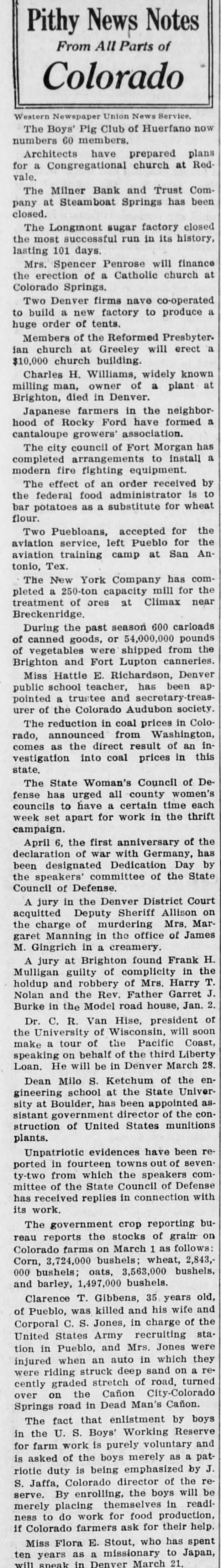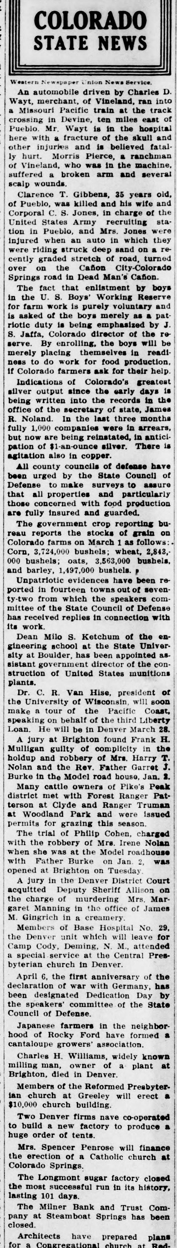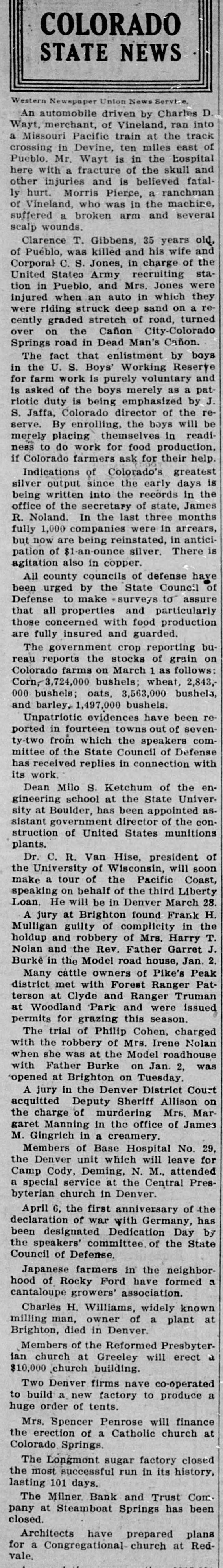 COLORADO STATE NEWS Western Newspaper Union News Service. An automobile driven by Charles D. Wayt, merchant, of Vineland, ran into Pacific train at the track in Devine, ten Mr. Wayt is in crossing a Pueblo. Missouri miles the hospital east of with a fracture of the and is other here injuries believed ranchman skull fatal- and ly hurt. Morris Pierce, a of Vineland, who was in the machine, suffered a broken arm and several scalp wounds. Clarence T. Gibbens, 35 years old, of Pueblo, was killed and his wife and C. S. Jones, in States Army tion and Mrs. Corporal United in Pueblo, recruiting charge Jones of were sta- the injured when an auto in which they were riding struck deep sand on a recently graded stretch of road, turned over on the Canon City-Colorado Springs road in Dead Man's Canon. The fact that enlistment by boys in the U. S. Boys' Working Reserve for farm work is purely voluntary and is asked of the boys merely as a patriotic duty is being emphasized by J. S. Jaffa, Colorado director of the re serve. By enrolling, the boys will be merely placing themselves in readiness to do work for food production. If Colorado farmers ask for their help Indications of Colorado's greatest since the written into the silver being output records early state, days James in the is office of the secretary of R. Noland. In the last three months fully 1,000 companies were in arrears, but now are being reinstated, in anticipation of $1-an-ounce silver. There is agitation also in copper. councils of been the State All county urged by defense Council have of Defense to make surveys to assure all and concerned with food that those properties particularly production are fully insured and guarded. The government crop reporting bureau reports the stocks of grain on Colorado farms on March 1 as follows: Corn, 3,724,000 bushels; wheat, 2,843, 000 bushels; oats, 3,563,000 bushels. and barley, 1,497,000 bushels. P Unpatriotic evidences have been re in fourteen towns from which the ported ty-two speakers out of of Defense seven- committee of the State Council has received replies in connection with its work. Dean Milo S. Ketchum of the engineering school at the State University at Boulder, has been appointed as sistant government director of the construction of United States munitions plants. R. Van Hise, the of Dr. University C. Wisconsin, president will soon of make a tour of the Pacific Coast, speaking on behalf of the third Liberty Loan. He will be in Denver March 28. A jury at Brighton found Frank H. Mulligan guilty of complicity in the holdup and robbery of Mrs. Harry T. Nolan and the Rev. Father Garret J. Burke in the Model road house, Jan. 2. cattle owners of Pike's Peak met with Forest terson at and district Many Clyde Ranger Ranger Truman Patat Woodland Park and were issued permits for grazing this season. The trial of Philip Cohen, charged of Mrs. was at the when with the she robbery Model Irene roadhouse Nolan with Father Burke on Jan. 2, was opened at Brighton on Tuesday A jury in the Denver District Court acquitted Deputy Sheriff Allison on the charge of murdering Mrs. Margaret Manning in the office of James M. Gingrich in a creamery Members of Base Hospital No. 29, the Denver unit which will leave for Camp Cody, Deming, N. M., attended a special service at the Central Presbyterian church in Denver. April 6, the first anniversary of the declaration of war with Germany, has been designated Dedication Day by the speakers' committee of the State Council of Defense. Japanese farmers in the neighborhood of Rocky Ford have formed a cantaloupe growers' association. Charles H. Williams, widely known milling man, owner of a plant at Brighton, died in Denver. Members of the Reformed Presbytera ian church at Greeley will erect $10,000 church building. Two Denver firms nave co-operated to build a new factory to produce a huge order of tents. Mrs. Spencer Penrose will finance the erection of a Catholic church at Colorado Springs. The Longmont sugar factory closed the most successful run in its history, lasting 101 days. The Milner Bank and Trust Company at Steamboat Springs has been closed. Architects have prepared plans for a Congregational church at Red