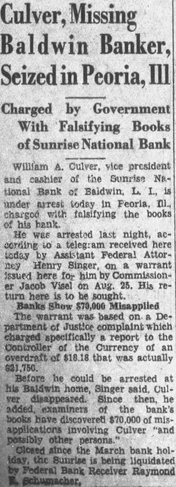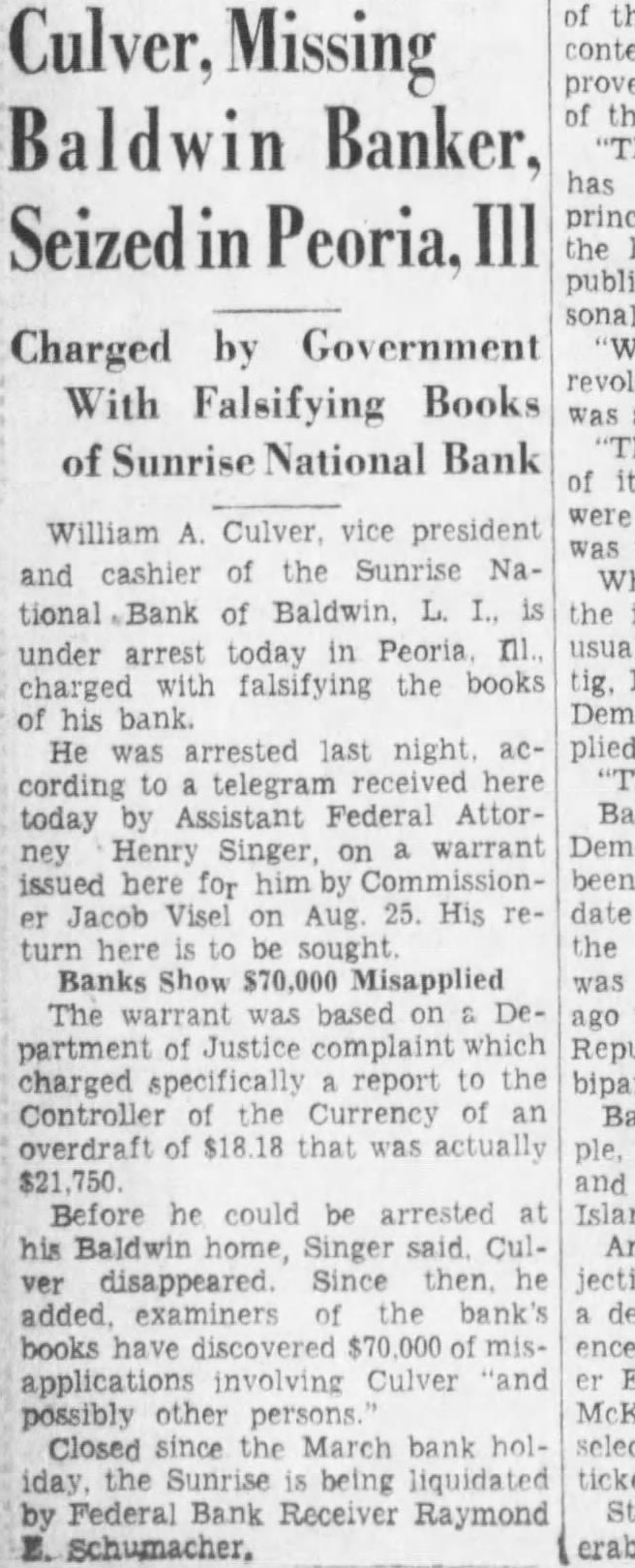 Banker, Charged by Government With Falsifying Books Sunrise National Bank William Culver, vice president and cashier of the Sunrise NRtional Bank of Baidwin, I., under arrest today in Peoria, III., charged with falsifying the books He was arrested last night, according here today Assistant Federal Attorney Henry Singer, on warrant issued here him Jacob Visel Aug. 25. His here sought. Show $70,000 Misapplied The was based on partment of Justice charged report to the Controller the Currency of overdraft that was actually Before he could be arrested his Baldwin Singer said, Cul. disappeared. Since then, he added, examiners the bank's books have discovered applications involving Culver "and possibly other Closed since the March bank holiday, the Sunrise liquidated Federal Bank Receiver Raymond