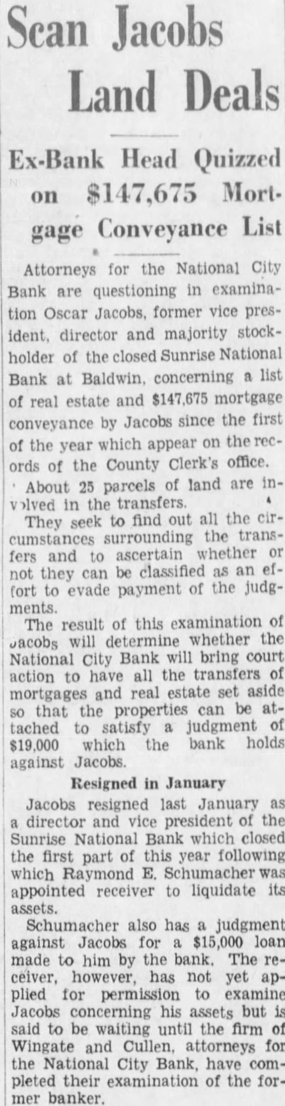 Scan Jacobs Land Deals Ex-Bank Head Quizzed on $147,675 Mortgage Conveyance List Attorneys for the National City Bank are questioning in examination Oscar Jacobs, former vice president. director and majority stockholder of the closed Sunrise National Bank at Baldwin, concerning a list of real estate and $147,675 mortgage conveyance by Jacobs since the first of the year which appear on the records of the County Clerk's office. About 25 parcels of land are inolved in the transfers. They seek to find out all the circumstances surrounding the transfers and to ascertain whether or not they can be classified as an effort to evade payment of the judgThe result of this examination of vacobs will determine whether the National City Bank will bring court action to have all the transfers of mortgages and real estate set aside so that the properties can be attached to satisfy a judgment of $19,000 which the bank holds against Jacobs. Resigned in January Jacobs resigned last January as director and vice president of the Sunrise National Bank which closed the first part of this year following which Raymond E. Schumacher was appointed receiver to liquidate its assets. Schumacher also has a judgment against Jacobs for $15,000 loan made to him by the bank. The receiver, however, has not yet applied for permission to examine Jacobs concerning his assets but is said to be waiting until the firm of Wingate and Cullen, attorneys for the National City Bank, have completed their examination of the former banker.