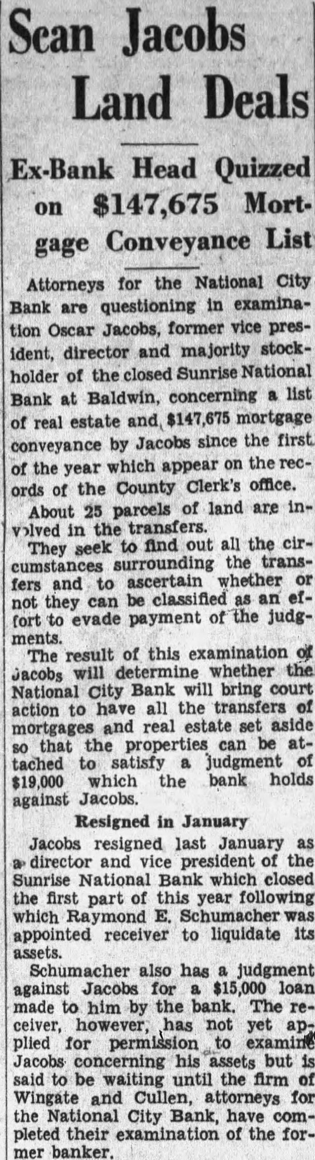 Sean Jacobs Land Deals Ex-Bank Head Quizzed on $147,675 Mortgage Conveyance List Attorneys for the National City Bank are questioning in examination Oscar Jacobs, former vice president, director and majority stockholder of the closed Sunrise National Bank at Baldwin, concerning a list of real estate and $147,675 mortgage conveyance by Jacobs since the first. of the year which appear on the records of the County Clerk's office. About 25 parcels of land are involved in the transfers. They seek to find out all the circumstances surrounding the transfers and to ascertain whether or not they can be classified as an effort to evade payment of the judgments. The result of this examination of Jacobs will determine whether the National City Bank will bring court action to have all the transfers of mortgages and real estate set aside so that the properties can be attached to satisfy a judgment of $19,000 which the bank holds against Jacobs. Resigned in January Jacobs resigned last January as a director and vice president of the Sunrise National Bank which closed the first part of this year following which Raymond E. Schumacher was appointed receiver to liquidate its assets. Schumacher also has a judgment against Jacobs for a $15,000 loan made to him by the bank. The receiver, however, has not yet applied for permission to examine Jacobs concerning his assets but is said to be waiting until the firm of Wingate and Cullen, attorneys for the National City Bank, have completed their examination of the former banker.