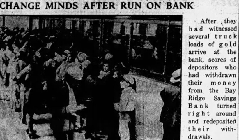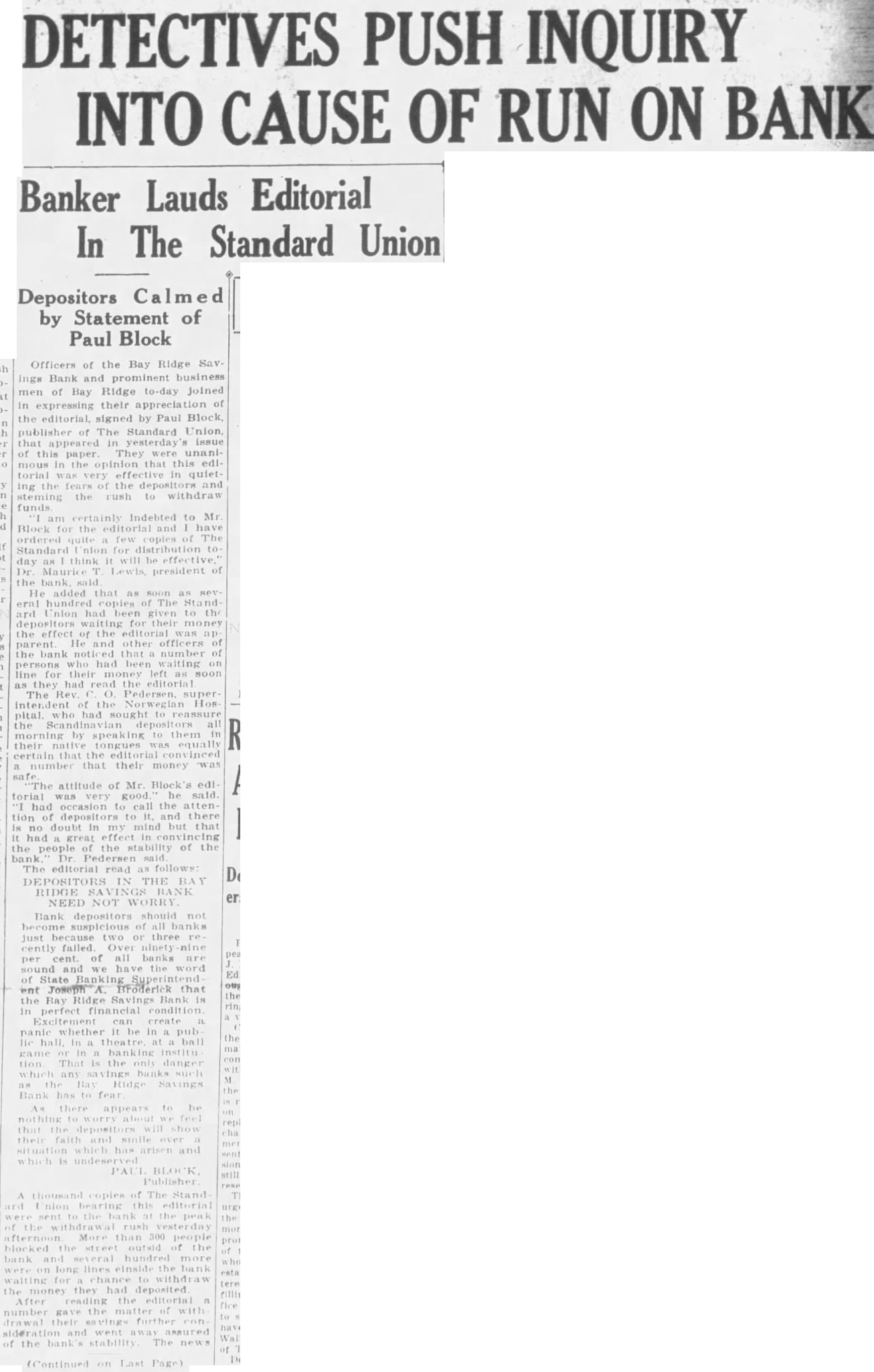 DETECTIVES PUSH INQUIRY INTO CAUSE OF RUN ON BANK Banker Lauds Editorial In The Standard Union Depositors Calmed by Statement of Paul Block Officers of the Bay Ridge SavIngs Bank men of Bay Ridge to-day joined in expressing their appreciation of the editorial. signed by Paul Block, publisher of The Standard Union, that appeared in yesterday' issue of this paper. They were unanimous in the opinion that this torial very effective in quiet ing the steming the rush to withdraw funds Indebted to Mr Block for the editorial and have few copies The ordered Standard Union for distribution to day as think will effective,' Dr. Maurice Lewis, president of the said He added that as eral The Stand ard Union had been given to the depositors for money the effect of the editorial parent He and other officers the bank that number of persons had waiting line their left soon as they had the editorial The Rev. super intendent the Hos pital who had sought to reassure the depositors by speaking their tongues was equally certain that the number that their money attitude of Mr Block's edi had the atten and there is no doubt in my but that had great effect the people the stability of the bank. Dr. Pedersen editorial read as follows DEPOSITORS IN THE BA NEED NOT WORRY Bank depositors should not of all banks just because two or three failed Over ninety nine per cent. of all banks sound and we have the word of State ent Joseph A Broderick that the Bay Ridge Savings Bank is perfect create in tion That danger which any banks Savings Bank has appears to be that faith has arisen and is Publisher copies of The Stand editorial the the 300 the outsid the bank hundred long lines the waiting chance withdraw the money they had deposited After reading editorial fice number gave the and the stability The (Continued on Last Page)
