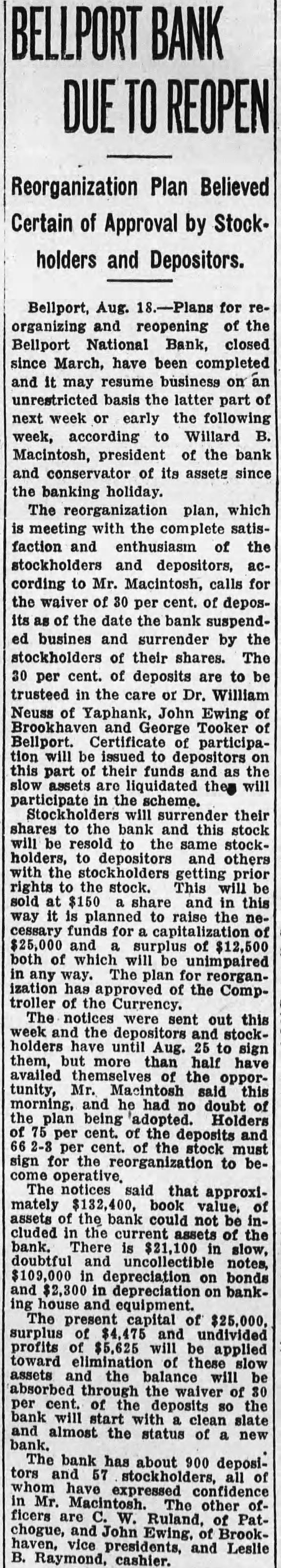 BELLPORT BANK DUE TO REOPEN Reorganization Plan Believed Certain of Approval by Stockholders and Depositors. Bellport, Aug. 18.-Plans for reorganizing and reopening of the Bellport National Bank, closed since March, have been completed and it may resume business on an unrestricted basis the latter part of next week early the following week, to Willard B. Macintosh, president of the bank and conservator of its assets since the banking holiday. The reorganization plan, which meeting with the complete satisfaction enthusiasm the stockholders depositors, according to Mr. Macintosh, calls for the waiver of 30 per cent. of deposits of the date the bank suspended busines and surrender by the stockholders of their shares. The 30 per cent. of deposits to be trusteed in the care or Dr. William Neuss John Ewing Brookhaven Tooker Bellport. Certificate participation will be issued depositors this part their funds as the assets are liquidated they will participate the will their bank and this stock will be same stockholders, to depositors and others with the getting rights the stock. This will share and in this way it is to raise the necessary for $25,000 and of both will any The plan reorganization has of the Comptroller of the Currency. The notices were sent out this week and the depositors and stock. holders until Aug. them, more than half availed the tunity, Macintosh this morning, and he had no doubt the plan adopted. Holders of per cent. of the deposits and cent. the stock sign for the reorganization to beoperative The notices said that approximately value, assets of the bank could not be cluded the assets of the bank. There slow, doubtful uncollectible notes, $109,000 in depreciation bonds and in depreciation bankand equipment. capital $25,000, surplus and undivided profits of $5,625 will be applied toward elimination these assets the balance will absorbed the waiver of per deposits the slate and almost the status of The bank has about 900 depositors stockholders, all expressed confidence in other ficers Ruland. of chogue, haven. and John Ewing. and Leslie B. Raymond, cashier.
