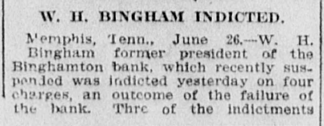 W. H. BINGHAM INDICTED. Memphis, Tenn., June 26.---W. H. Bingham former president of the Binghamton bank, which recently suspended was indicted yesterday on four charges, an outcome of the failure of the bank. Thre of the indictments