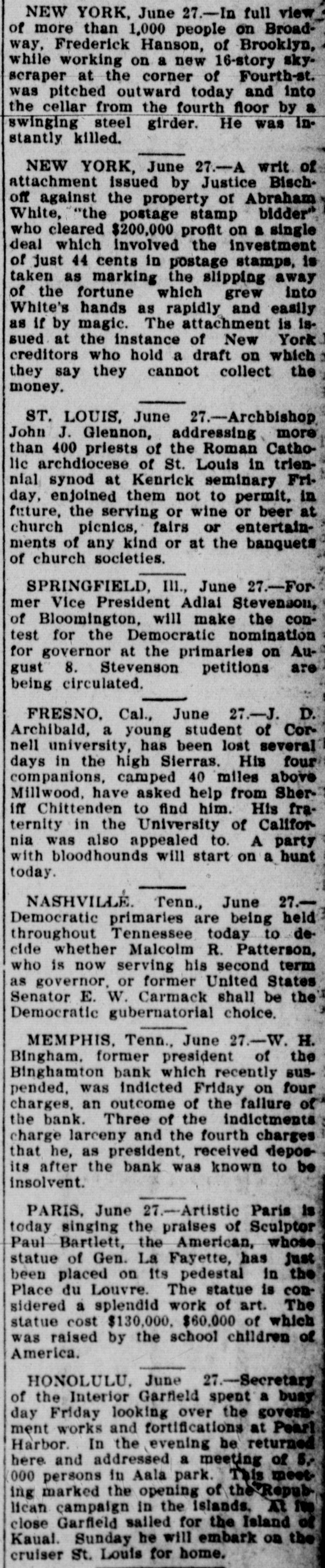 of more than 1,000 people on Broadway, Frederick Hanson, of Brooklyn, while working on a new 16-story skyscraper at the corner of Fourth-st. was pitched outward today and into the cellar from the fourth floor by a swinging steel girder. He was Instantly killed. NEW YORK, June 27.-A writ of attachment issued by Justice Bischoff against the property of Abraham White, "the postage stamp bidder who cleared $200,000 profit on a single deal which involved the investment of just 44 cents in postage stamps, is taken as marking the slipping away of the fortune which grew into White's hands as rapidly and easily as if by magic. The attachment is issued at the instance of New York creditors who hold a draft on which they say they cannot collect the money. ST. LOUIS, June 27.-Archbishop John J. Glennon, addressing more than 400 priests of the Roman Catholic archdiocese of St. Louis in triennial synod at Kenrick seminary Friday, enjoined them not to permit, in future, the serving or wine or beer at church pienics, fairs or entertainments of any kind or at the banquets of church societies. SPRINGFIELD, III., June 27.-Former Vice President Adiai Stevenson, of Bloomington, will make the contest for the Democratic nomination for governor at the primaries on August 8. Stevenson petitions are being circulated. FRESNO. Cal., June 27.-J. D. Archibald, a young student of Cornell university, has been lost several days in the high Sierras. His four companions, camped 40 miles above Millwood, have asked help from Sheriff Chittenden to find him. His fraternity in the University of California was also appealed to. A party with bloodhounds will start on a hunt today. NASHVILLE. Tenn., June 27.Democratic primaries are being held throughout Tennessee today to decide whether Malcolm R. Patterson, who is now serving his second term as governor, or former United States Senator E. W. Carmack shall be the Democratic gubernatorial choice. MEMPHIS, Tenn., June 27.-W. H. Bingham. former president of the Binghamton bank which recently suspended, was indicted Friday on four charges, an outcome of the failure of the bank. Three of the indictments charge larceny and the fourth charges that he, as president, received deposits after the bank was known to be insolvent. PARIS. June 27.-Artistic Paris is today singing the praises of Sculptor Paul Bartlett, the American, whose statue of Gen. La Fayette, has just been placed on its pedestal in the Place du Louvre. The statue is considered a splendid work of art. The statue cost $130,000. $60,000 of which was raised by the school children of America. HONOLULU. June 27.-Secretary of the Interior Garfield spent a busy day Friday looking over the government works and fortifications at Pearl Harbor. In the evening be returned here and addressed a meeting of 5.000 persons in Aala park. This meeting marked the opening of the Republican campaign in the islands. At its close Garfield salled for the Island of Kaual. Sunday he will embark on the cruiser St. Louis for home.