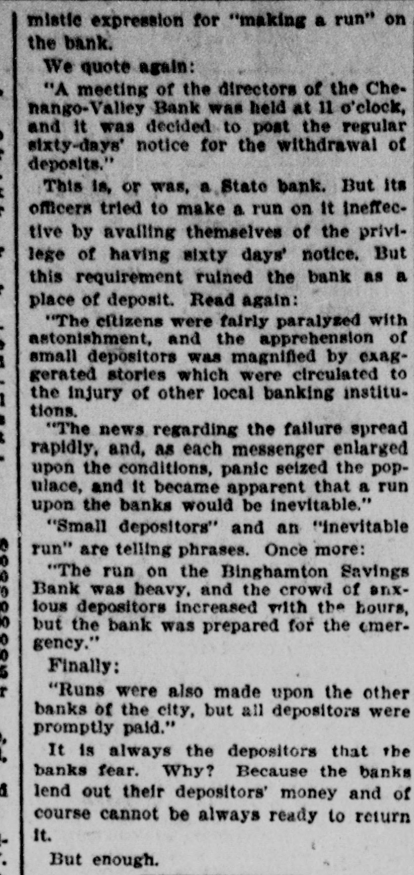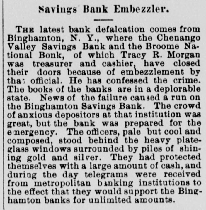 e 1116 TWO BINGHAMTON CONCERNS CLOSE THEIR DOORS. One of them a National and the Other a State Institution-A Claim Made That the Cashier of the Two Is a Defaulter-He and the President Burglarize the Vaults, But Are Compelled to Return Their Plander-Runs Made on Two Other Banks. Binghamton, N. Y., Jan. 24.-At noon the controller of the currency assumed charge of the National Broome County Bank. This bank was voluntarily closed by its officials this morning They feared a run, which the bank was totally unprepared to meet It is asserted that the Chenango Valley Bank, a state bank. which was also closed. has securities deposited with the Bing hamton Savings Bank sufficient to meet all obligations. The bank examiners have been at work on the books of the savings bank for three days. They refuse to divulge the result of their investigations, but it is evident that the affairs of the bank are badly tangled The withdrawal of deposits at the Bing hamton Savings Bank continued throughout the day. There was a run on the Binghamton Trust Company. A both banks the offl. cials say they have sufficient funds to pay every deposit in full, and more currency on the way. A meeting of the directors of the Chenango Valley Bank was held at 11 o'clock and it was decided to demand the regular 60-day notice for the withdrawal of de. posits, The officers of the bank state that there are sufficient securities in the hands of the bank examiner to pay every depositor in full and leave good surplus Detective Stephenson of the local police force was ordered by Bank Examiner Clarke yesterday afternoon to watch the Chenango Valley Savings bank which has its office in the Phelps Bank building In company with Officer Heath, the de tective remained in the vicinity all night About 4 o'clock this morning Tracy R Morgan, the treasurer of the bank, was seen to enter the bank He came out again in a few minutes and went to the grocery store of D. L. Brownson, who the president of the bank. A few minutes later he came out with a bushe basket followed by Mr. Brownson and both of them returning to the bank Half an hour later the two men came out with the basket full of books and papers. They went up Chenango street, followed by Detec tive Stephenson and Officer Heath. Detective Stephenson requested Morgan and Brownson to return the books and papers to the bank. Morgan refused, claiming that they were his private property The detective insisted and the bank officials returned to the bank with the books and papers. The citizens had recovered from the shock following the suspension of the Merchants' and the Ross private bank and affairs were assuming their normal aspect when the rumor was circulated that the Chenango Valley Bank had drawn its curtains. On the heels of this startling report came the announcement that the National Broome County bank had also discontinued business. The citizens were fairly paralyzed with astonishment the apprewas magnihension of small depositor fied by exaggerated stories which were eirculated to the injury of other local bank ing institutions. The news regarding the failure spread rapidly and as each messenger enlarged upon the real condition of affairs a panic seized the populace and it became apparent that a run upon the banks would be inevitable. The smaller depositors were thoroughly frightened and it became evident that nothing could prevent the abnormal pressure. Just such a movement had been anticipated, however, and the solid institutions were prepared for the rush. The run upon the Binghamton Savings Bank was heavy and the crowd of anxious depositors increased with the hours, but the bank was prepared for the emergency. The officers, pale, but cool and composed stood behind the heavy plate glass windows. surrounded by piles of shining gold and silver. They had protected themselves with a large amount of cash, and during the day telegrams were received from metropolitan banking institutions, to the effect that they would support the Binghamton banks for unlimited amounts. Runs were also made upon the other banks of the city but all depositors were promptly paid, and when the doors were closed, at 3 o'clock it was evident that the rush and fright were over. The books of the Chenango Valley Bank which closed first were being examined by Bank Examiner Backus, who came here several days ago. He claims that the books were in bad condition, and it was at his instance that the bank was closed. The affairs of the National Broome County Bank were not in a condition to compel the suspension of the institution. The national bank examiner, who was in this city Jan. 17. investigated the affairs of this institution and found the bank solvent. A statement of the liabilities and assets proves that all the affairs of the bank are in first-class condition. The bank, however, did not take the precaution to prepare for a run. Soon after opening yesterday morning three heavy demands were made upon its funds This crippled the bank. and the doors were closed. An examination of the af fairs of the institution shows the bank to be perfectly solvent, as the assets ex ceed the liabilities. The liabilities are $415,588, and the assets $511,500 The closed banks are located in the basement of the Philips Bank building Tracy R. Morgan was cashier of both banks, which virtually in one, exbooks were kept for cept that separat each, one being regulated by the national banking laws and the other was regulated by the state banking department. David Brownson son-in-law of Mr. Morgan, is president of the National Bank Benjamin N. Loomis is vice president of the Sav ings Bank The name of the president is not given on the books. Much excitement was caused by the announcement that Tracy R. Morgan and David Brownson had been detected carrying papers from the Chenango Valley Savings Bank, at o'clock this morn ing. These documents, it is claimed, are private papers to which the parties had perfect right. Recorder Roberts was interviewed t