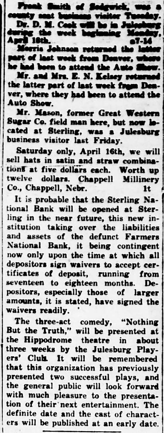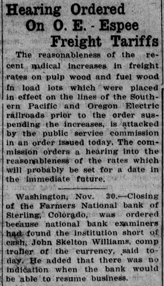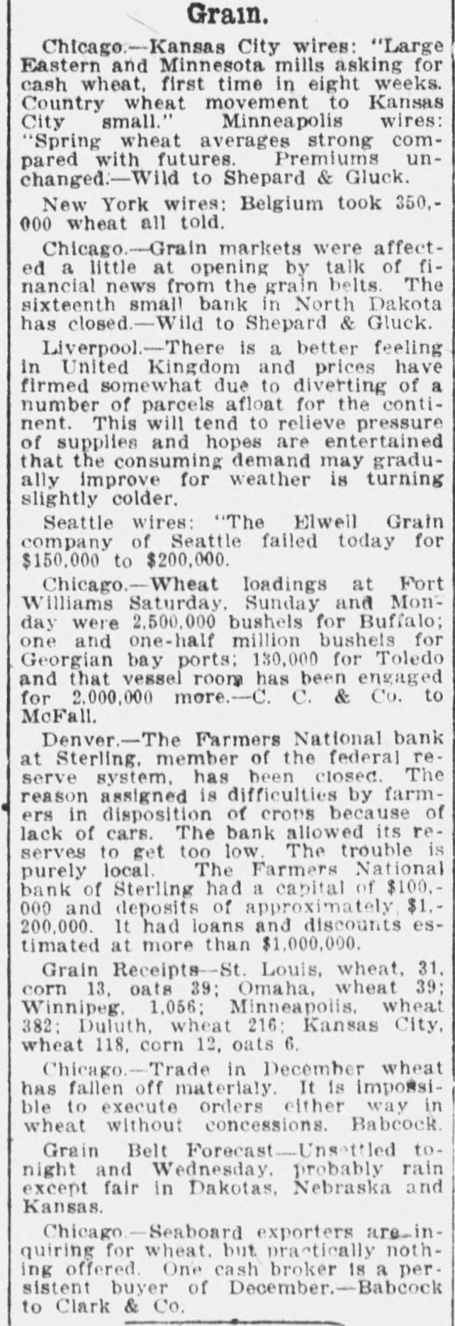 Grain. Chicage.-Kansas City wires: "Large Eastern and Minnesota mills asking for cash wheat, first time in eight weeks. Country wheat movement to Kansas City small." Minneapolis wires: "Spring wheat averages strong compared with futures. Premiums unchanged:-Wild to Shepard & Gluck. New York wires: Belgium took 350,000 wheat all told. Chicago.-Grain markets were affected a little at opening by talk of financial news from the grain belts. The sixteenth small bank in North Dakota has closed.-Wild to Shepard & Gluck. Liverpool.-There is a better feeling in United Kingdom and prices have firmed somewhat due to diverting of a number of parcels afloat for the continent. This will tend to relieve pressure of supplies and hopes are entertained that the consuming demand may gradually improve for weather is turning slightly colder. Seattle wires: "The Elwell Grain company of Seattle failed today for $150,000 to $200,000. Chicago.-Wheat loadings at Fort Williams Saturday, Sunday and Monday were 2,500,000 bushels for Buffalo; one and one-half million bushels for Georgian bay ports; 130,000 for Toledo and that vessel room has been engaged for 2,000,000 more.-C. C. & Co. to McFall. Denver-The Farmers National bank at Sterling. member of the federal reserve system. has been closed. The reason assigned is difficulties by farmers in disposition of crops because of lack of cars. The bank allowed its reserves to get too low. The trouble is purely local. The Farmers National bank of Sterling had a capital of $100.000 and deposits of approximately $1.200,000. It had loans and discounts estimated at more than $1,000,000. Grain Receipts-St. Louis, wheat, 31. corn 13, oats 39; Omaha, wheat 39; Winnipeg, 1,056; Minneapolis, wheat 382: Duluth, wheat 216: Kansas City, wheat 118, corn 12, oats 6. Chicago.-Trade in December wheat has fallen off materialy. It is impossible to execute orders either way in wheat without concessions. Babcock. Grain Belt Forecast-Unsettled tonight and Wednesday. probably rain except fair in Dakotas, Nebraska and Kansas. Chicago.-Seaboard exporters are-inquiring for wheat. but practically nothing offered. One cash broker is a persistent buyer of December.-Babcock to Clark & Co.