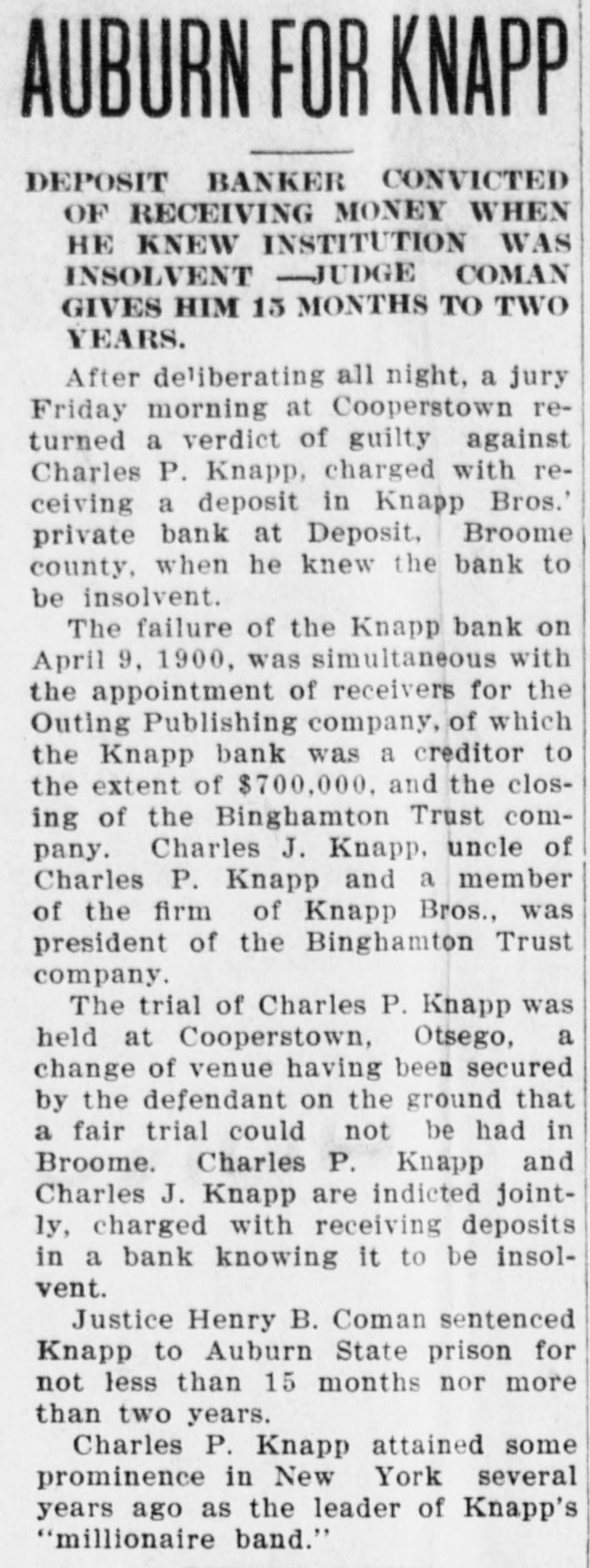 AUBURN FOR KNAPP DEPOSIT BANKER CONVICTED OF RECEIVING MONEY WHEN HE KNEW INSTITUTION WAS INSOLVENT -JUDGE COMAN GIVES HIM 13 MONTHS TO TWO YEARS. After deliberating all night, a jury Friday morning at Cooperstown returned a verdict of guilty against Charles P. Knapp, charged with receiving a deposit in Knapp Bros.' private bank at Deposit, Broome county, when he knew the bank to be insolvent. The failure of the Knapp bank on April 9. 1900, was simultaneous with the appointment of receivers for the Outing Publishing company, of which the Knapp bank was a creditor to the extent of $700,000. and the closing of the Binghamton Trust company. Charles J. Knapp. uncle of Charles P. Knapp and a member of the firm of Knapp Bros., was president of the Binghamton Trust company. The trial of Charles P. Knapp was held at Cooperstown, Otsego, a change of venue having been secured by the defendant on the ground that a fair trial could not be had in Broome. Charles P. Knapp and Charles J. Knapp are indicted jointly, charged with receiving deposits in a bank knowing it to be insolvent. Justice Henry B. Coman sentenced Knapp to Auburn State prison for not less than 15 months nor more than two years. Charles P. Knapp attained some prominence in New York several years ago as the leader of Knapp's "millionaire band."