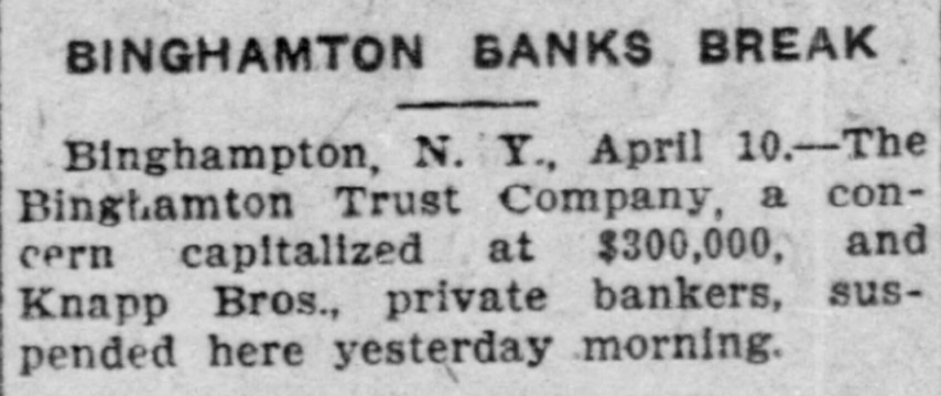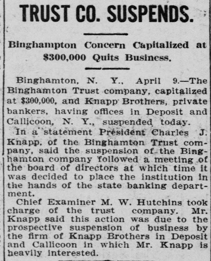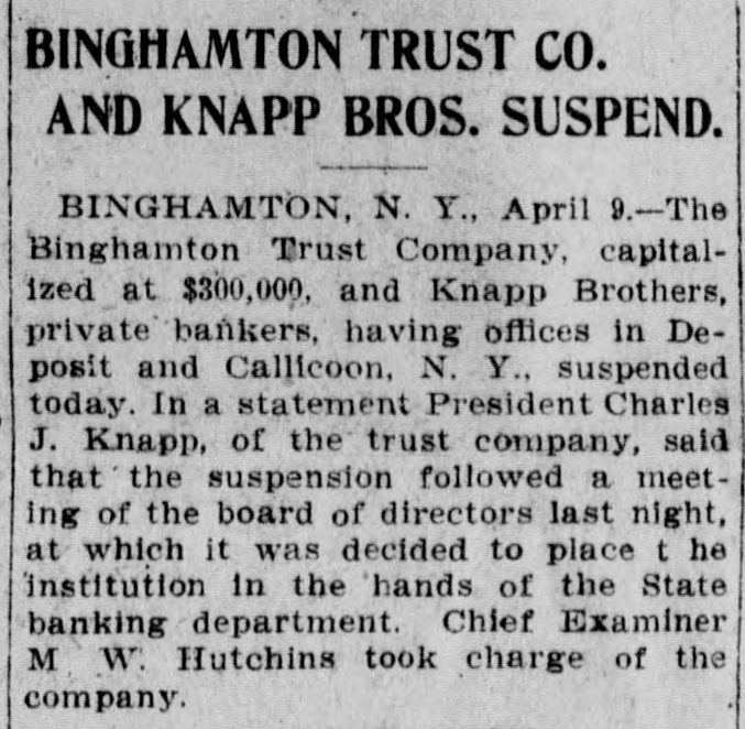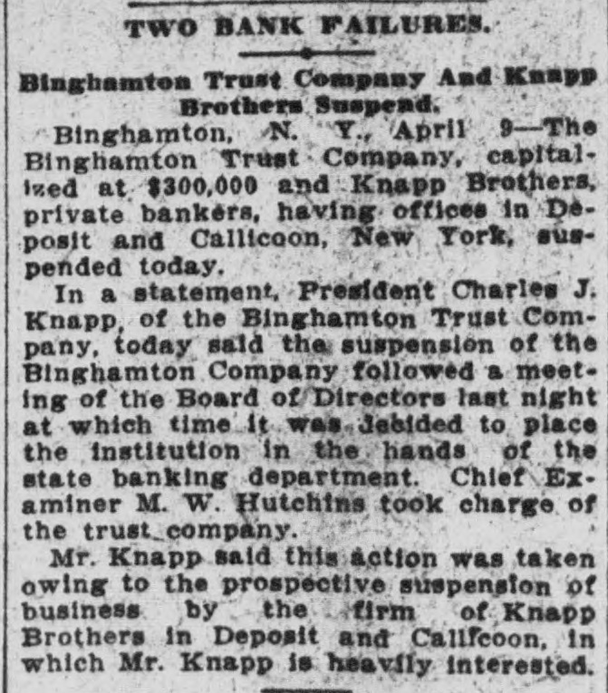 TWO BANK FAILURES. Binghamton Trust Company And Knapp Brothers Suspend. Binghamton, N. Y., April 9 -The Binghamton Trust Company, capitalIzed at $300,000 and Knapp Brothers, private bankers, having offices in Dèposit and Callicoon, New York, suspended today. In a statement, President Charles J. Knapp, of the Binghamton Trust Company, today said the suspension of the Binghamton Company followed a meeting of the Board of Directors last night at which time it was decided to place the institution in the hands of the state banking department. Chief Examiner M. W. Hutchins took charge of the trust company. Mr. Knapp said this action was taken owing to the prospective suspension of business by the firm of Knapp Brothers in Deposit and Callfoon, in which Mr. Knapp is heavily interested.