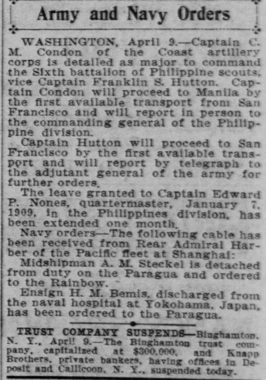 Army and Navy Orders WASHINGTON, April 9.-Captain €. M. Condon of the Coast artillery corps is detailed as major to command the Sixth battalion of Philippine scouts, vice Captain Franklin S. Hutton. Captain Condon will proceed to Manila by the first available transport from San Francisco and will report in person to the commanding general of the Philippine division. Captain Hutton will proceed to San Francisco by the first available transport and will report by telegraph to the adjutant general of the army for further orders. The leave granted to Captain Edward P. Nones, quartermaster, January 7. 1909, in the Philippines division, has been extended one month. Navy orders-The following cable has been received from Rear Admiral Harber of the Pacific fleet at Shanghai: Midshipman A. M. Steckel is detached from duty on the Paragua and ordered to the Rainbow. Ensign H. M. Bemis, discharged from the naval hospital at Yokohama, Japan, has been ordered to the Paragua. TRUST COMPANY SUSPENDS-Binghamton. N. Y., April 9.-The Binghamton trust company, capitalized at $300,000. and Knapp Brothers, private bankers, having offices in Deposit and Callicoon, N. Y., suspended today.
