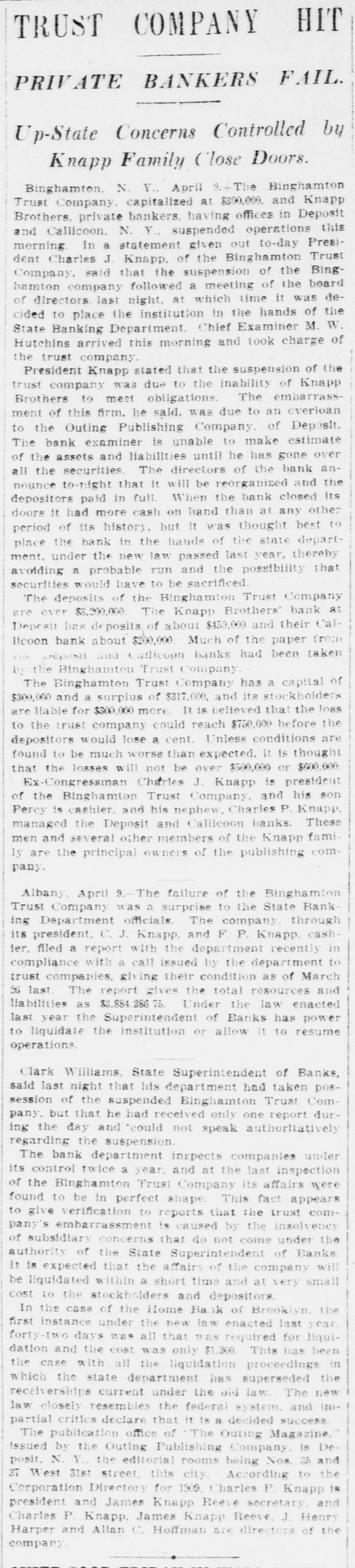 HIT TRUST COMPANY PRIVATE BANKERS FAIL. Up-State Concerns Controlled by Knapp Family Close Doors. Binghamten, N. Y.. April -The Binghamton Trust Company. capitalized at $800,000. and Knapp Brothers, private bankers. having offices in Deposit and Callicoon. N. ¥.. suspended operations this morning In a statement given out to-day President Charles J. Knapp. of the Binghamton Trust Company, said that the suspension of the Binghamton company followed a meeting of the board of directors last night. at which time it was decided to place the institution in the hands of the State Banking Department. Chief Examiner M. W. Hutchins arrived this morning and took charge of the trust company. President Knapp stated that the suspension of the trust company was due to the inability of Knapp Brothers to meet obligations. The embarrassment of this firm. he said, was due to an overloan to the Outing Publishing Company. of Deposit. The bank examiner is unable to make estimate of the assets and liabilities until he has gone over ali the securities The directors of the bank announce to-right that it will be reorganized and the depositors paid in full. When the bank closed its doors it had more cash on hand than at any other period of its history, but it was thought best to place the bank in the hands of the state department. under the new law passed last year. thereby avoiding a probable run and the possibility that securities would have to be sacrificed The deposits of the Binghamton Trust Company are over $3,200,000. The Knapp Brothers' bank at Deposit has deposits of about $430.000 and their Callicoon bank about $200,000. Much of the paper from the Dépobil and Callicon banks had been taken by the Binghamten Trust Company The Binghamten Trust Company has a capital of $300,000 and a surplus of $317,000. and its stockholders are llable for $300,000 more. It 18 believed that the loss to the trust company could reach $750,000 before the depositors would lose a cent. Unless conditions are found to be much worse than expected. it is thought that the losses will not be over $500,000 or $600.000 Ex-Congressman Charles J. Knapp is president of the Binghamton Trust Company, and his son Percy is cashier. and his nephew, Charles P. Knapp. managed the Deposit and Callicoon banks. These men and several other members of the Knapp fami1y are the principal owners of the publishing company. Albany, April 9. The failure of the Binghamton Trust Company was a surprise to the State Banking Department officials. The company through its president. C. J. Knapp. and F. P. Knapp. cashier. filed a report with the department recently in compliance with a call issued by the department to trust companies, giving their condition as of March 26 last The report gives the total resources and liabilities as $8,884,286 75. Under the law enacted last year the Superintendent of Banks has power to liquidate the institution or allow it to resume operations. Clark Williams State Superintendent of Banks, said last night that his department had taken possession of the suspended Binghamton Trust Company. but that he had received only one report during the day and *could not speak authoritatively regarding the suspension. The bank department inspects companies under its control twice a year. and at the last inspection of the Binghamton Trust Company its affairs were found to be in perfect shape This fact appears to give verification to reports that the trust company's embarrassment is caused by the insolvency of subsidiary concerns that do not come under the authority of the State Superintendent of Banks It is expected that the affairs of the company will be liquidated within a short time and at very small cost to the stockholders and depositors In the case of the Home Bank of Brooklyn. the first instance under the new law enacted last year. forty-two days was all that was required for liquidation and the cost was only $1,200. This has been the case with all the liquidation proceedings in which the state department has superseded the receiverships current under the aid law. The new law closely resembles the federal system. and impartial critics declare that it is a decided success The publication office of The Outing Magazine. issued by the Outing Publishing Company is Deposit. N. Y., the editorial rooms being Nos. 35 and 37 West 31st street this city. According to the Corporation Directory for 1909 Charles ₽. Knapp is president and James Knapp Reeve secretary and Charles P. Knapp. James Knapp Reeve J. Henry Harper and Allan C. Hoffman are directors of the company