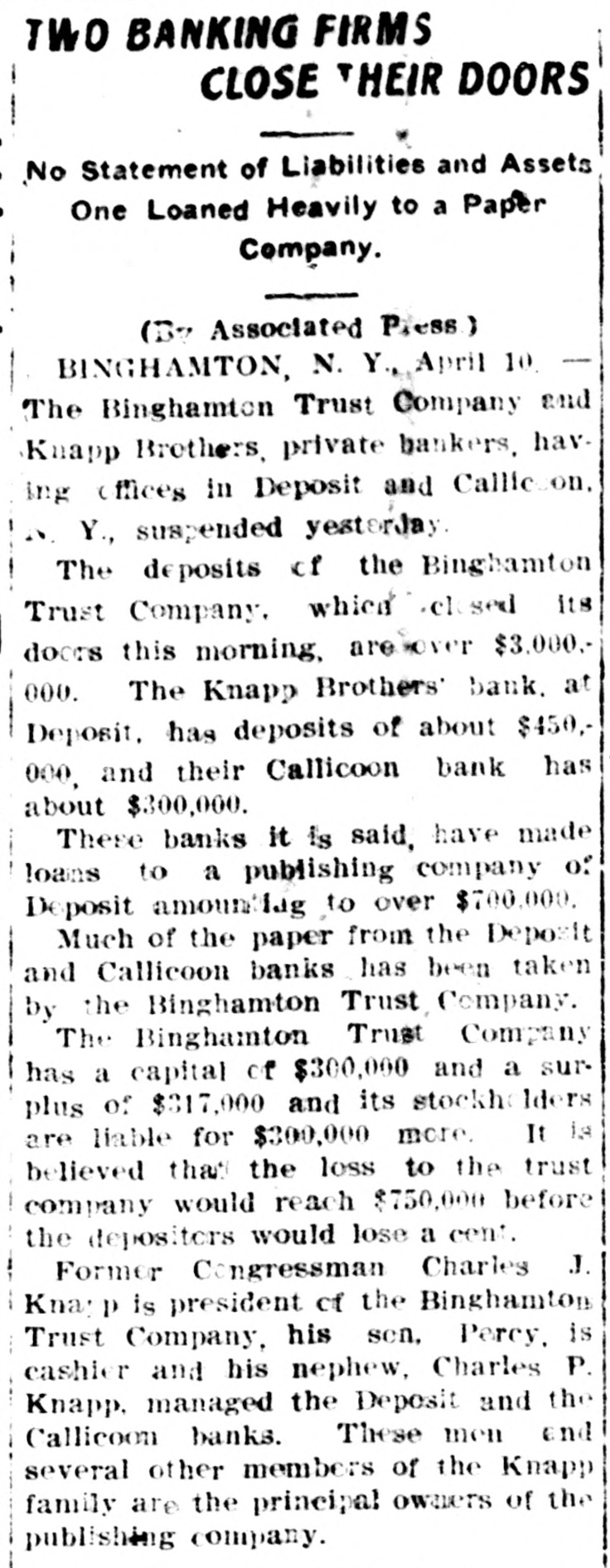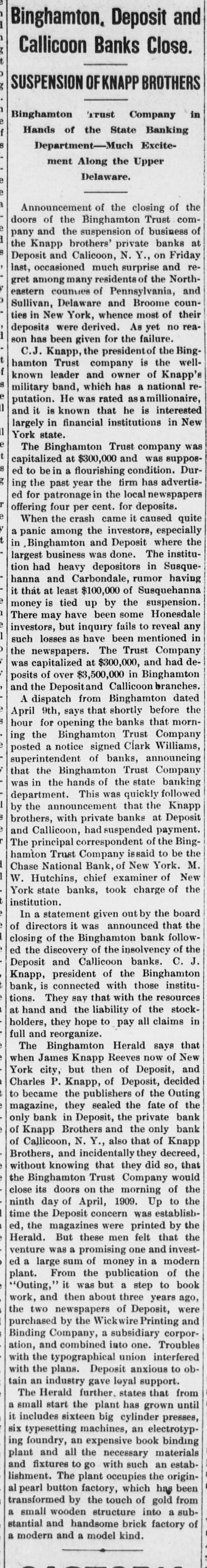 Binghamton, Deposit and Callicoon Banks Close. SUSPENSION OF KNAPP BROTHERS Binghamton Trust Company in Hands of the State Banking Department-Much Excitement Along the Upper Delaware. Announcement of the closing of the doors of the Binghamton Trust company and the suspension of business of the Knapp brothers' private banks at Deposit and Calicoon, N. Y., on Friday last, occasioned much surprise and regret among many residents of the Northeastern counues of Pennsylvania, and Sullivan, Delaware and Broome counties in New York, whence most of their deposits were derived. As yet no reason has been given for the failure. C.J. Knapp, the presidentof the Binghamton Trust company is the wellknown leader and owner of Knapp's military band, which has a national reputation. He was rated asamillionaire, and it is known that he is interested largely in financial institutions in New York state. The Binghamton Trust company was capitalized at $300,000 and was supposed to be in a flourishing condition. During the past year the firm has advertised for patronage in the local newspapers offering four per cent. for deposits. When the crash came it caused quite a panic among the investors, especially in Binghamton and Deposit where the largest business was done. The institution had heavy depositors in Susquehanna and Carbondale, rumor having it that at least $100,000 of Susquehanna money is tied up by the suspension. There may have been some Honesdale investors, but inquiry fails to reveal any such losses as have been mentioned in the newspapers. The Trust Company was capitalized at $300,000, and had deposits of over $3,500,000 in Binghamton and the Depositand Callicoon branches. A dispatch from Binghamton dated April 9th, says that shortly before the hour for opening the banks that morning the Binghamton Trust Company posted a notice signed Clark Williams, superintendent of banks, announcing that the Binghamton Trust Company was in the hands of the state banking department. This was quickly followed by the announcement that the Knapp brothers, with private banks at Deposit and Callicoon, had suspended payment. The principal correspondent of the Binghamton Trust Company issaid to be the Chase National Bank, of New York. M. W. Hutchins, chief examiner of New York state banks, took charge of the institution. In a statement given out by the board of directors it was announced that the closing of the Binghamton bank followed the discovery of the insolvency of the Deposit and Callicoon banks. C. J. Knapp, president of the Binghamton bank, is connected with those institutions. They say that with the resources at hand and the liability of the stockholders, they hope to pay all claims in full and reorganize. The Binghamton Herald says that when James Knapp Reeves now of New York city, but then of Deposit, and Charles P. Knapp, of Deposit, decided to became the publishers of the Outing magazine, they sealed the fate of the only bank in Deposit, the private bank of Knapp Brothers and the only bank of Callicoon, N. Y., also that of Knapp Brothers. and incidentally thev decreed,