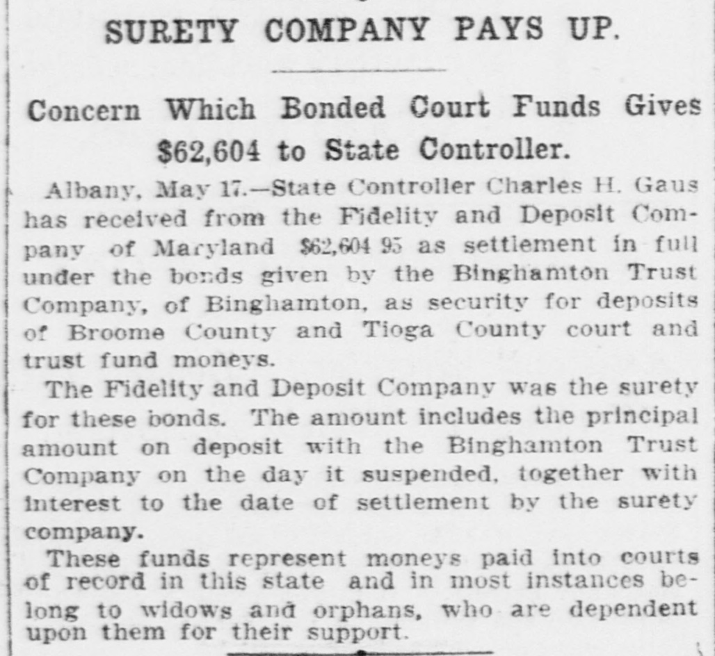 SURETY COMPANY PAYS UP. Concern Which Bonded Court Funds Gives $62,604 to State Controller. Albany, May 17.-State Controller Charles H. Gaus has received from the Fidelity and Deposit Company of Maryland $62,604 95 as settlement in full under the bonds given by the Binghamton Trust Company, of Binghamton, as security for deposits of Broome County and Tioga County court and trust fund moneys. The Fidelity and Deposit Company was the surety for these bonds. The amount includes the principal amount on deposit with the Binghamton Trust Company on the day it suspended, together with interest to the date of settlement by the surety company. These funds represent moneys paid into courts of record in this state and in most instances belong to widows and orphans, who are dependent upon them for their support.
