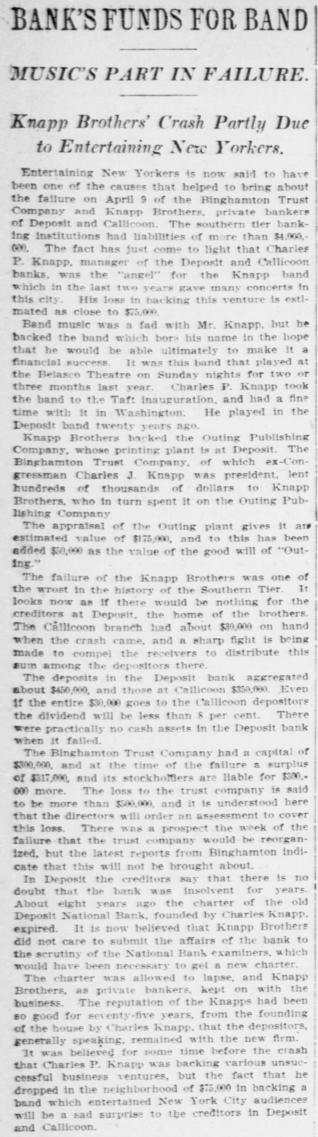 BANK'S FUNDS FOR BAND MUSIC'S PART IN FAILURE. Knapp Brothers' Crash Partly Due to Entertaining New Yorkers. Entertaining New Yorkers is now said to have been one of the causes that helped to bring about the failure on April 9 of the Binghamton Trust Company and Knapp Brothers, private bankers of Deposit and Callicoon. The southern tier banking institutions had liabilities of more than $4,000,000. The fact has just come to light that Charles P. Knapp, manager of the Deposit and Callicoon banks. was the "angel" for the Knapp band which in the last two years gave many concerts in this city. His loss in backing this venture is estimated as close to $75,000. Band music was a fad with Mr. Knapp, but he backed the band which bore his name in the hope that he would be able ultimately to make it a financial success. It was this band that played at the Belasco Theatre on Sunday nights for two or three months last year. Charles P. Knapp took the band to the Taf: inauguration. and had a fino time with it in Washington. He played in the Deposit band twenty years ago. Knapp Brothers backed the Outing Publishing Company, whose printing plant is at Deposit. The Binghamton Trust Company, of which ex-Congressman Charles J. Knapp was president, lent hundreds of thousands of dollars to Knapp Brothers, who in turn spent it on the Outing Publishing Company The appraisal of the Outing plant gives it an estimated value of $175,000, and to this has been added $50,000 as the value of the good will of "Outing." The failure of the Knapp Brothers was one of the wrost in the history of the Southern Tier. It looks now as If there would be nothing for the creditors at Deposit, the home of the brothers. The Callicoon branch had about $30,000 on hand when the crash came, and a sharp fight is being made to compel the receivers to distribute this sum among the depositors there. The deposits in the Deposit bank aggregated about $450,000. and those at Callicoon $350,000. Even if the entire $30,000 goes to the Callicoon depositors the dividend will be less than 8 per cent. There were practically no cash assets in the Deposit bank when it failed. The Binghamton Trust Company had a capital of $300,000, and at the time of the failure a surplus of $317,000. and its stockholders are liable for $300.000 more. The loss to the trust company is said to be more than $500,000, and it is understood here that the directors will order an assessment to cover this loss. There was a prospect the week of the failure-that the trust company would-be reorganized, but the latest reports from Binghamton indicate that this will not be brought about. In Deposit the creditors say that there is no doubt that the bank was insolvent for years. About eight years ago the charter of the old Deposit National Bank, founded by Charles Knapp. expired. It is now believed that Knapp Brothers did not care to submit the affairs of the bank to the scrutiny of the National Bank examiners, which would have been necessary to get a new charter. The charter was allowed to lapse, and Knapp Brothers, as private bankers, kept on with the business. The reputation of the Knapps had been so good for seventy-five years, from the founding of the house by Charles Knapp. that the depositors, generally speaking, remained with the new firm. It was believed for some time before the crash that Charles P. Knapp was backing various unsuecessful business ventures, but the fact that he dropped in the neighborhood of $75,000 in backing a band which entertained New York City audiences will be a sad surprise to the creditors in Deposit and Callicoon.